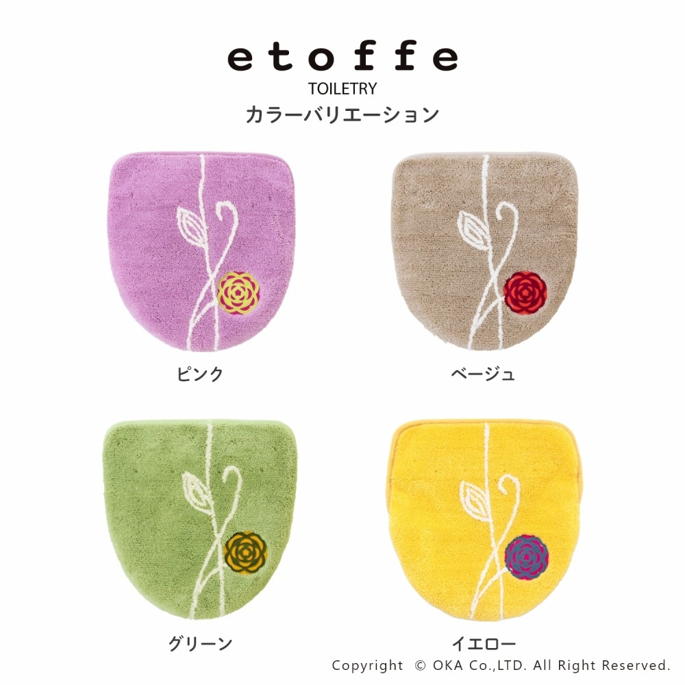 「エトフ」トイレタリシリーズの2点セット。あたたかく、心地よく、自宅で過ごす時間がほんの少し、素敵になりそうなゆったりとした雰囲気。シンプルなマットに、のびやかな植物のツルお花をかたどったブローチのようなアップリケ。ナチュラルなモチーフをほんの少しモダンにデザインしました。マットは毛足は短め、目のつまったしっかりした踏み心地になっています。ゆったりと伸びたツルや葉はポリエステルとふんわりとしたやわらかな素材を使い、 細部までのこだわりが感じられます。 カラーは毎日にそっと彩りを添える、ピンクとベージュとグリーン、新たにイエローが追加された4色です。
