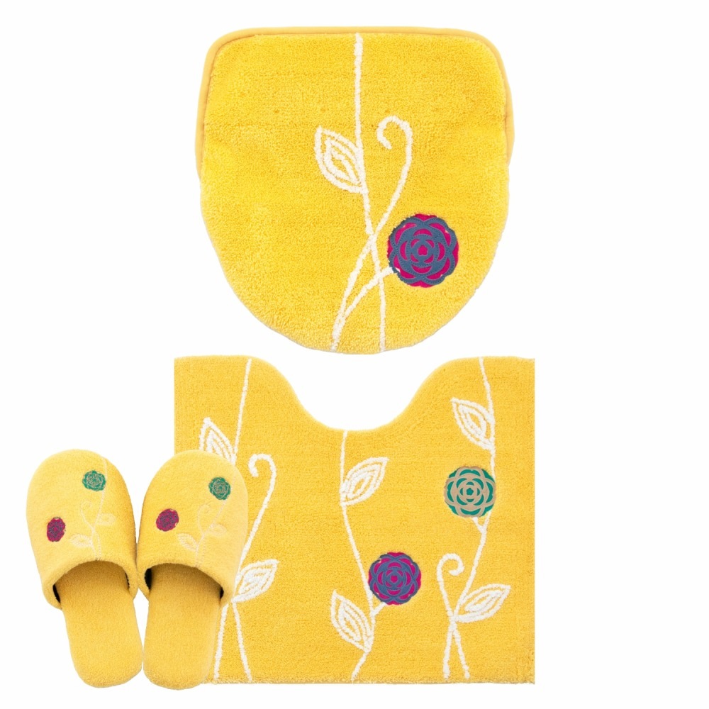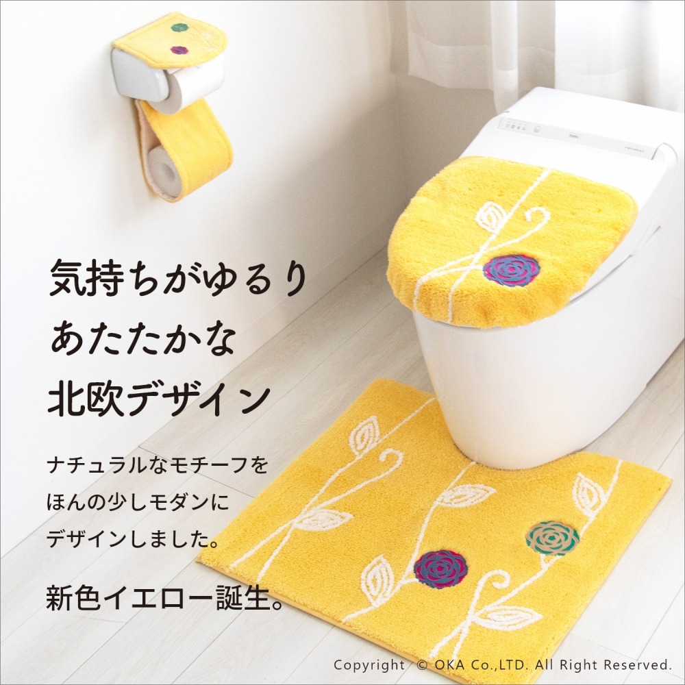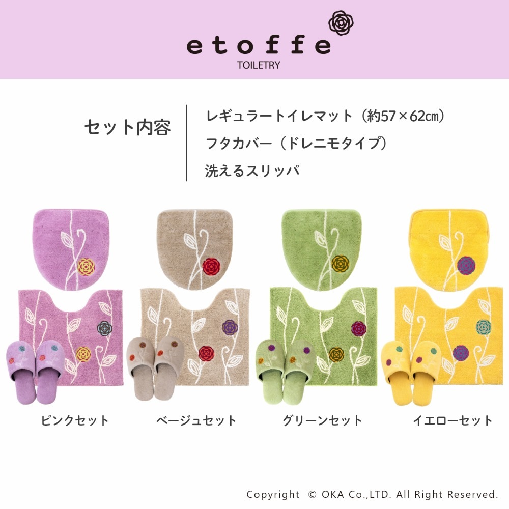 「エトフ」トイレタリシリーズの3点セット。あたたかく、心地よく、自宅で過ごす時間がほんの少し、素敵になりそうなゆったりとした雰囲気。シンプルなマットに、のびやかな植物のツルお花をかたどったブローチのようなアップリケ。ナチュラルなモチーフをほんの少しモダンにデザインしました。マットは毛足は短め、目のつまったしっかりした踏み心地になっています。ゆったりと伸びたツルや葉はふんわりとしたやわらかな素材を使い、細部までのこだわりが感じられます。 カラーは毎日にそっと彩りを添える、ピンクとベージュとグリーン、新たにイエローが追加された4色です。