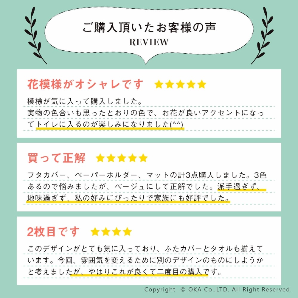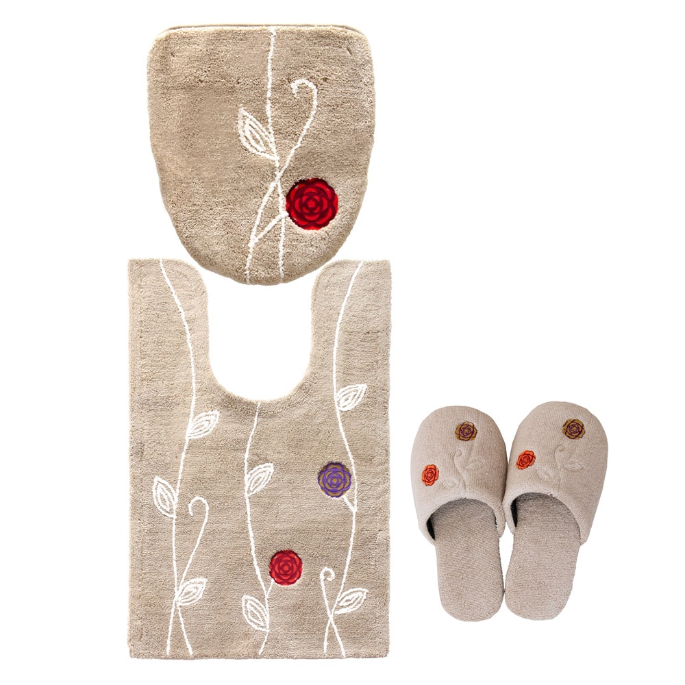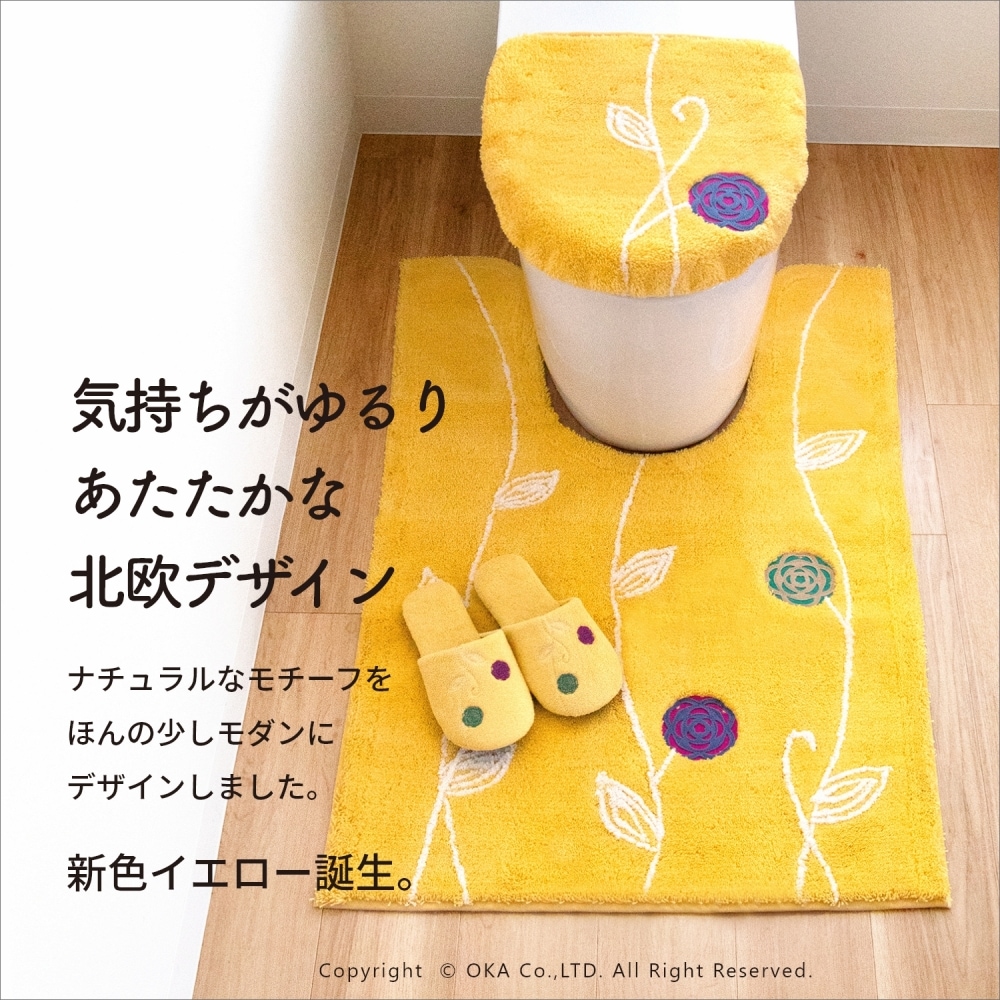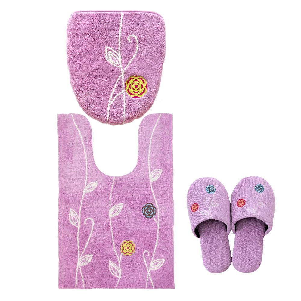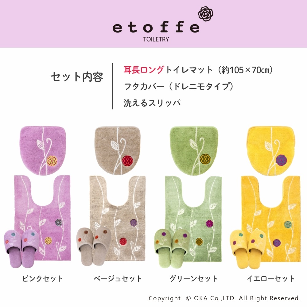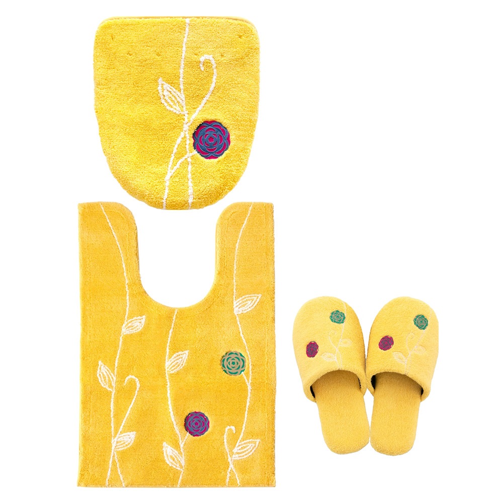 「エトフ」トイレタリシリーズの3点セット。あたたかく、心地よく、自宅で過ごす時間がほんの少し、素敵になりそうなゆったりとした雰囲気。シンプルなマットに、のびやかな植物のツルお花をかたどったブローチのようなアップリケ。ナチュラルなモチーフをほんの少しモダンにデザインしました。マットは毛足は短め、目のつまったしっかりした踏み心地になっています。ゆったりと伸びたツルや葉はふんわりとしたやわらかな素材を使い、細部までのこだわりが感じられます。 カラーは毎日にそっと彩りを添える、ピンクとベージュとグリーン、新たにイエローが追加された4色です。