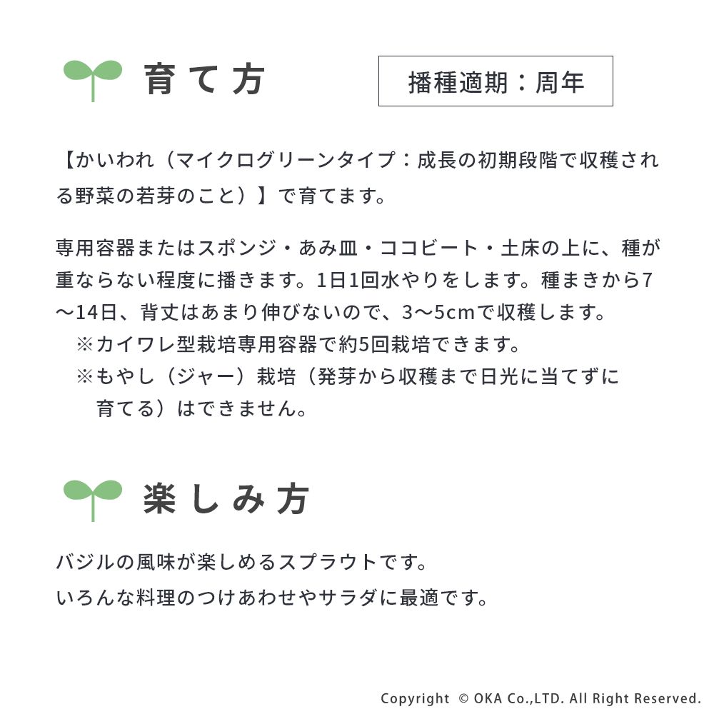 バジルの風味がしっかり楽しめる背丈の低いスプラウトです。種まきから7~14日ほどで収穫開始できます。室内で気軽に栽培を楽しめます。