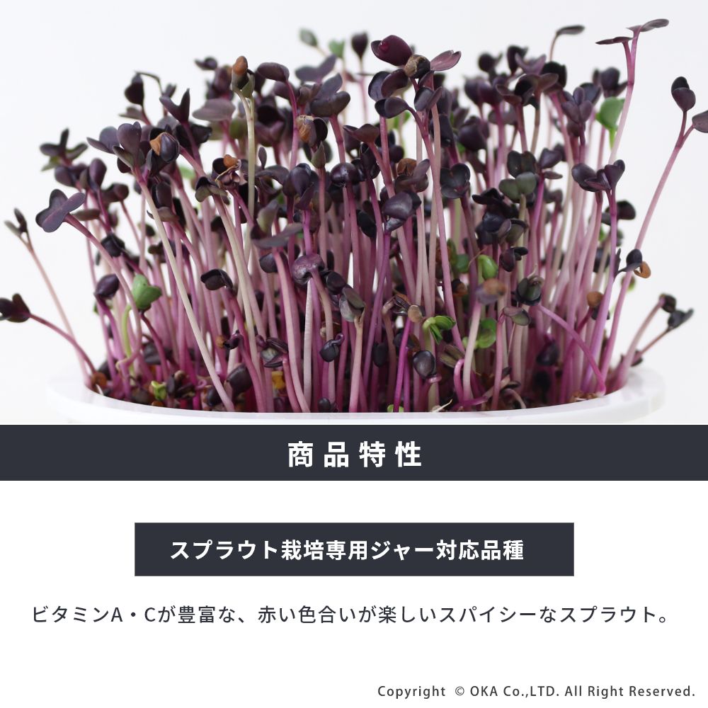 ビタミンA・Cが豊富な、赤い色合いが楽しいスパイシーなスプラウトです。種まきから3~14日ほどで収穫開始できます。室内で気軽に栽培を楽しめます。