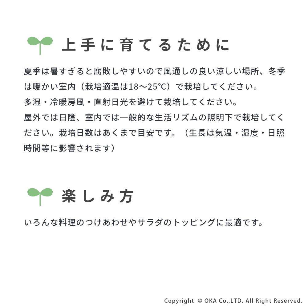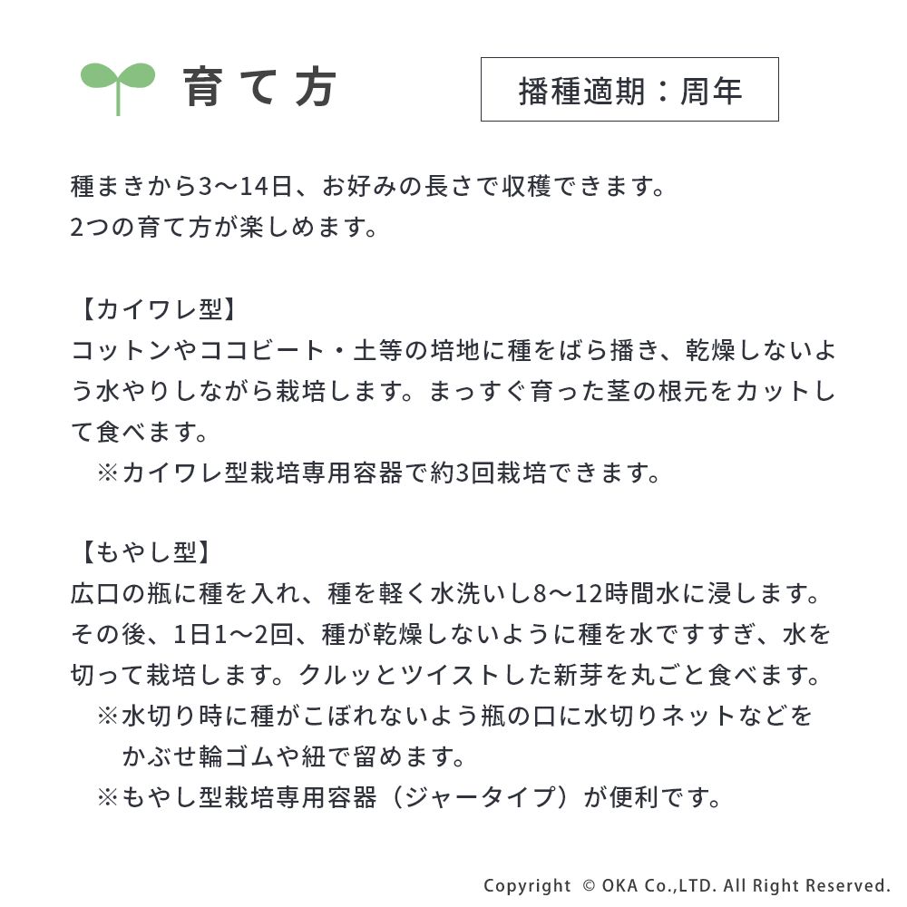 播種適期は周年で一年中収穫をお楽しみいただけます。また、【カイワレ型】の育て方で収穫ができます。カイワレ型で便利なスプラウト栽培専用のPLYS ベジマジ そだてるなら定期的な水替えなどが簡単にできて、楽しく栽培ができます。
