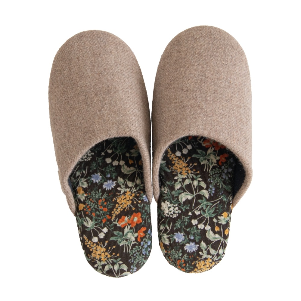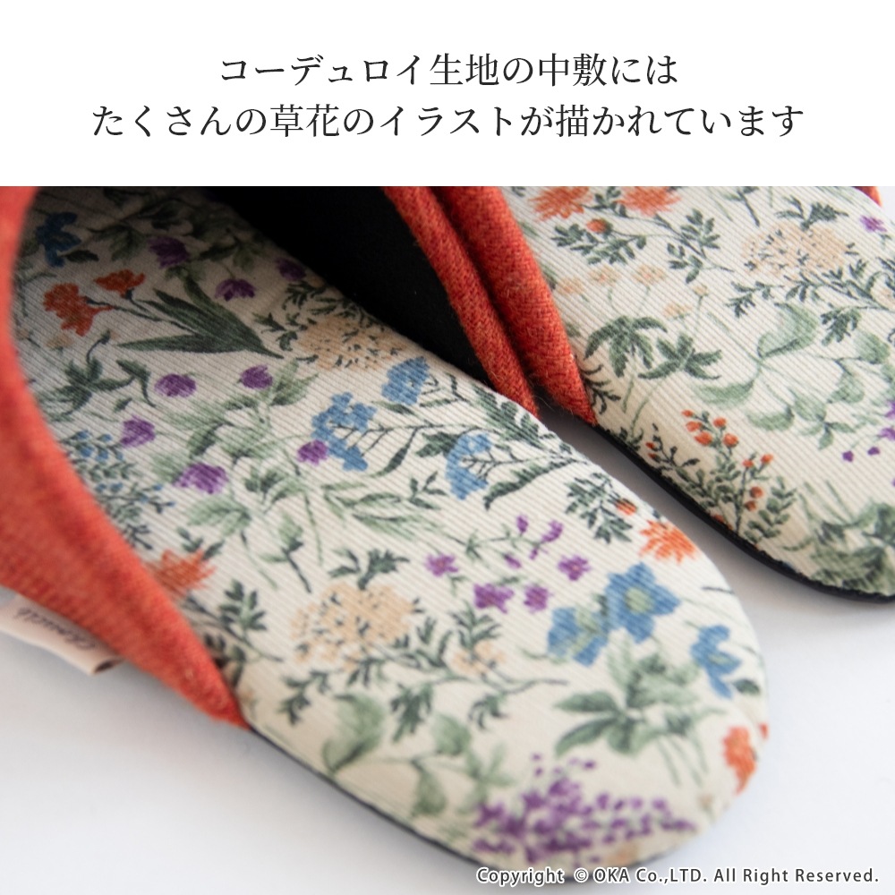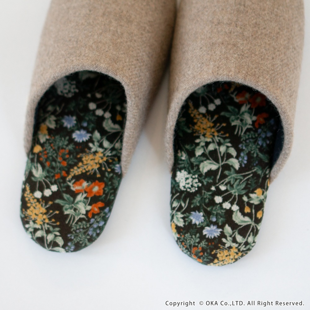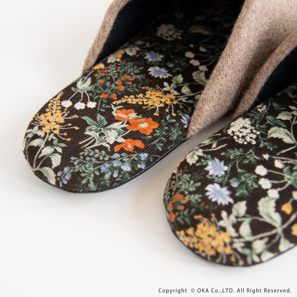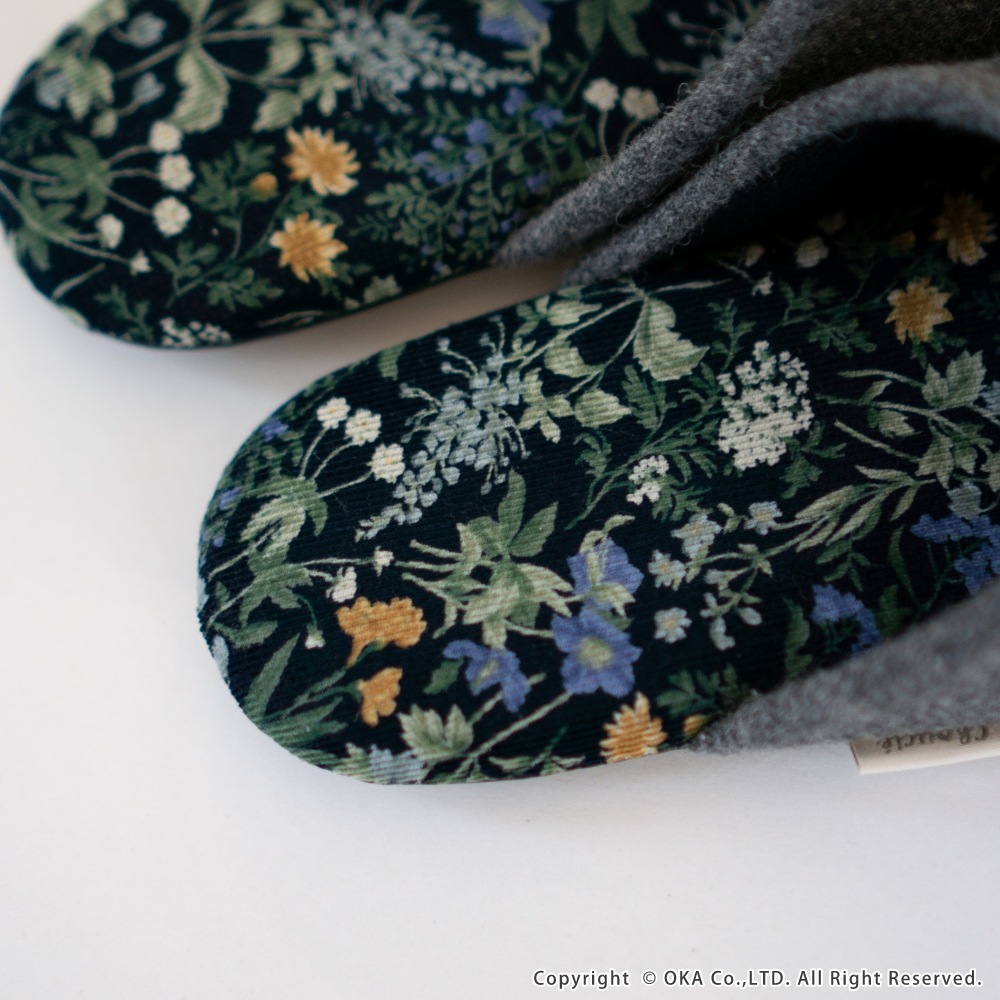 日本製の丁寧な縫製仕上げで、スリムなフォルムが足元をスッキリと見せてくれます。中敷にはコーデュロイ生地を使用、草花のイラストが生地いっぱいに描かれたシンプルながらも華やかな一足です。甲にはウールを使った生地を使いあたたかな印象になっています。