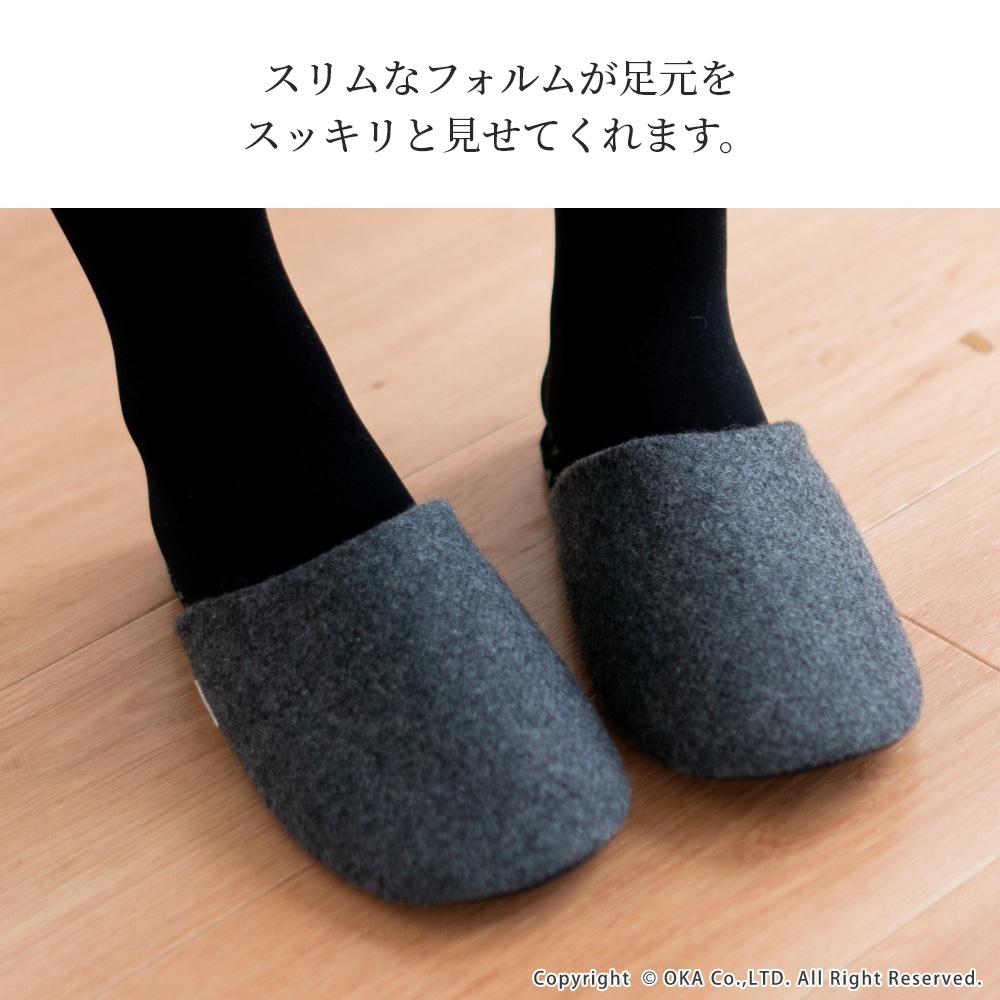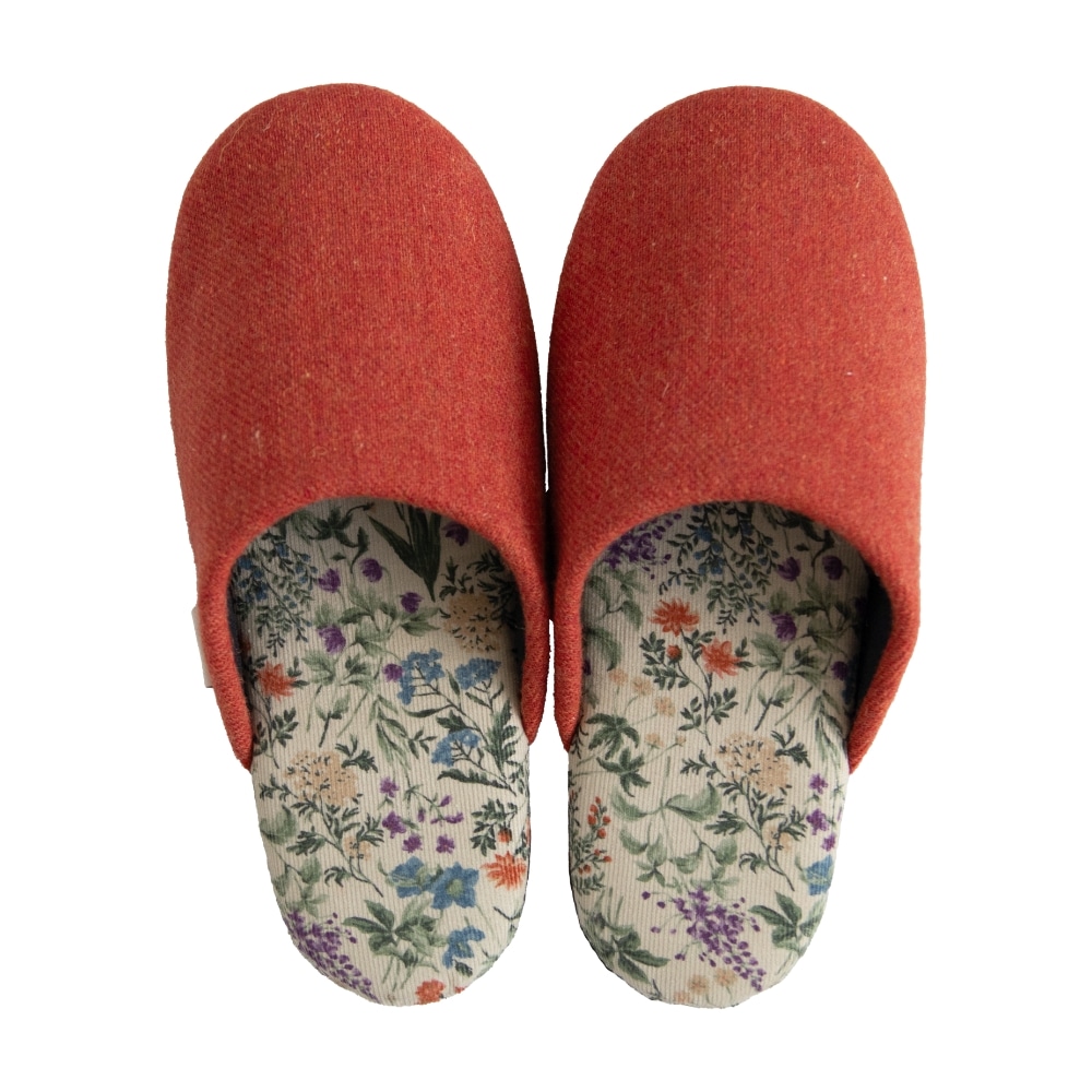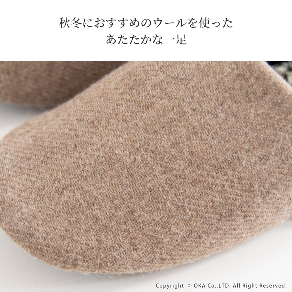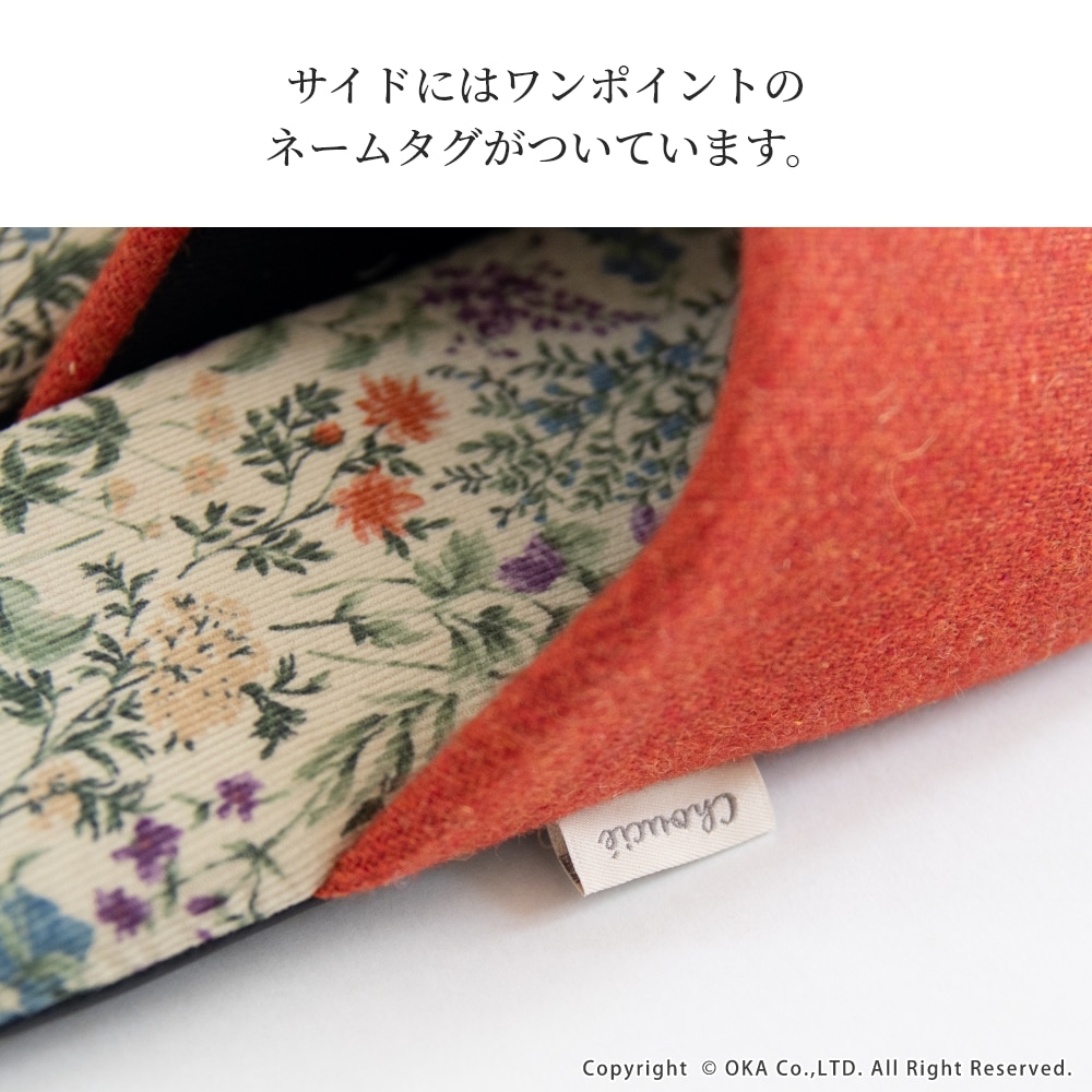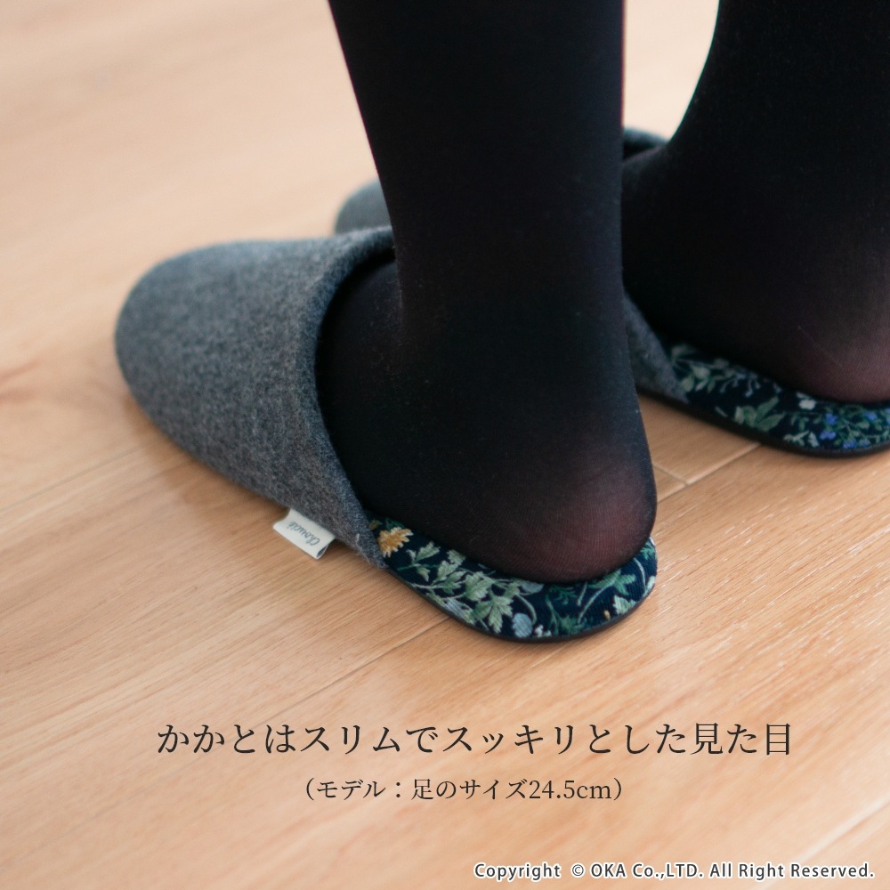 日本製の丁寧な縫製仕上げで、スリムなフォルムが足元をスッキリと見せてくれます。中敷にはコーデュロイ生地を使用、草花のイラストが生地いっぱいに描かれたシンプルながらも華やかな一足です。甲にはウールを使った生地を使いあたたかな印象になっています。