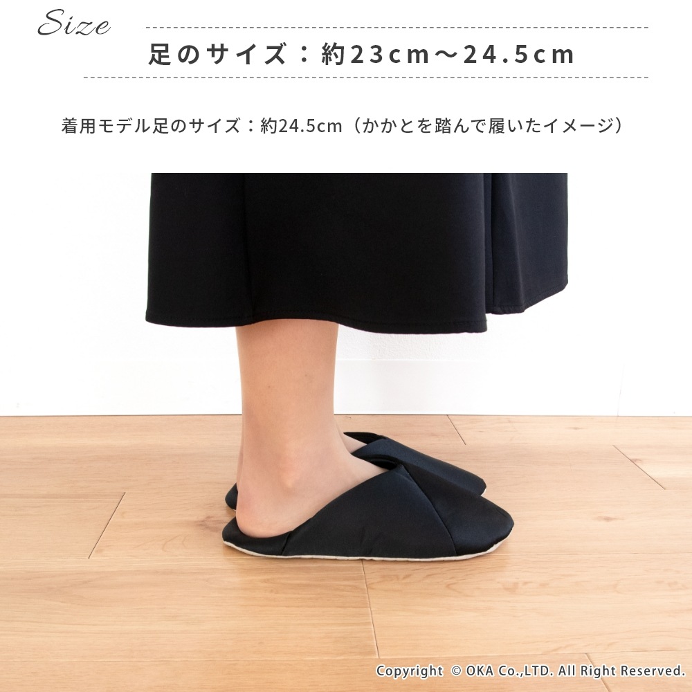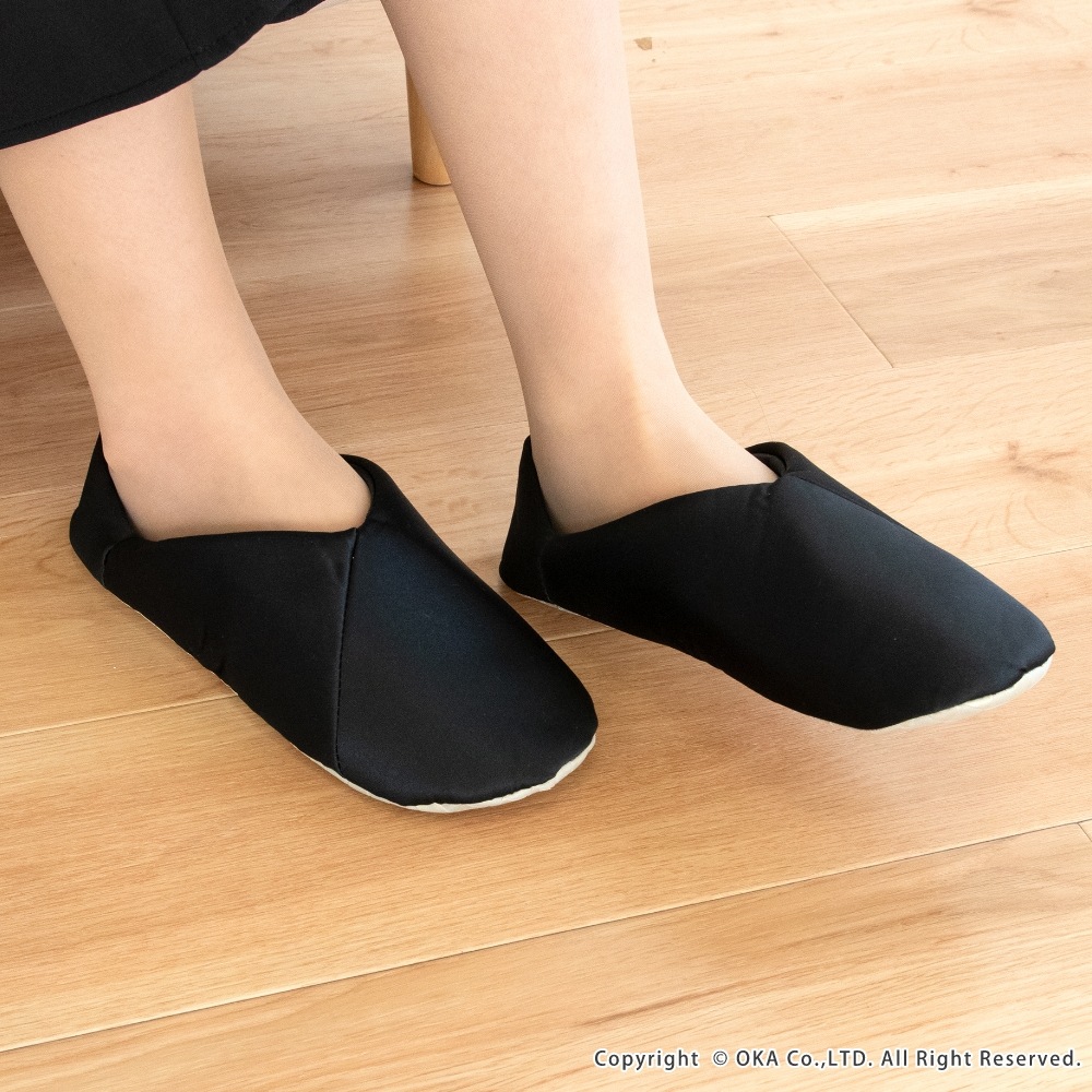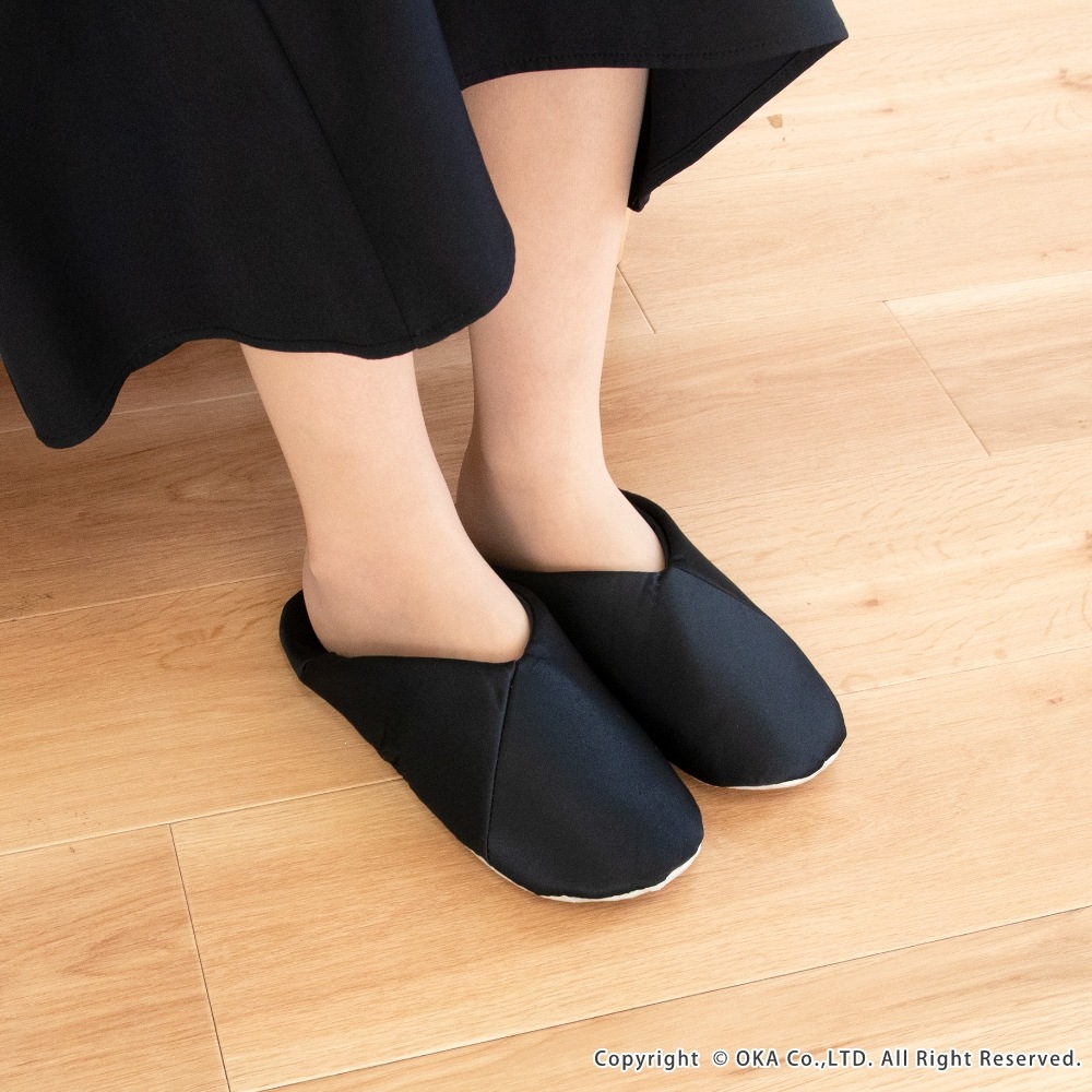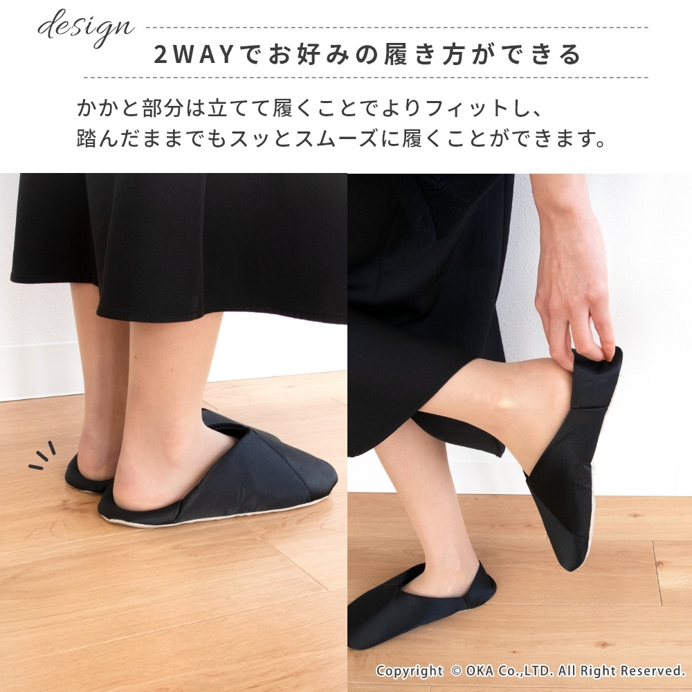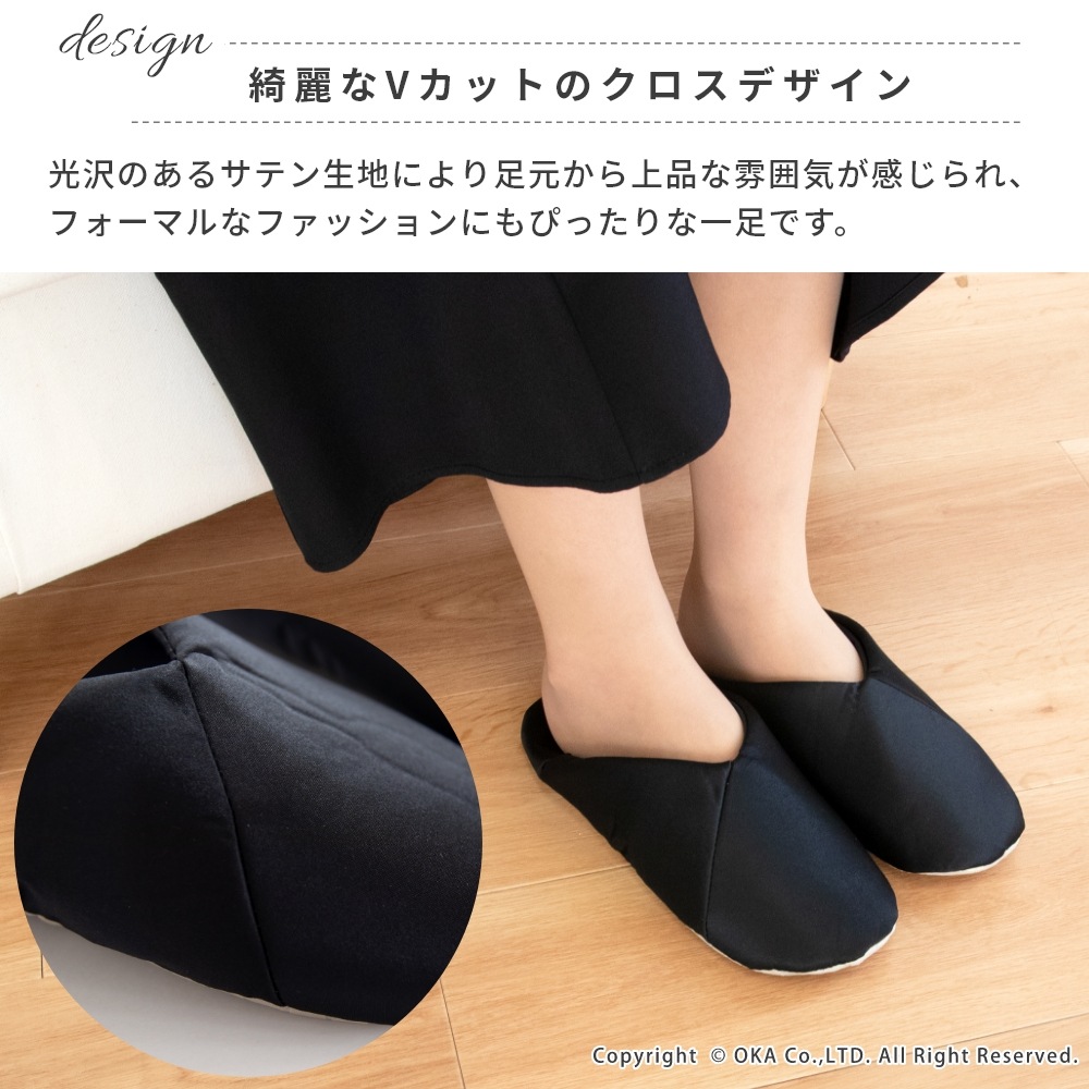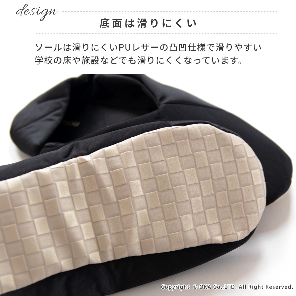 折りたたんでポーチにサッと収納、トートバッグにコンパクトに入れられます。習い事をする女性に、施設で上履きが必要な場面などのカジュアルなファッションスタイルにも合う一足です。V字デザインでさらさらなサテン生地により、上品で洗練された印象がお洒落でスーツやドレスはもちろん似合います。かかと部分は踏んだまま履いても、立てたままでもお好みで2WAYの履き方ができて、底面はツルツルな体育館の床でも滑りにくい仕様で機能性にも優れています。