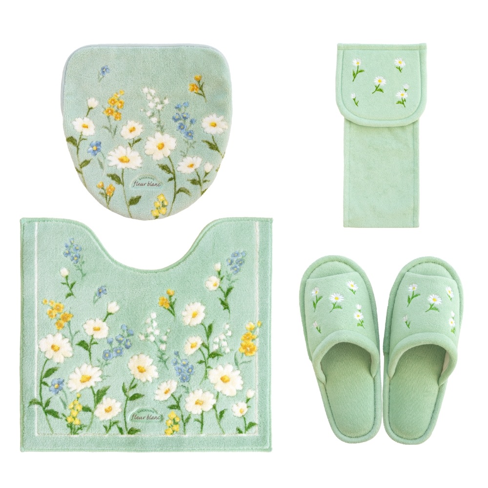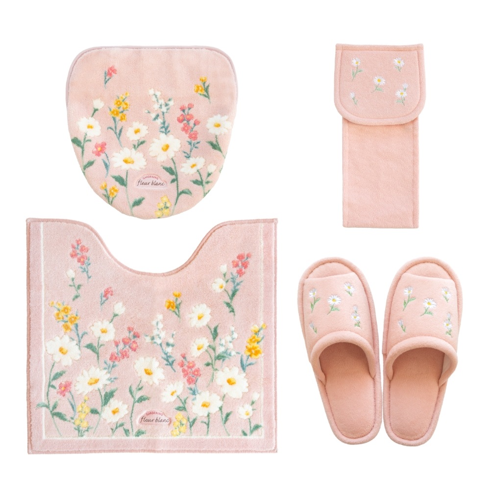 「フルールブラン」トイレタリシリーズの4点セット。マーガレットをメインに一面に小花が咲くことで、さりげないけどかわいらしいデザインに仕上がっています。 いつでも春のようなパッと華やかな暖かさの感じられます。トイレマット、フタカバー、スリッパ、ホルダーカバー(成型部品は外してください)は全て洗濯ネットに入れて丸洗い可能です。ベースカラーは少しくすみあるピンクとグリーンで落ち着きある優しい色合いで、心がホッとするトイレ空間にしてくれます。