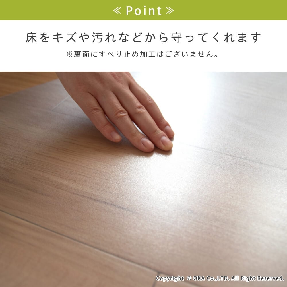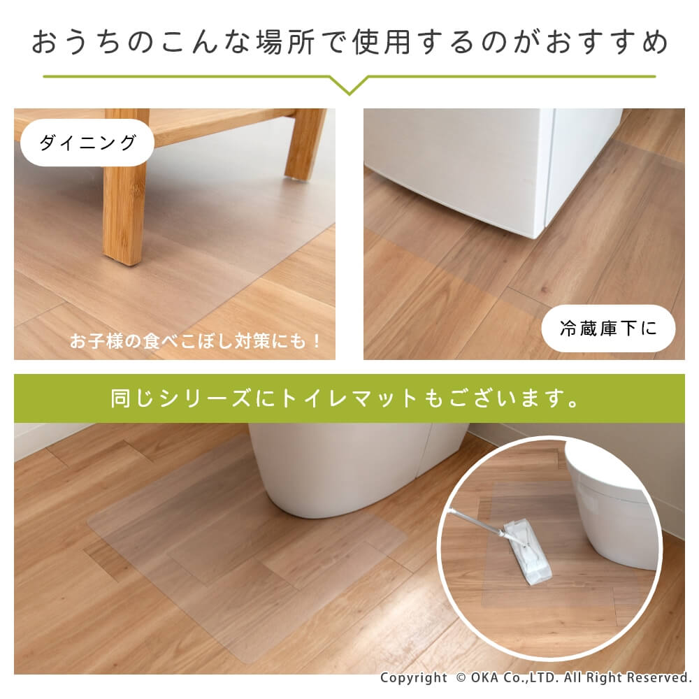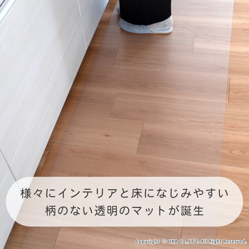 洗濯いらずで、汚れた時にさっと拭くだけ!お手入れが簡単なところが嬉しい拭けるマットに透明が誕生しました。どんなインテリアにも合わせやすい透明だからこそ、水はねで床が傷むのを防ぎたい!でも、おうちの床の木目や色味がお気に入りでインテリアの雰囲気を壊したくないというこだわりがある方にもおすすめ!水や汚れを弾きやすい素材で、床をキズや水はねによる水滴、汚れから守ってくれます。床暖房の上でも使用可能です◎(※ただし、床暖房の長時間の連続使用や高温でのご使用は避けてください。)薄手なのでお好みの長さにカットして、ぴったりフィットさせることもできます。※イメージ画像の一部は、環境によっては白く映ってみえる可能性がございますのでご了承くださいませ。