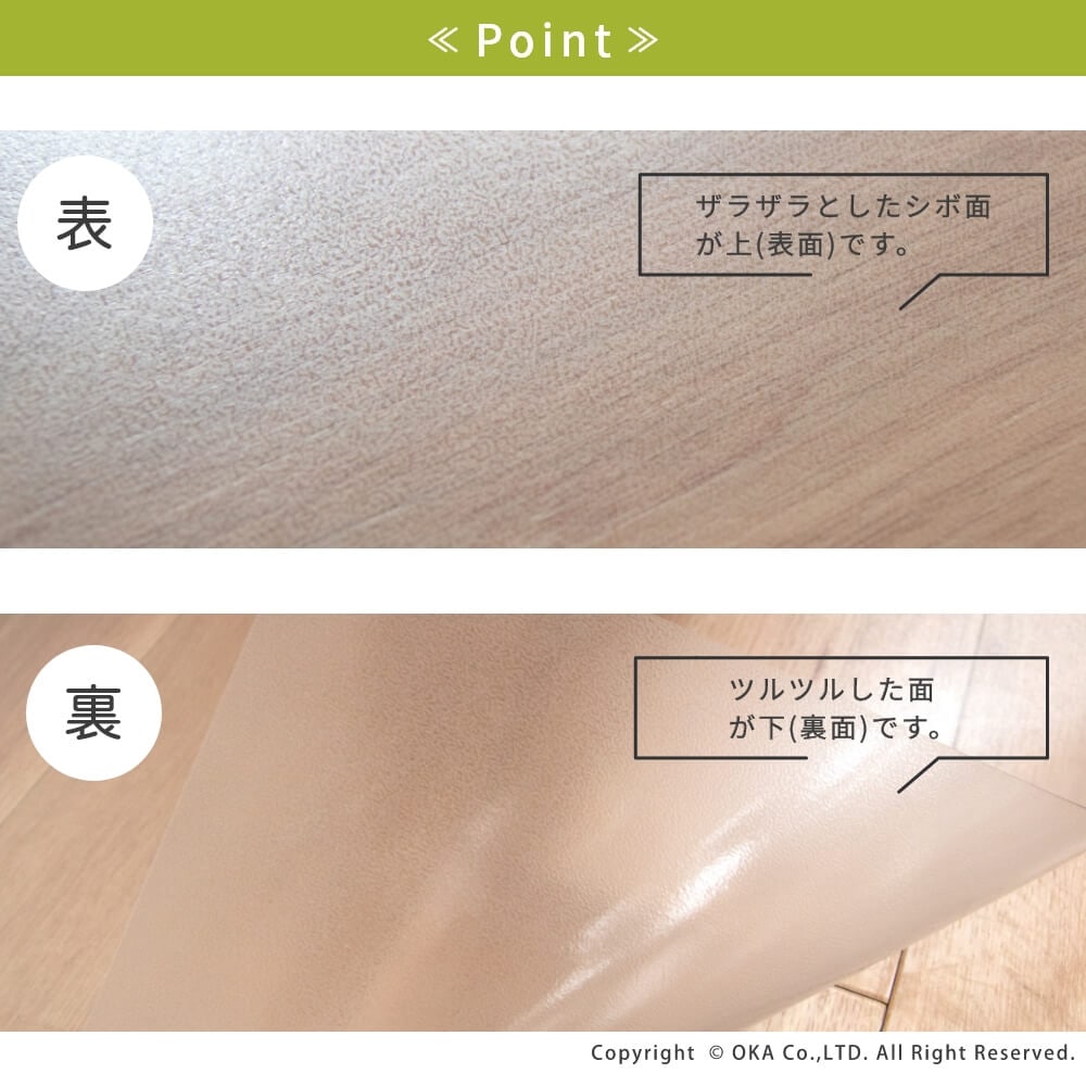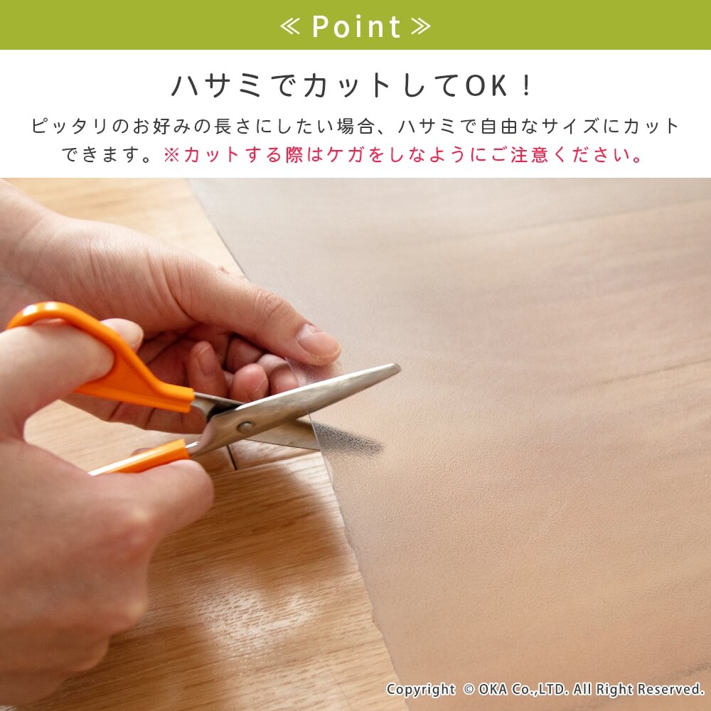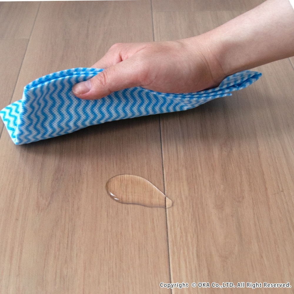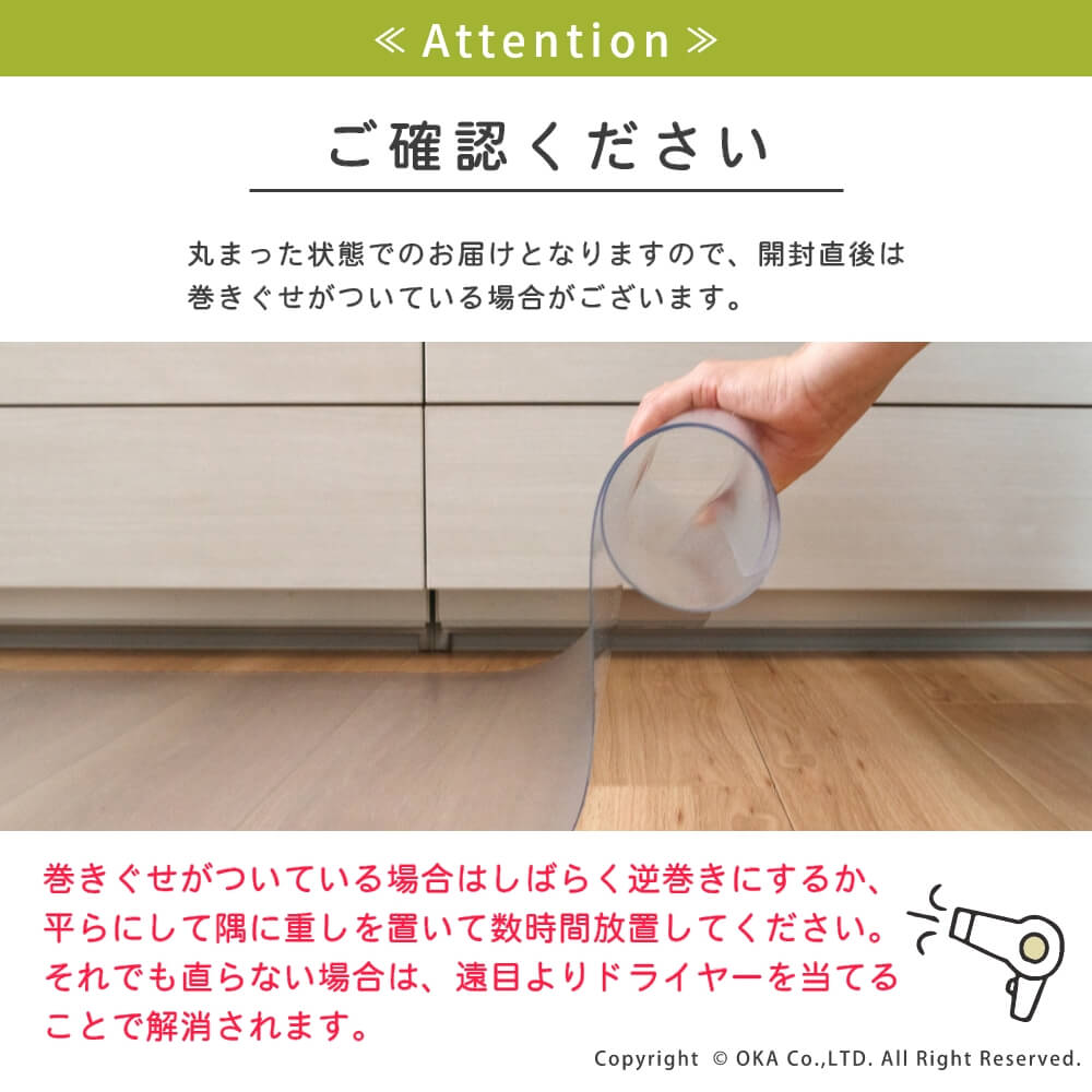 洗濯いらずで、汚れた時にさっと拭くだけ!お手入れが簡単なところが嬉しい拭けるマットに透明が誕生しました。どんなインテリアにも合わせやすい透明だからこそ、水はねで床が傷むのを防ぎたい!でも、おうちの床の木目や色味がお気に入りでインテリアの雰囲気を壊したくないというこだわりがある方にもおすすめ!水や汚れを弾きやすい素材で、床をキズや水はねによる水滴、汚れから守ってくれます。床暖房の上でも使用可能です◎(※ただし、床暖房の長時間の連続使用や高温でのご使用は避けてください。)薄手なのでお好みの長さにカットして、ぴったりフィットさせることもできます。※イメージ画像の一部は、環境によっては白く映ってみえる可能性がございますのでご了承くださいませ。