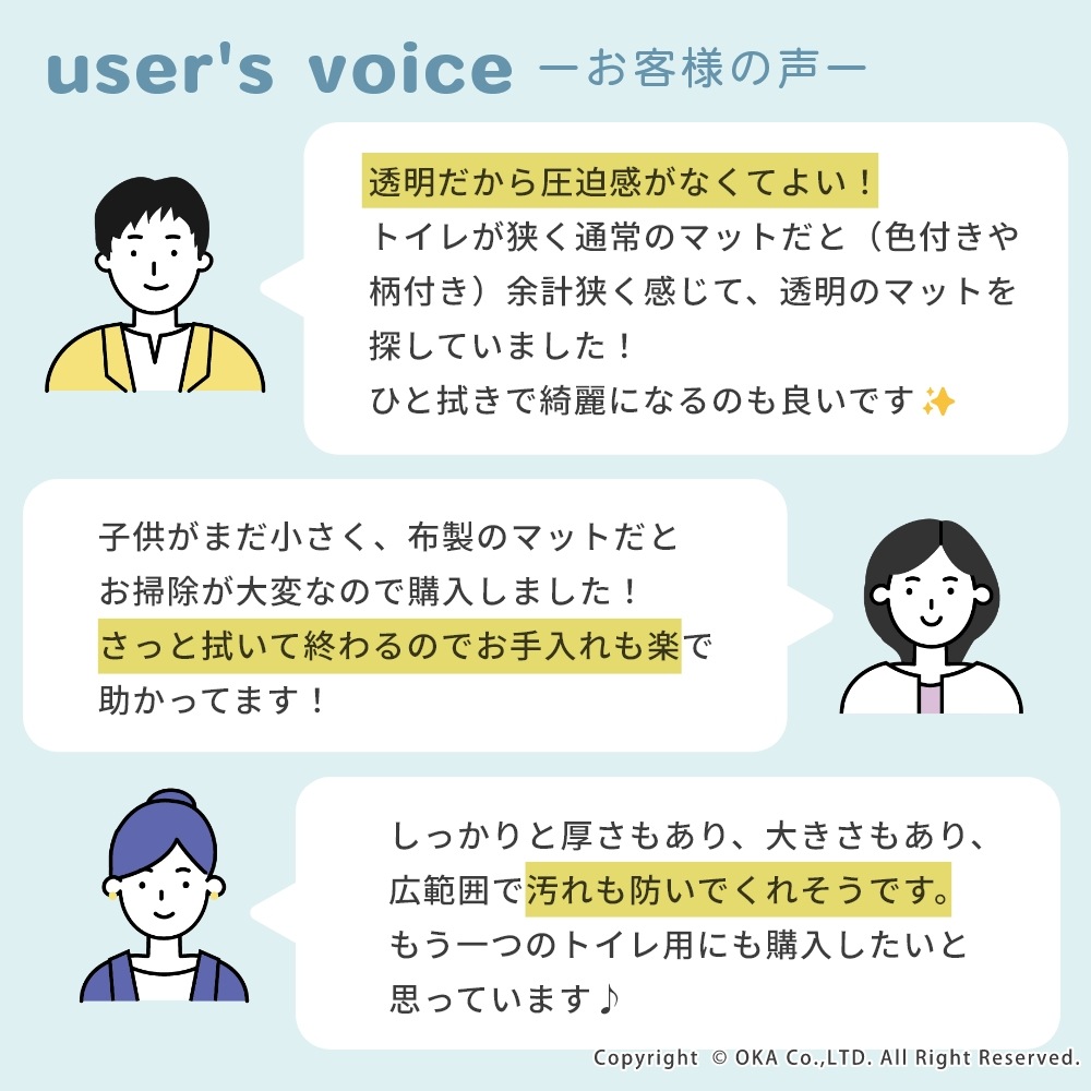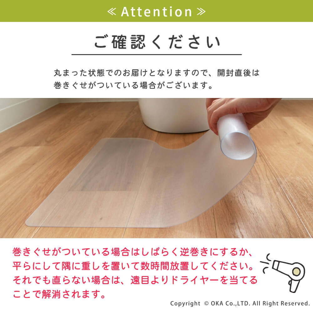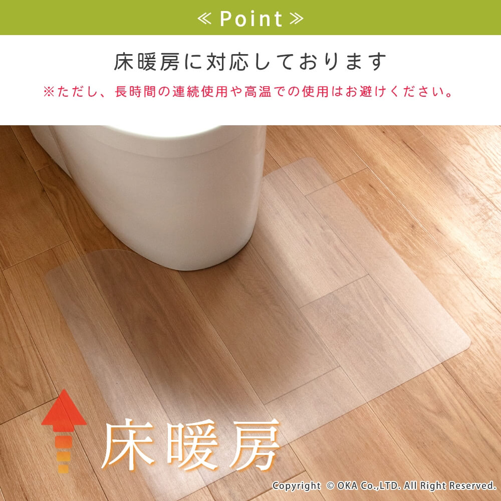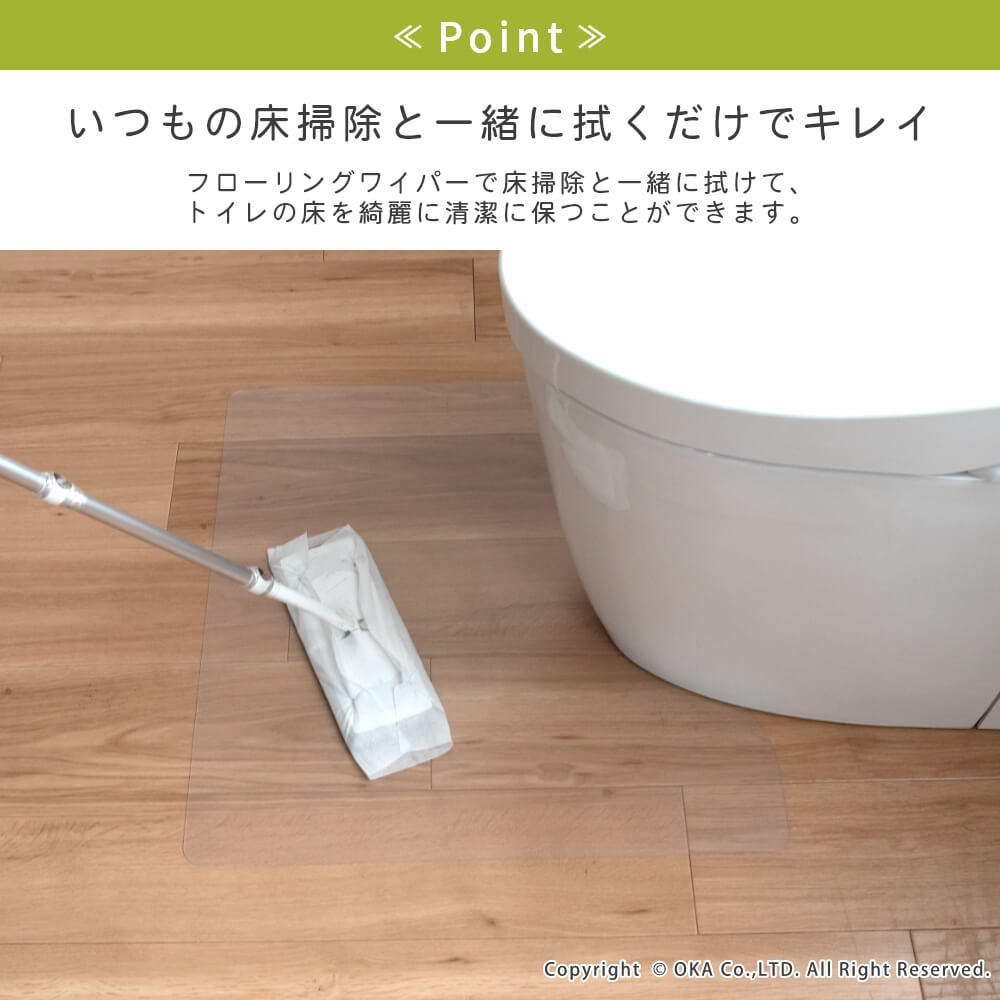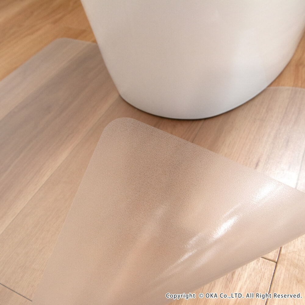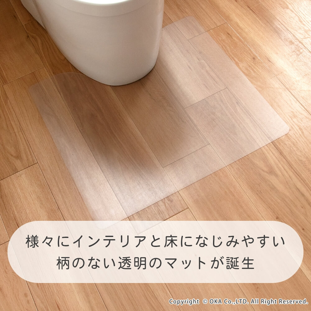 お手入れが簡単な拭いてお手入れできるトイレマットに透明が誕生しました。どんなインテリアにも合わせやすい透明だからこそ、 床が汚れたり、傷むのを防ぎたい!でも、トイレのインテリアの雰囲気を壊したくないというこだわりがある方にもおすすめ! 水や汚れを弾きやすい素材で、床をキズや水はねによる水滴、汚れから守ってくれます。トイレの床掃除のついでにマットもフローリングワイパーでお掃除できるのでとってもお手軽です! 床暖房の上でも使用可能です◎(※ただし、床暖房の長時間の連続使用や高温でのご使用は避けてください。) 薄手なのでお好みの長さにカットして、ぴったりフィットさせることもできます。 ※イメージ画像の一部は、環境によっては白く映ってみえる可能性がございますのでご了承くださいませ。