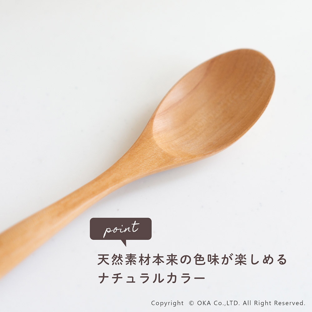 本来捨てられるはずの端材、廃材を活用した環境に配慮した天然木スプーン。扱いやすい軽さと、手にしっくりとくるカーブ。普段使いとしてさまざまなシーンで活躍できるシンプルなデザインで、天然素材本来の色味が楽しめるナチュラルカラー。硬さを感じやすい金属やガラス製食器とくらべ、見た目も質感もやわらかな天然木製カトラリーはしっくりとなじむ手ざわり」と「やさしくなめらかな口あたりで自然のぬくもりが感じられます。熱伝導率が低い木材は唇に触れた時に冷たくないのでお子様やご年配の方たちにもおすすめの食器です。ガラスコーティング塗装を施しているので家庭用食洗機対応しています。