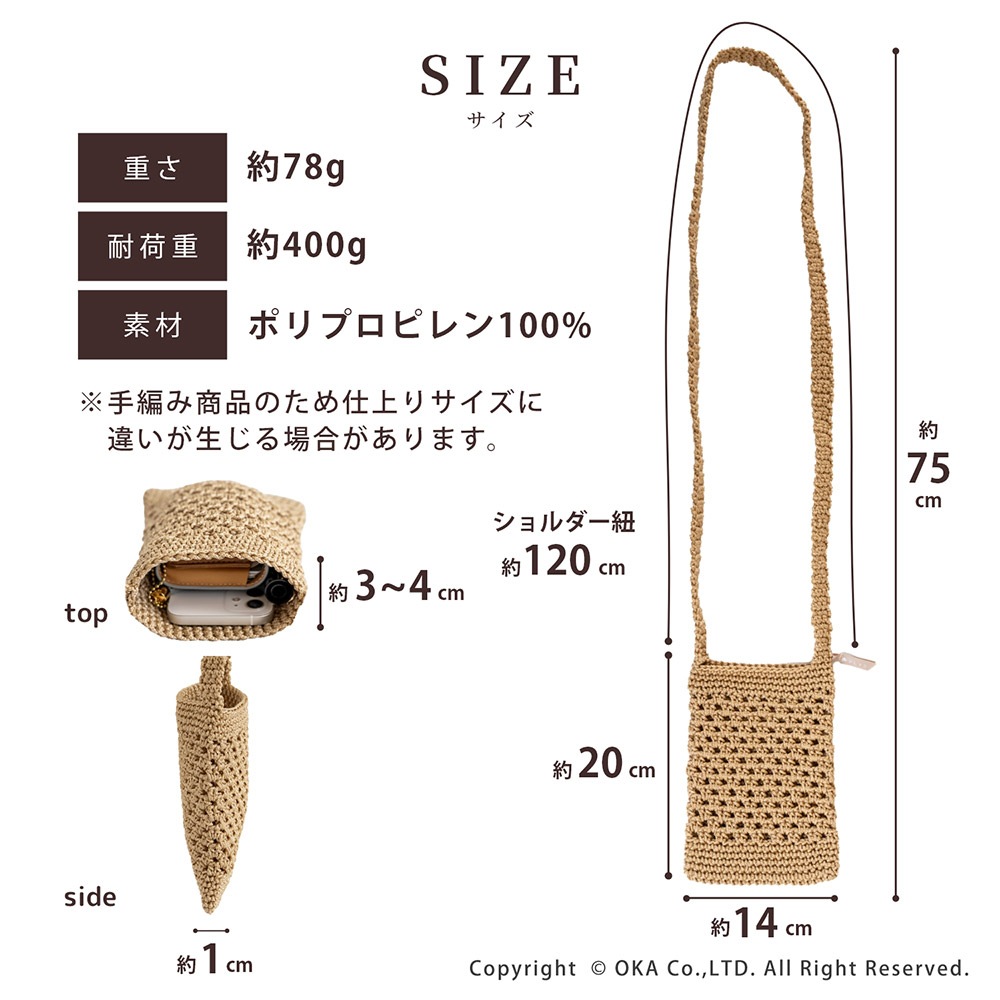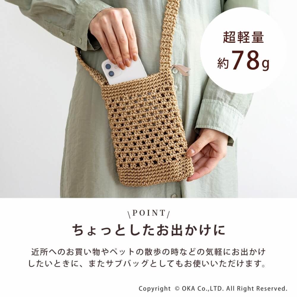 スマートフォンがすぐに取り出せる、便利なスマホショルダーバッグ。新たなカラーバリエーションとなって新シリーズで誕生!ペットの散歩やちょっとしたお買い物などのお出かけには必ずスマートフォンを持ち歩くことが多かったり、服にポケットがない時にどこにスマホを入れようか悩むことも。そんな方にはこのスマホショルダーがぴったりです。軽くて、丈夫なポリプロピレンの糸を使って手編みしました。カラーは着こなしのアクセントになるグリーン、素材感にあったナチュラルなベージュ、大人っぽいグレーの3色展開です。涼し気なデザインで夏のレジャーや旅行先で使うのもおすすめです。スマートフォン以外にもミニポーチや鍵などの小物類など、最低限必要なものを持って気軽にお出かけができます。汚れてしまっても洗濯ネットに入れて洗濯機で丸洗いOK。何かと汚れても洗えるバッグは少ないものだからこそ洗濯ができるのは嬉しいポイントです。