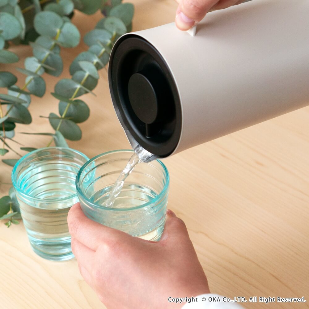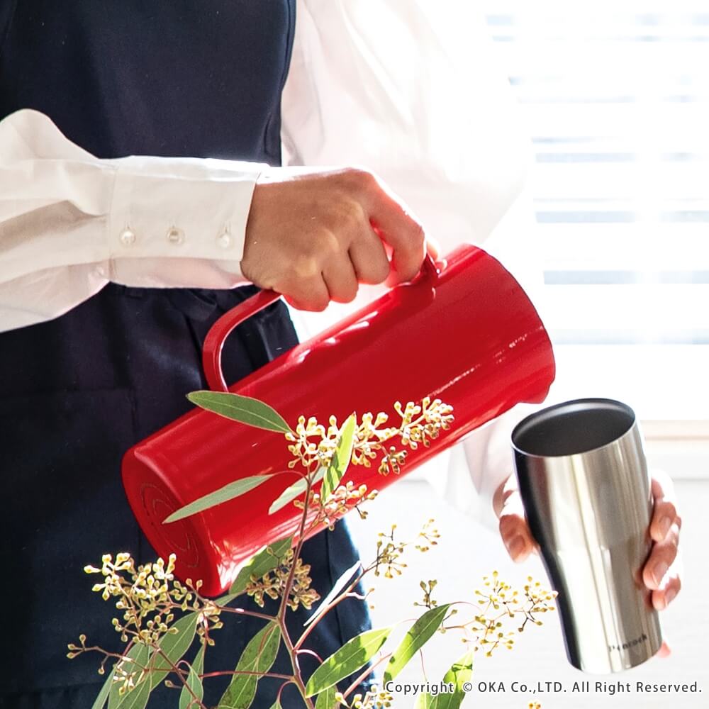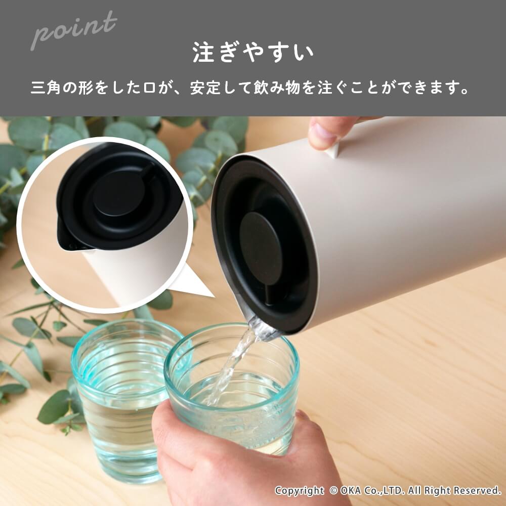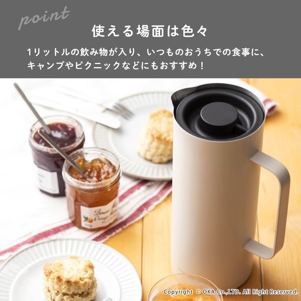温かい飲み物も、冷たい飲み物にも使える魔法瓶のステンレス製リビングポット。魔法瓶は『ステンレス真空二重構造』により外側へ熱を逃がしにくいため、保温・保冷効果が長時間持続します。本体とせん、パッキンのみを取り外して、奥まで手を入れて手洗いしやすい広口設計でお手入れもしやすくなっています。1リットルの飲み物が入り、おうちでの食事だけでなく、キャンプやピクニックなどのレジャーでお使いいただくのもおすすめです。シンプルなデザインで、インテリアにも馴染みやすい3色展開です。※密閉構造ではありませんので、中せんを閉めた状態で傾けると飲み物がもれることがありますのでご注意ください。