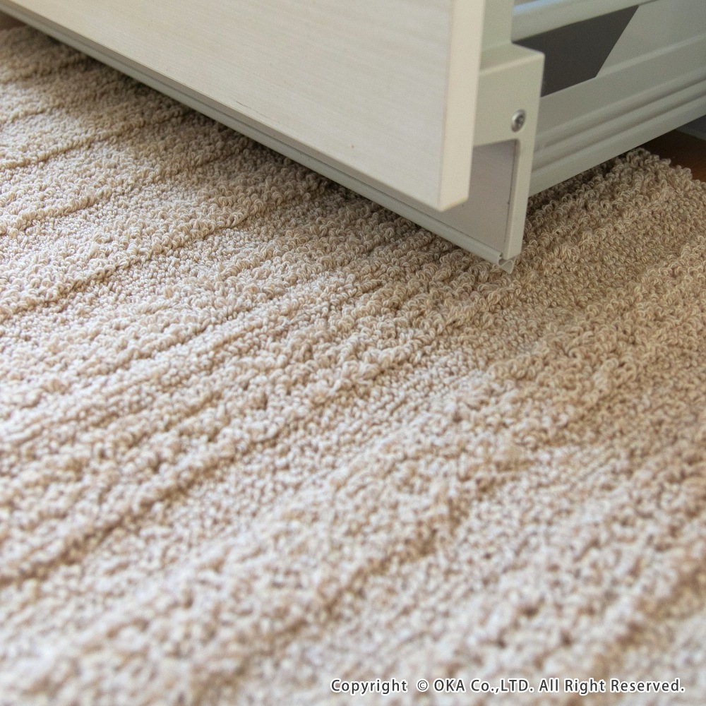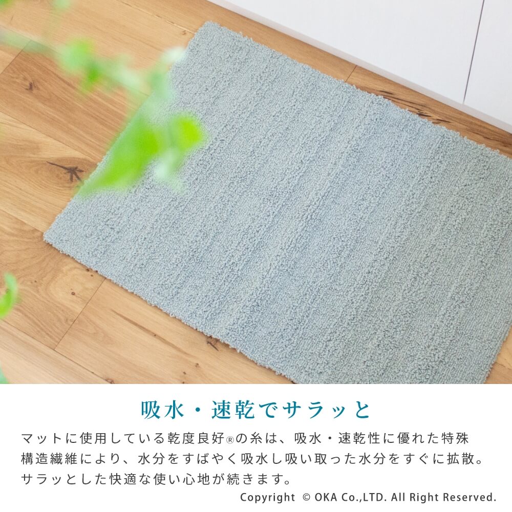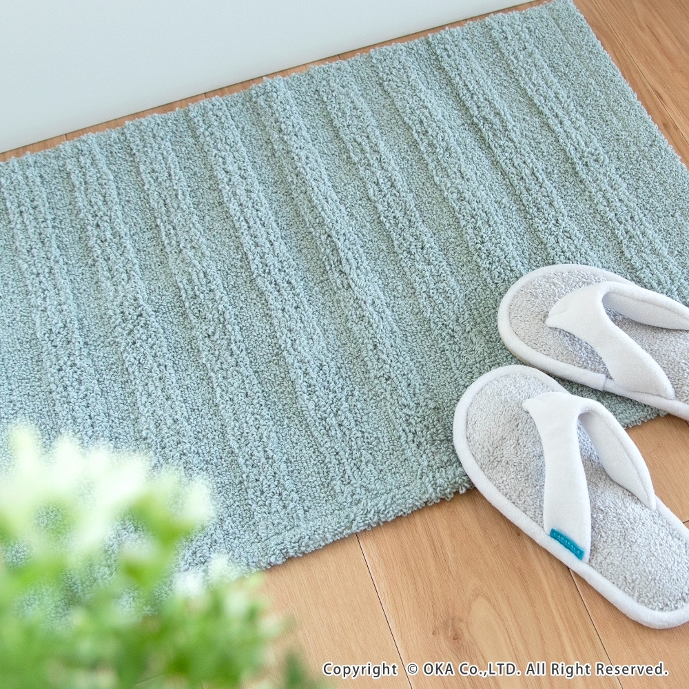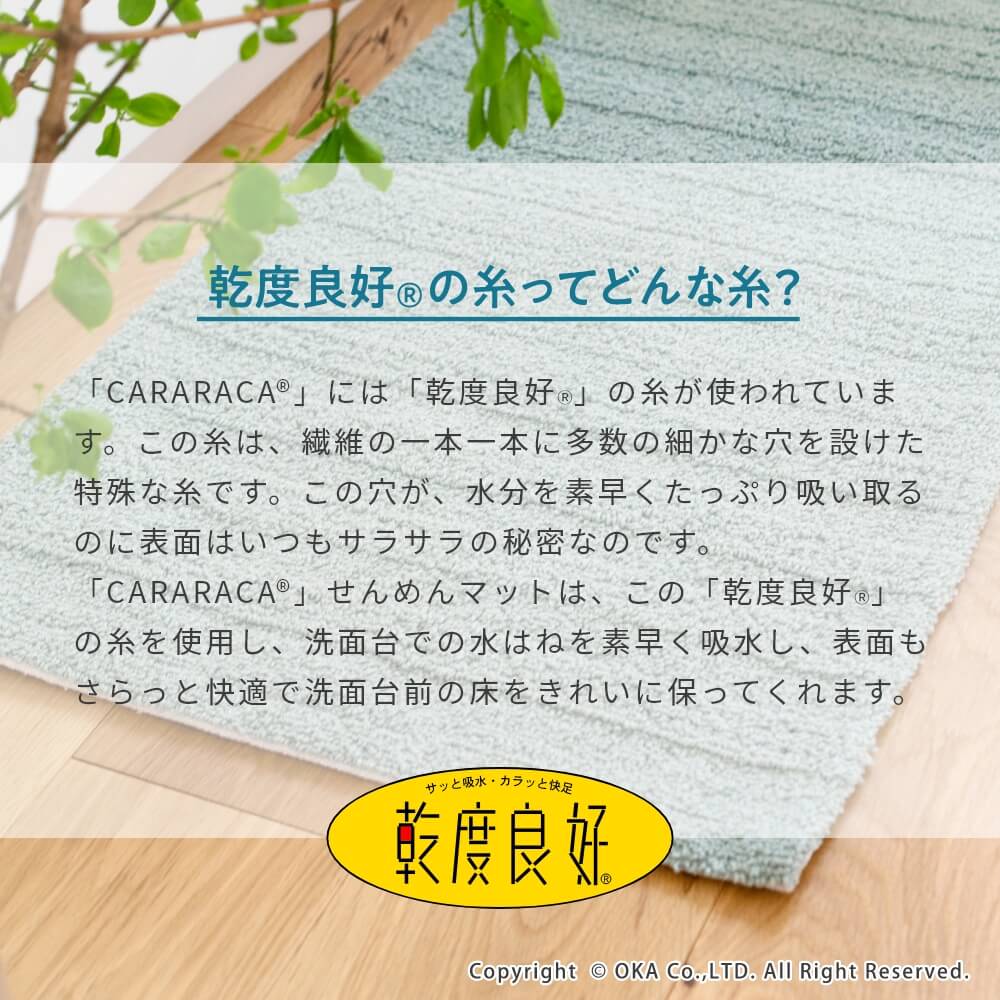 人気のCARARACA(カララカ)シリーズのせんめんマット。水はねや髪の毛、ほこりなど細かな汚れやごみが目立つ洗面台前をカバーしてくれます。 汚れても手軽に洗いやすいよう薄手になっており、洗濯ネットに入れて洗濯機で丸洗い出来ます。 吸水・速乾性に優れた乾度良好バスマットと同じ糸を使用し、水分をスッと吸水しさらっとした快適な踏み心地が続き、洗濯後も乾きが速いです。 バスマットとは違い、洗面台の下に敷いたままでも床になじみやすいデザインに仕上げています。 同シリーズのカララカバスマットやお風呂上がりスリッパとお揃いに洗面所のインテリアを統一してみるのもおすすめです。
