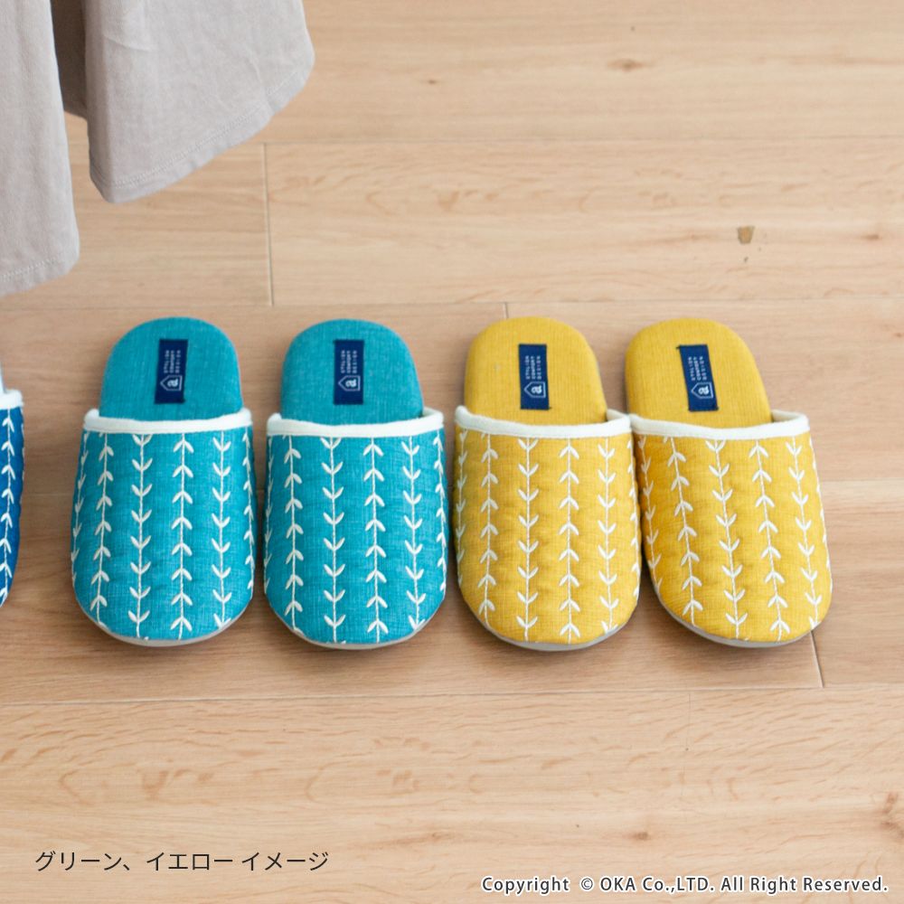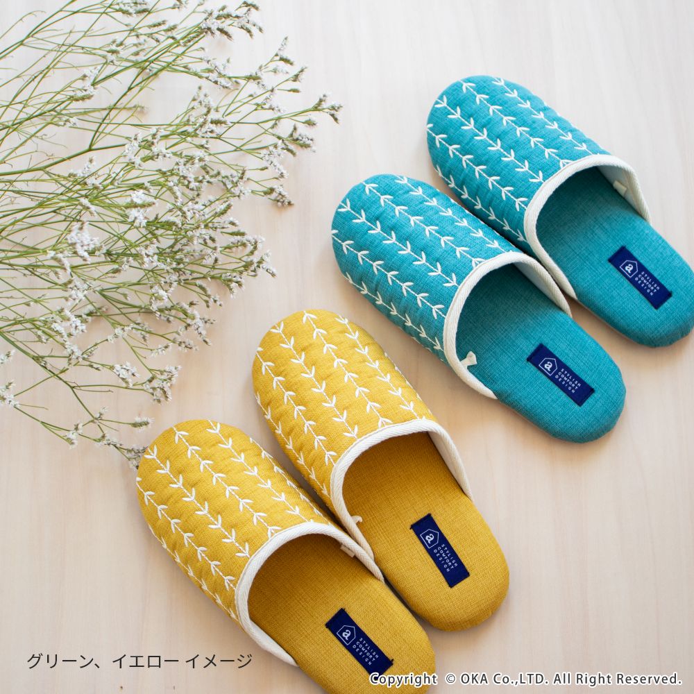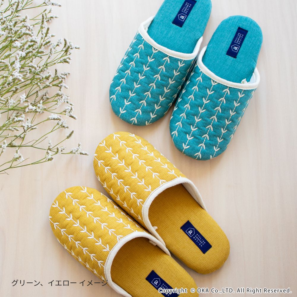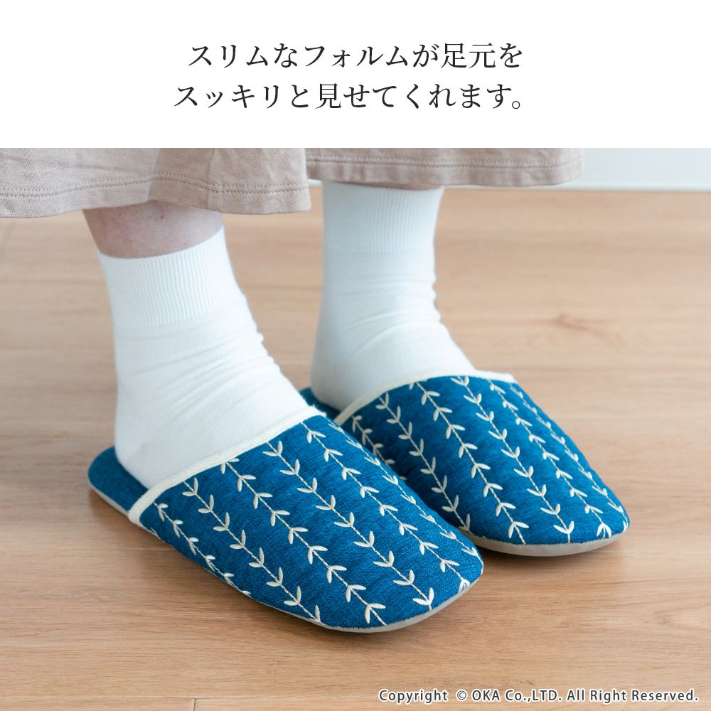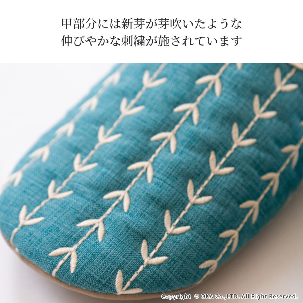 来客用に、自分用にもおすすめの北欧カラーがインテリアのアクセントになる室内用スリッパ。通年つかえるシンプルなフォルムと素材のスリッパで、細部まで丁寧な縫製仕上げになっています。甲部分には新芽が芽吹いたような伸びやかな刺繍が施されています。履き口のフチにはホワイトのテープ仕上げになっており爽やかな雰囲気になりました。程よいクッション性のあるかかとで歩きやすく足にフィットして歩きやすいスリッパです。爽やかなデザインはギフトにもピッタリ。新築や引っ越しのお祝いギフトにもおすすめです。