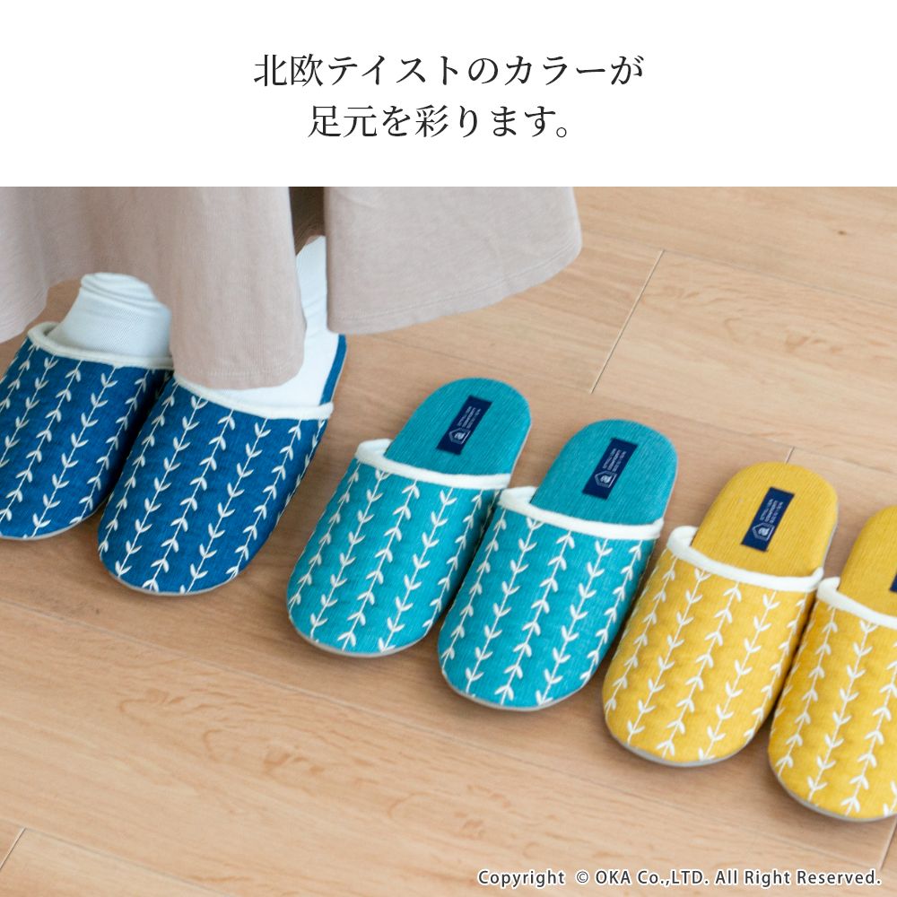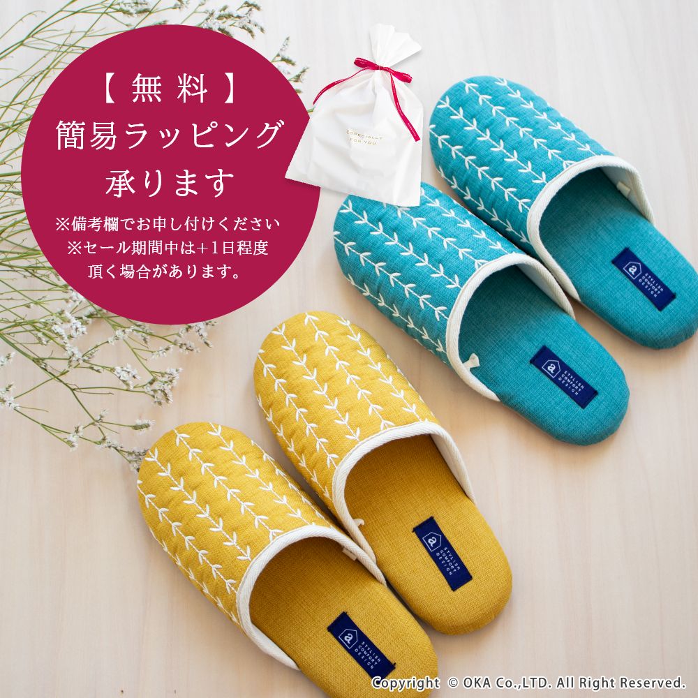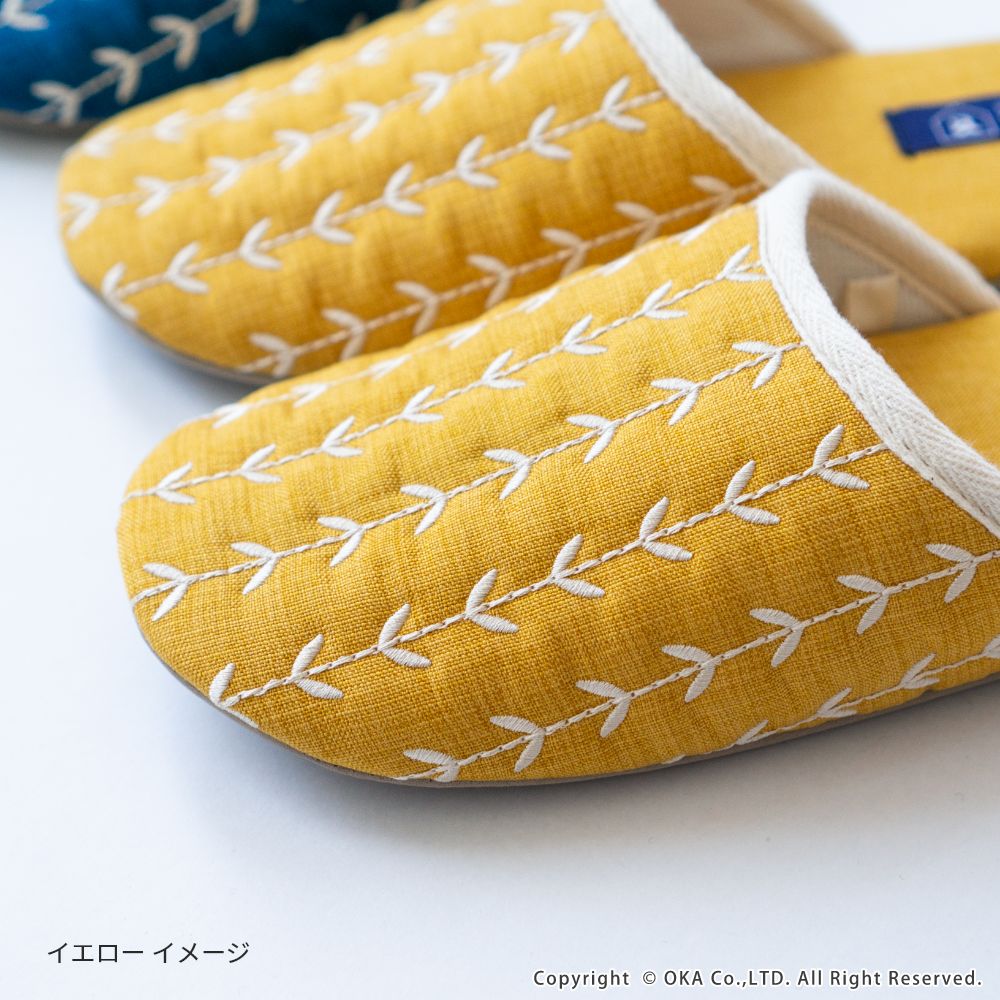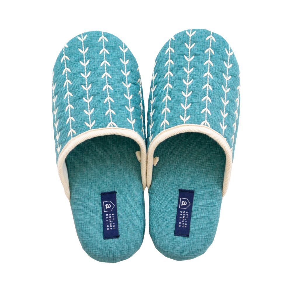 来客用に、自分用にもおすすめの北欧カラーがインテリアのアクセントになる室内用スリッパ。通年つかえるシンプルなフォルムと素材のスリッパで、細部まで丁寧な縫製仕上げになっています。甲部分には新芽が芽吹いたような伸びやかな刺繍が施されています。履き口のフチにはホワイトのテープ仕上げになっており爽やかな雰囲気になりました。程よいクッション性のあるかかとで歩きやすく足にフィットして歩きやすいスリッパです。爽やかなデザインはギフトにもピッタリ。新築や引っ越しのお祝いギフトにもおすすめです。