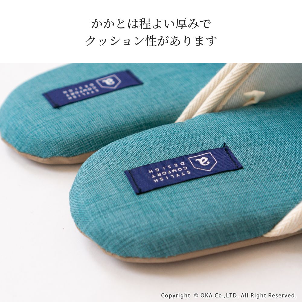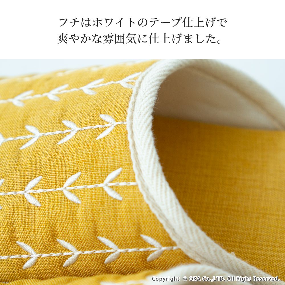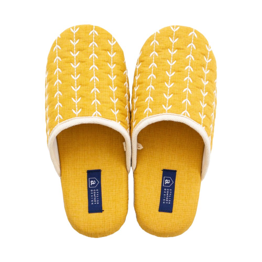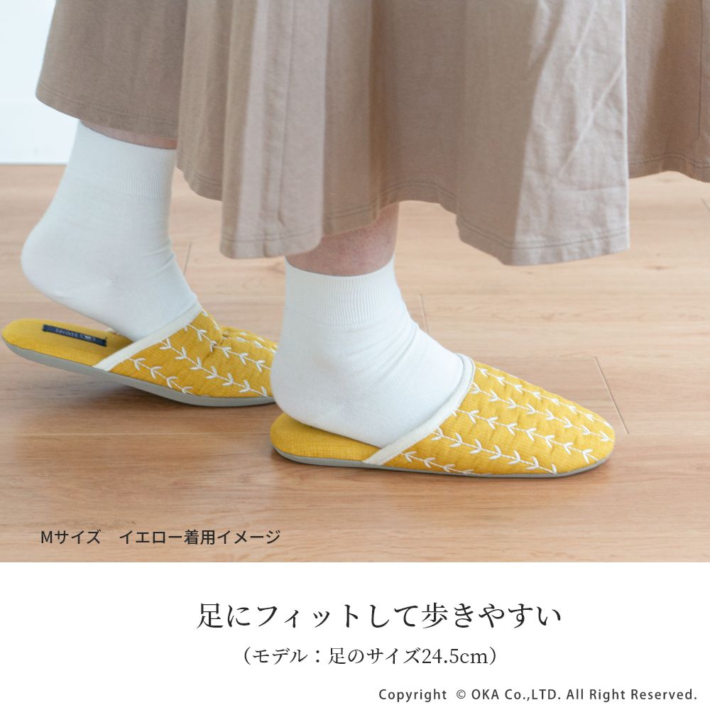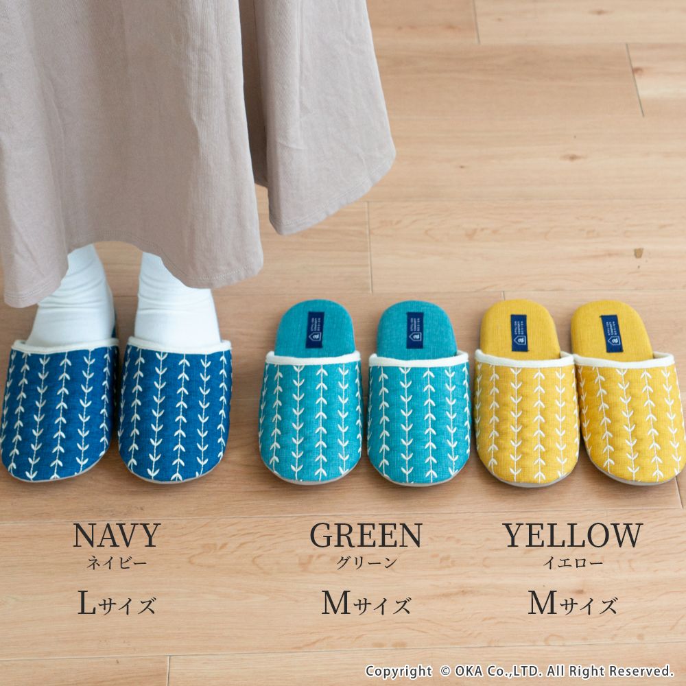 来客用に、自分用にもおすすめの北欧カラーがインテリアのアクセントになる室内用スリッパ。通年つかえるシンプルなフォルムと素材のスリッパで、細部まで丁寧な縫製仕上げになっています。甲部分には新芽が芽吹いたような伸びやかな刺繍が施されています。履き口のフチにはホワイトのテープ仕上げになっており爽やかな雰囲気になりました。程よいクッション性のあるかかとで歩きやすく足にフィットして歩きやすいスリッパです。爽やかなデザインはギフトにもピッタリ。新築や引っ越しのお祝いギフトにもおすすめです。