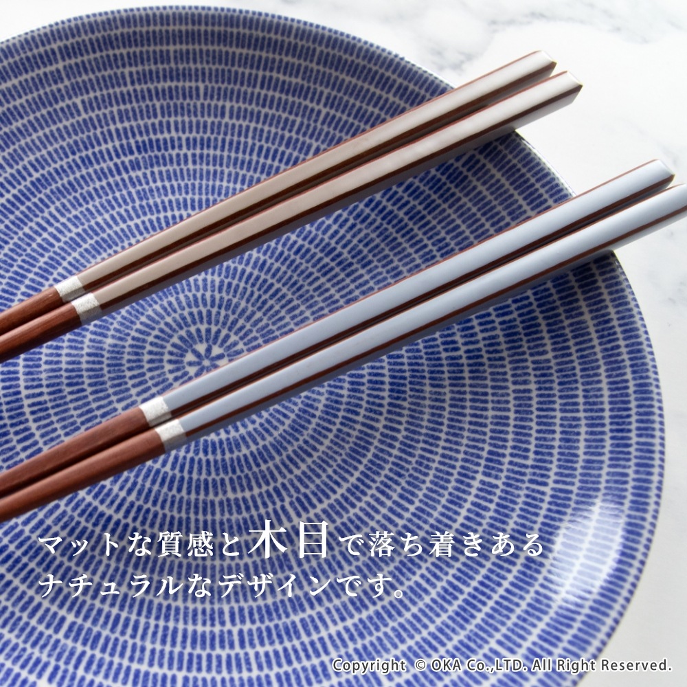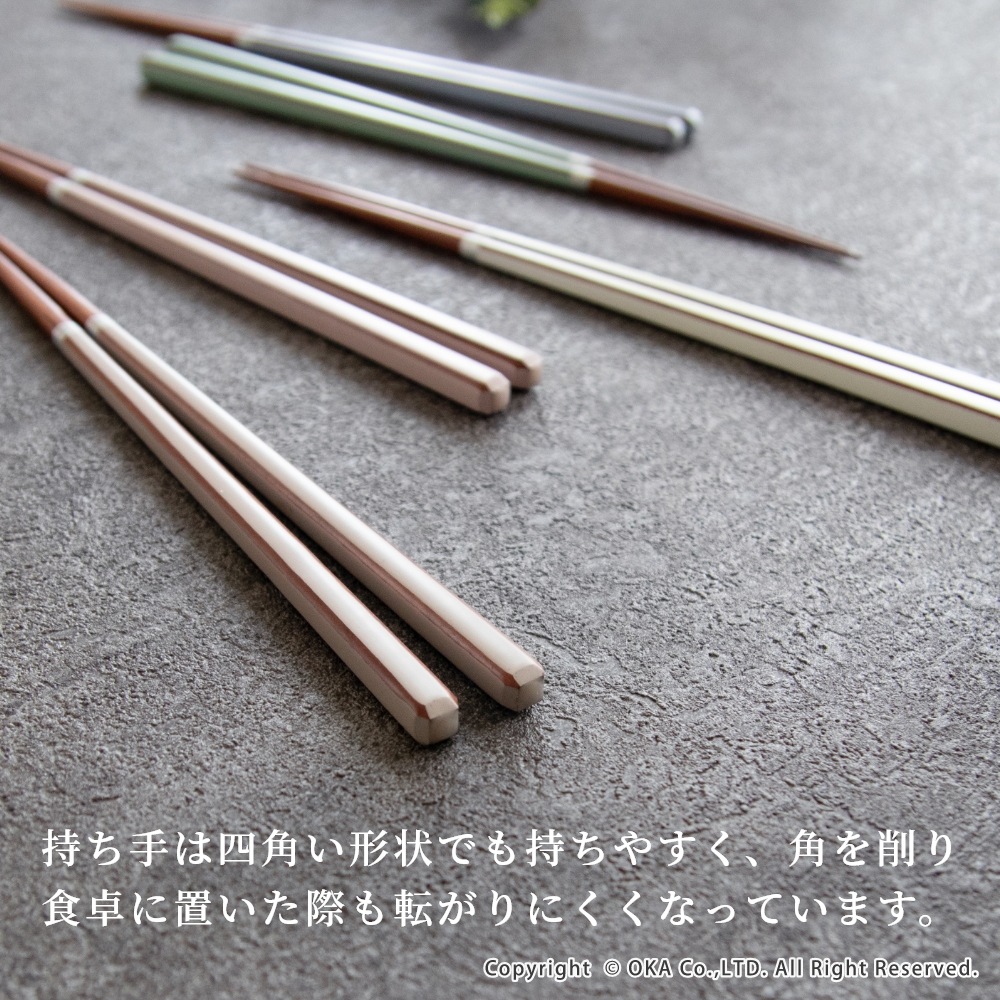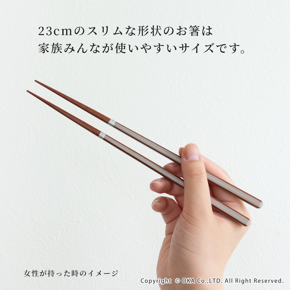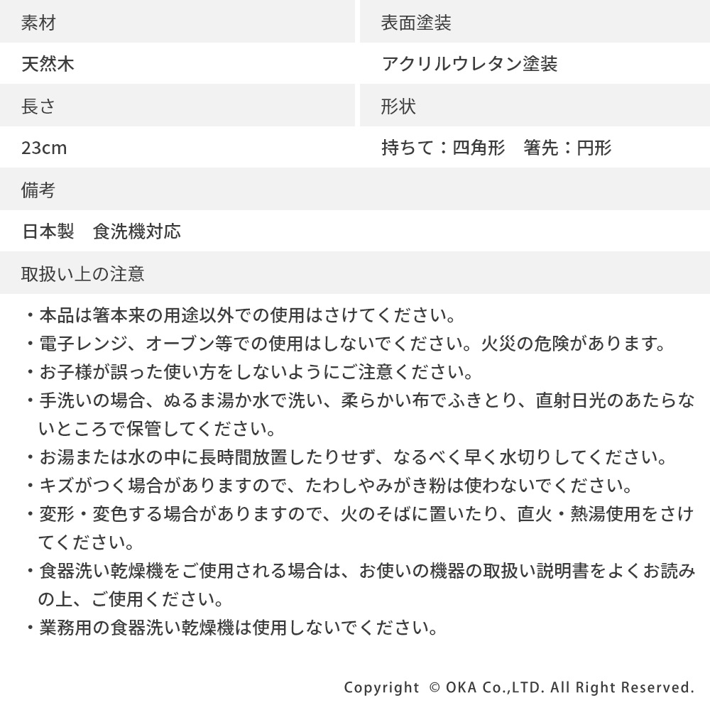 マットな質感と木目で落ち着きあるナチュラルデザインのお箸。箸先は細かいものでもつかみやすい、細めの形状になっています。 持ち手は四角い形状でも持ちやすく、角を削り食卓に置いた際も転がりにくくなっています。 木製の温もりが感じられる箸は使うほど手になじみやすく、お箸の長さは23cmとスリムな形状で家族全員が使いやすいサイズです。 和風モダンな雰囲気で上品さも感じられるデザインなので、来客用にもお使いいただけます。 またお箸は食洗機対応なので毎日気兼ねなくご使用いただけます。