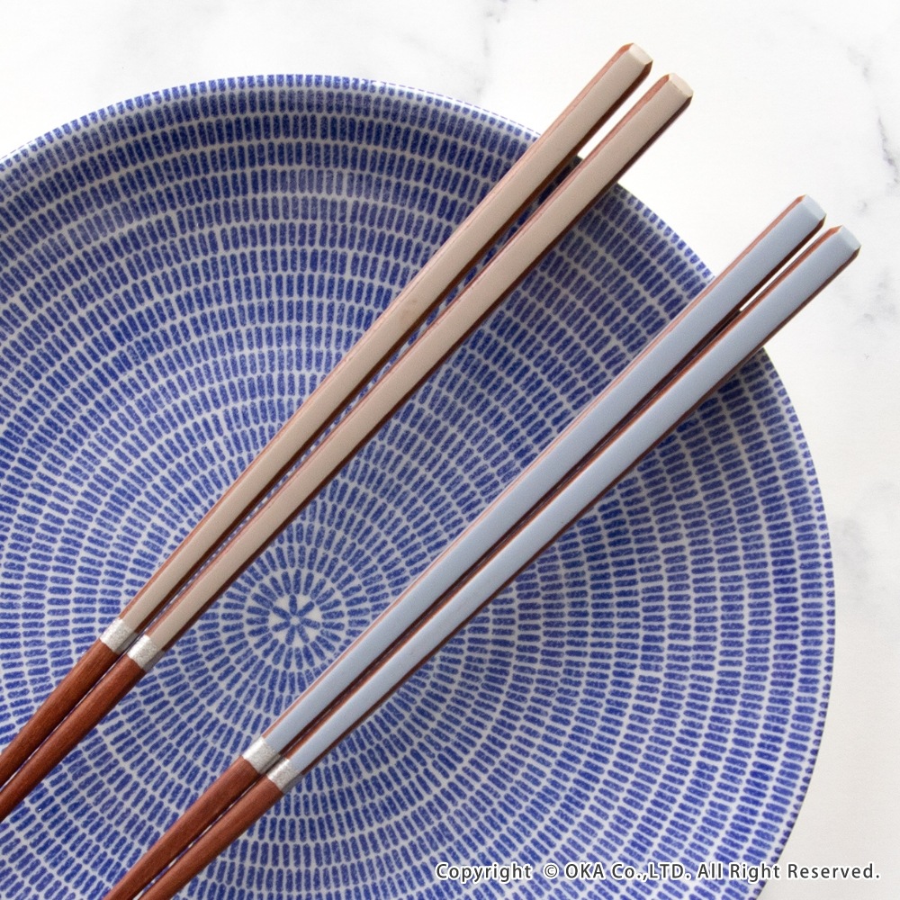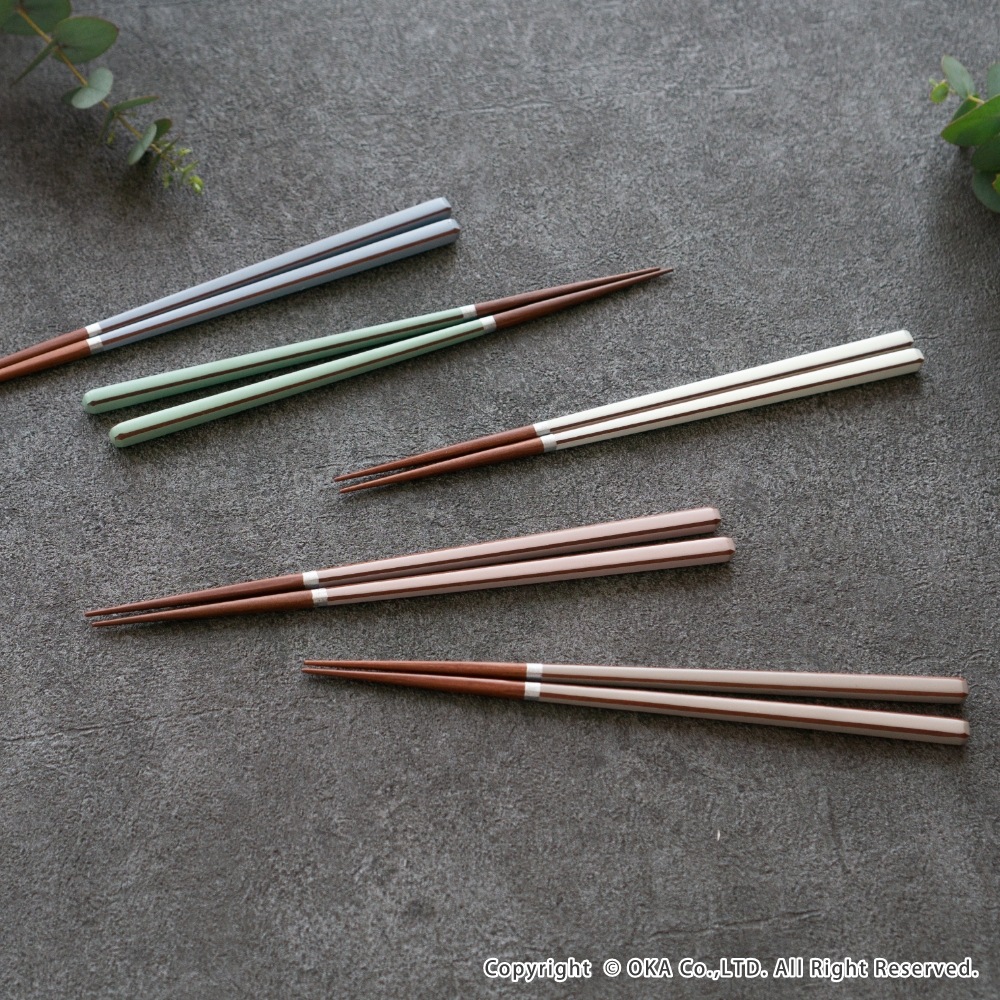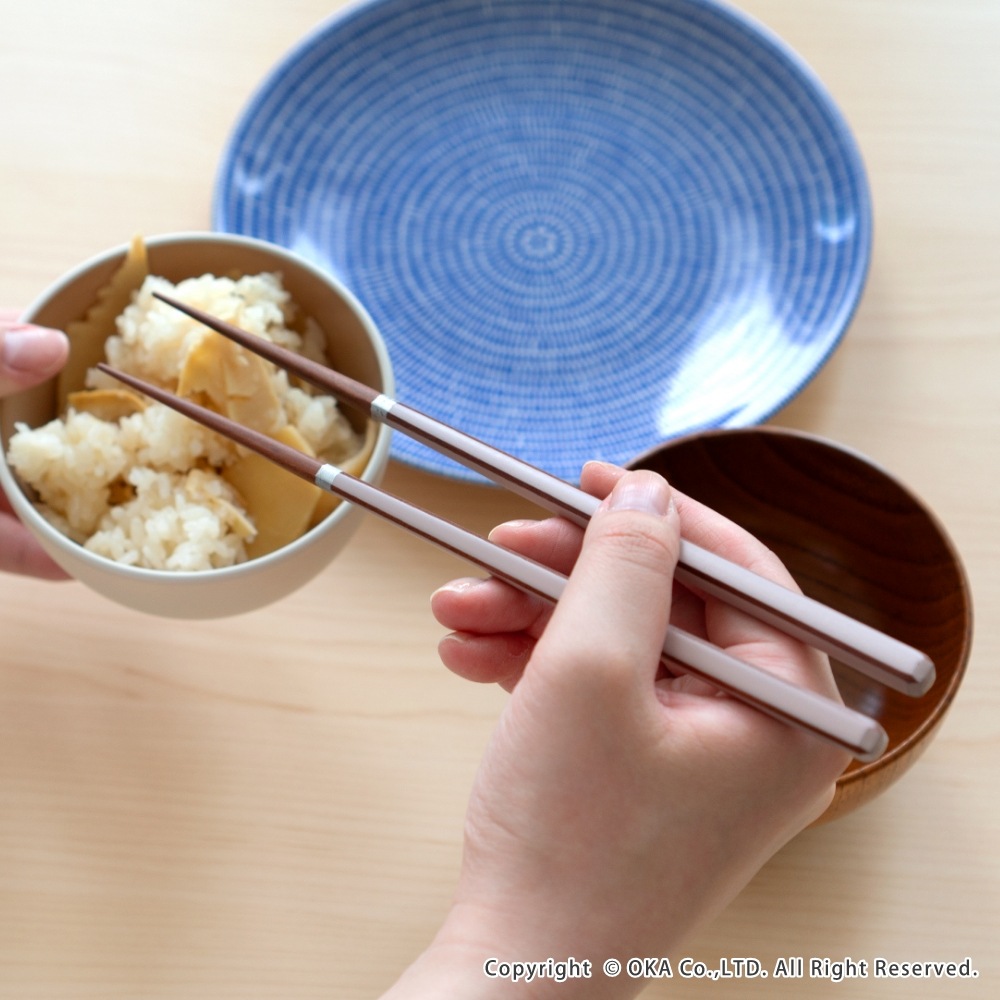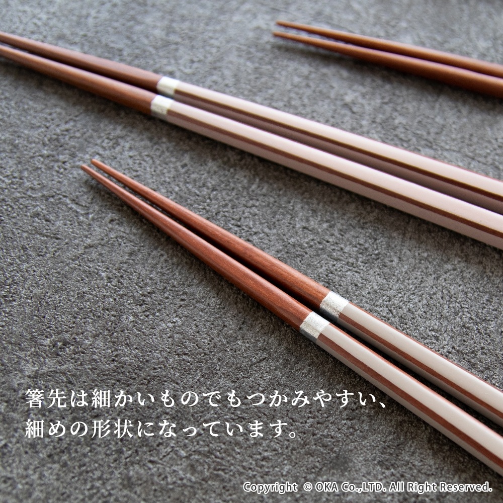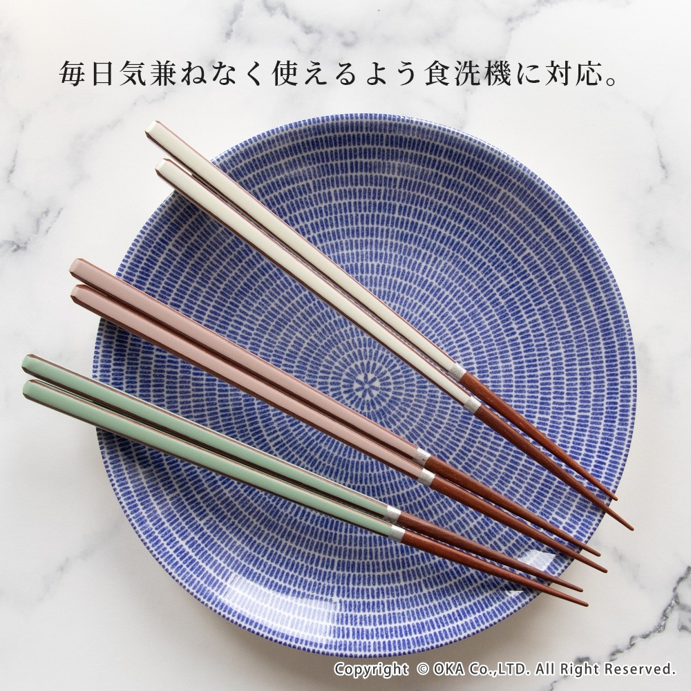 マットな質感と木目で落ち着きあるナチュラルデザインのお箸。箸先は細かいものでもつかみやすい、細めの形状になっています。 持ち手は四角い形状でも持ちやすく、角を削り食卓に置いた際も転がりにくくなっています。 木製の温もりが感じられる箸は使うほど手になじみやすく、お箸の長さは23cmとスリムな形状で家族全員が使いやすいサイズです。 和風モダンな雰囲気で上品さも感じられるデザインなので、来客用にもお使いいただけます。 またお箸は食洗機対応なので毎日気兼ねなくご使用いただけます。