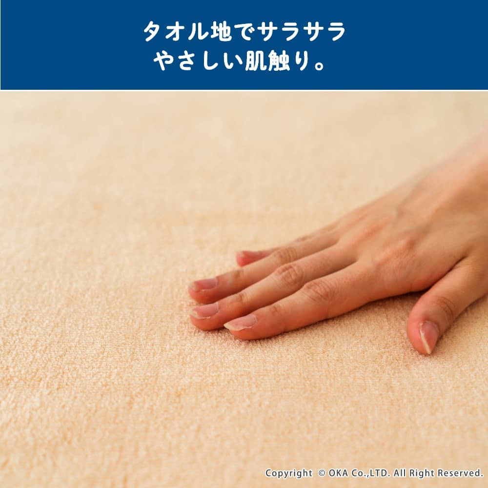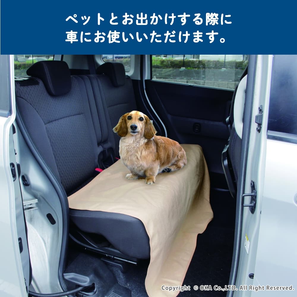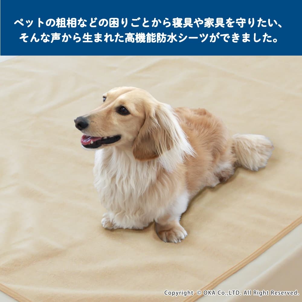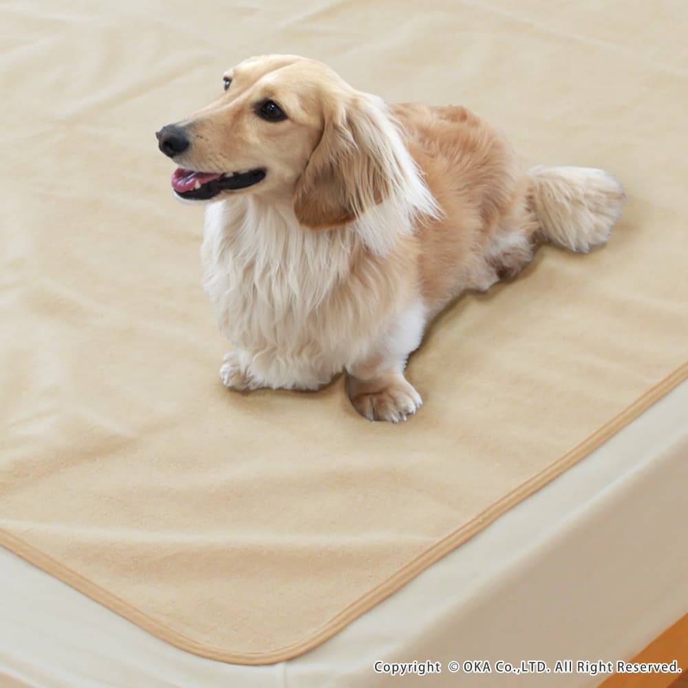 「ペットの困った」を少しでも手間を減らしたい!ペットのための防水シーツなら、裏面はポリウレタンラミネートの防水素材になっているので水分を通さず、ペットのおしっこなどから床やベッドが汚れるのを防ぎます。抗菌防臭加工なので清潔にお使いいただけるのもポイントです。洗濯機での丸洗いはもちろん可能、乾燥機の使用もできるのでお手入れが簡単です。シーツの表面は綿タオル地でペットにもやさしい肌触り。リビングでトイレの下やソファ、ベッドや車のシートなどいろいろな場所で使用できる大判サイズです。薄手で軽くかさばらないので、外出の持ち運びもしやくなっています。※乾燥機をご使用の際には低温乾燥(排気温度上限60℃)で行ってください。