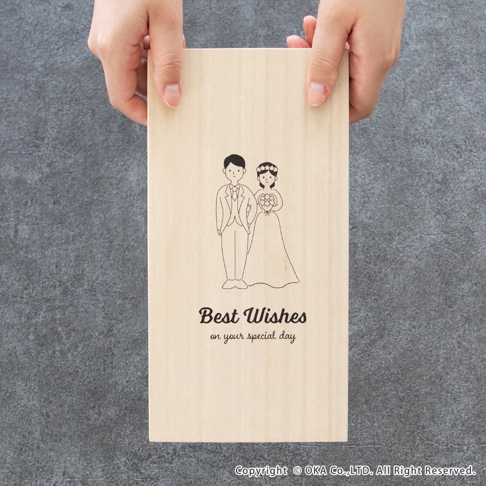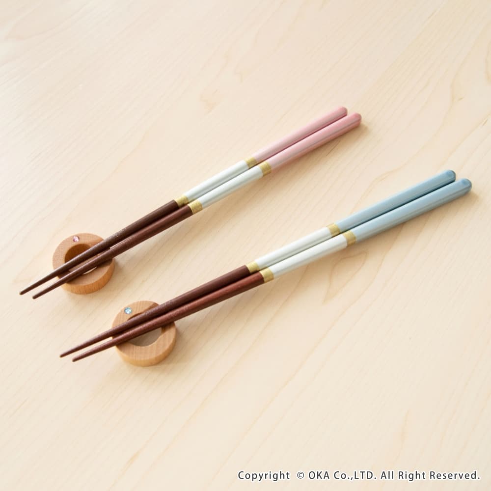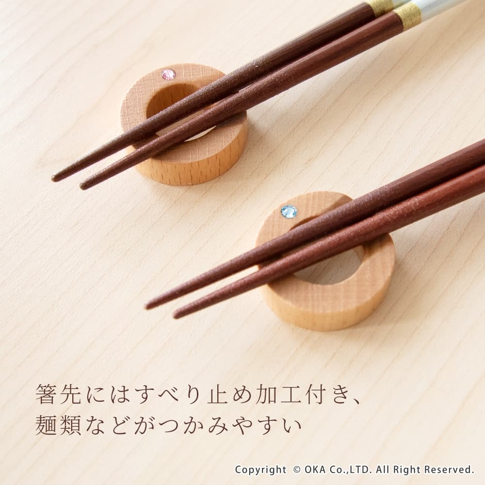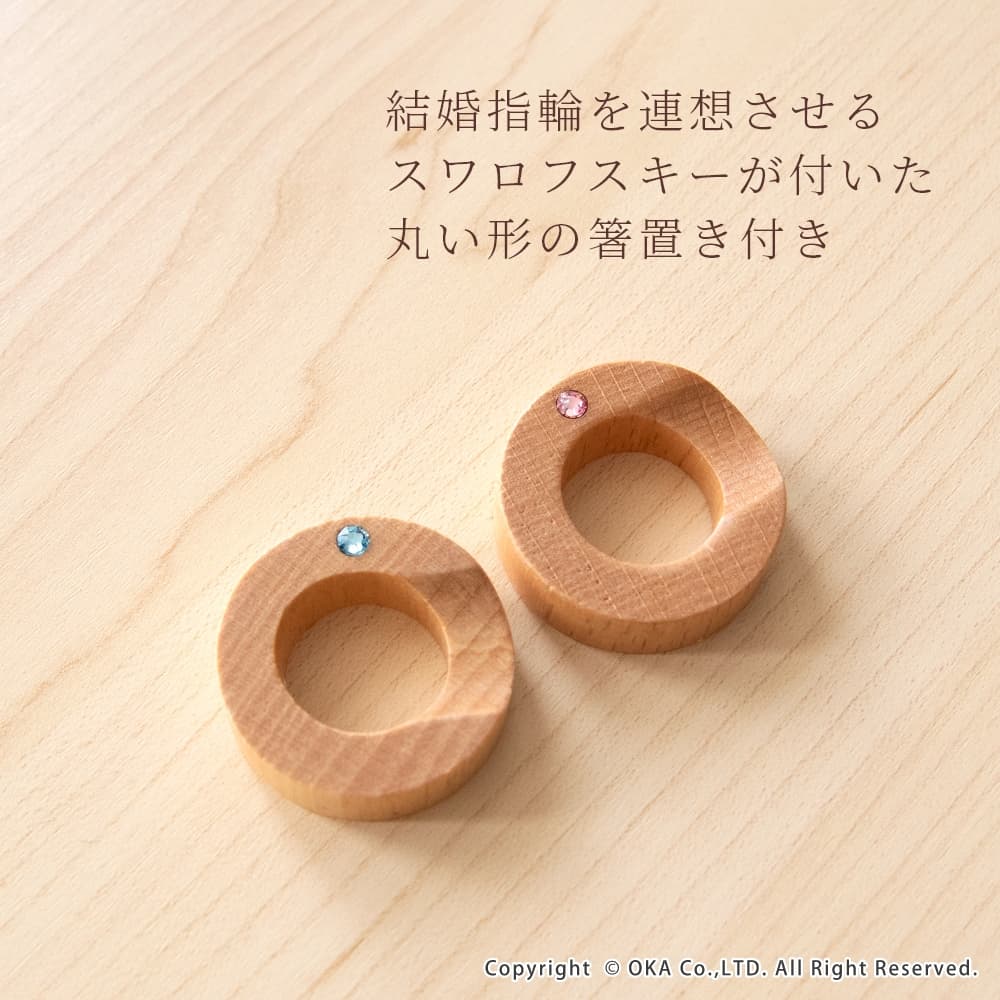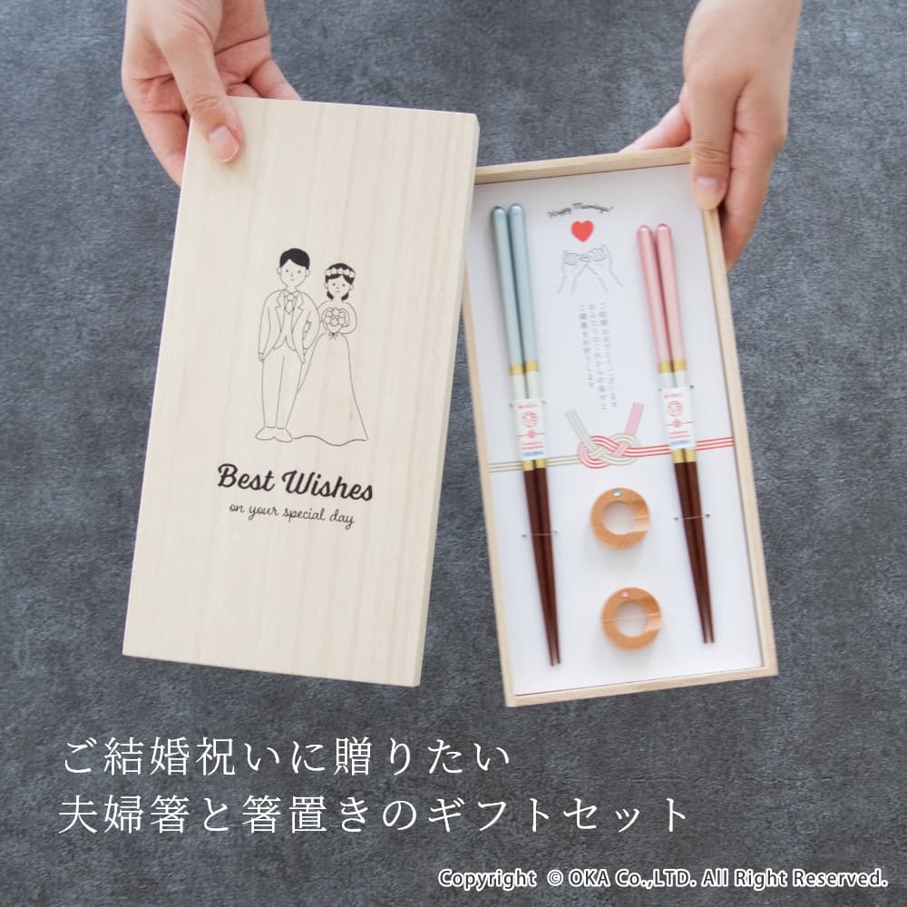 ご結婚祝いに贈るギフトにぴったり!まるでパールのような美しいお箸と、スワロフスキーが付いた箸置きがセットになった夫婦箸のギフトセット。幸せを願う言葉と共に、結婚式の新郎新婦の可愛いデザインが桐箱に描かれています。箱を開けると、あわじ結びとお祝いのメッセージの書かれた台紙付きです。可愛いパステル調のお箸は、パッと明るく結婚の幸せを彩る雰囲気にしてくれます。箸置きは天然木でできた円形のかたちに、ピンクとブルーのスワロフスキーがあることでまるで結婚指輪のような輝きです。(箸置きは食洗機不可)お箸の先にはすべり止め加工が施されており、麺類でもつかみやすくなっています。またお箸は食洗機対応なので毎日気兼ねなくご使用いただけます。