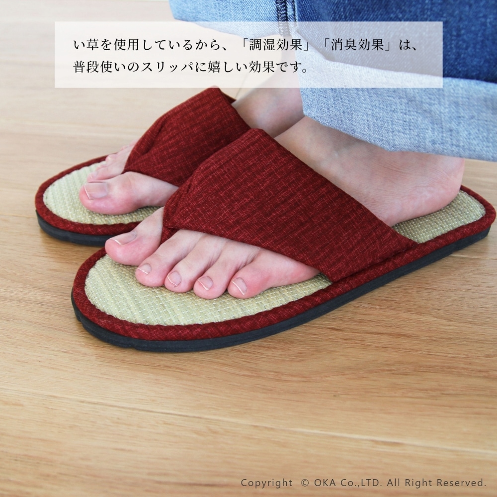 中敷に畳(い草)を使用したスリッパで、吸湿性が高く、トング型のデザインで通気性が良く、夏はもちろん一年を通して快適にお使いいただけます。歩きやすく脱げにくい鼻緒タイプで足指を開放でき、お家でのリラックス時間にぴったり。たっぷりの生地で甲部分を包み込むので鼻緒タイプのデザインでも履きやすく歩きやすい。