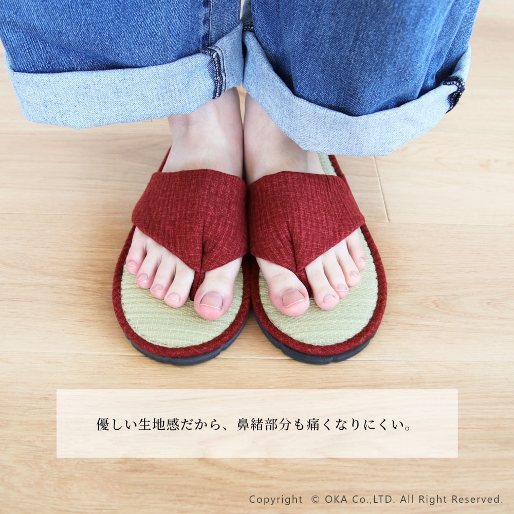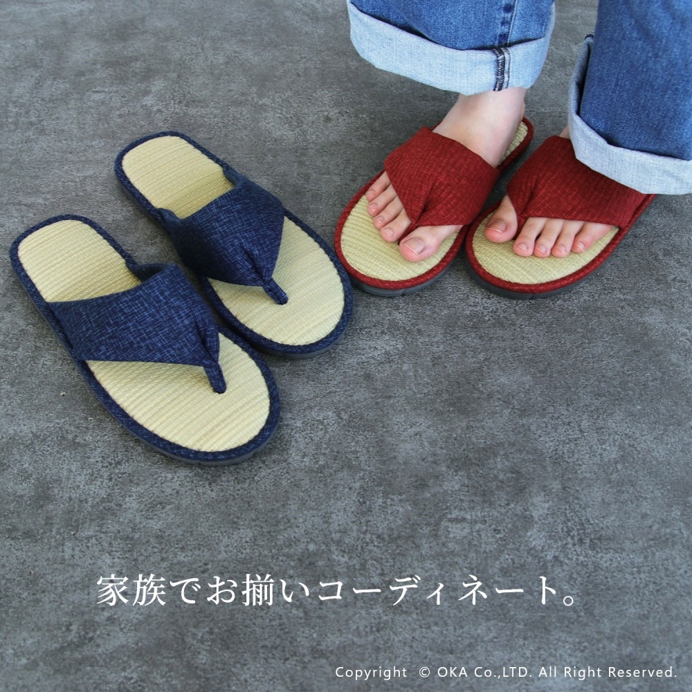 鼻緒スリッパが新デザインとなって再登場しました。中敷に畳(い草)を使用したスリッパで、吸湿性が高く、トング型のデザインで通気性が良く、夏はもちろん一年を通して快適にお使いいただけます。歩きやすく脱げにくい鼻緒タイプで足指を開放でき、お家でのリラックス時間にぴったり。たっぷりの生地で甲部分を包み込むので鼻緒タイプのデザインでも履きやすく歩きやすい。畳のサラサラッとした肌触りと独特の香りで癒される1足。日本の職人技が光る丁寧な縫製でシンプル&スッキリなデザイン。MサイズとLサイズ、2つのサイズで家族でお揃いにして履いて頂けます。