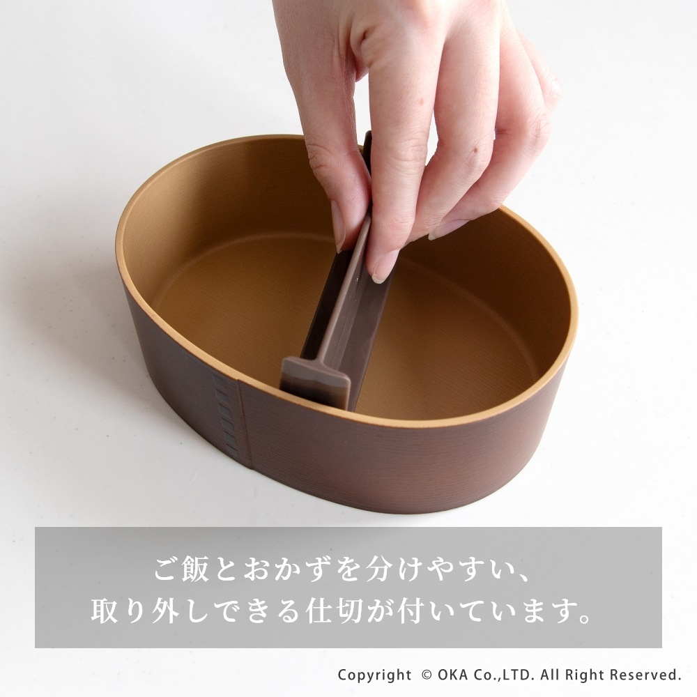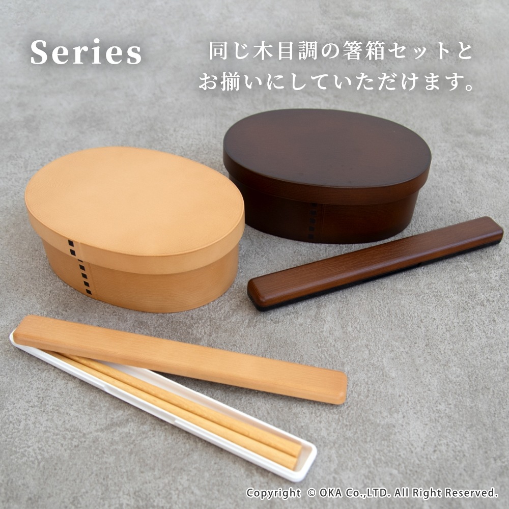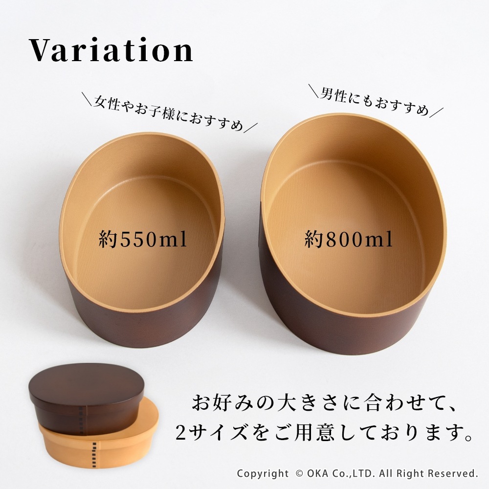 お弁当のおかずごはんを美味しくみせてくれる、あたたかみのある木目調の曲げわっぱ風のお弁当箱。職人が、1つ1つ手作業で塗りを行い、木の質感から和の趣も感じられる高品質な日本製です。食洗機で洗えるので、お手入れもしやすく衛生的にお使いいただけます。また、電子レンジにも対応しているので、ごはんもあたたかく食べることができます。(中蓋は食洗機・電子レンジ不可)中身がこぼれにくいよう中蓋があり、ゴムバンド付きになっています。800mlの大きめサイズは女性から少食な男性にもおすすめのサイズ感となっております。毎日のお弁当づくりが楽しくなり、初めてのわっぱのお弁当箱を使ってみたい方にもおすすめです!
