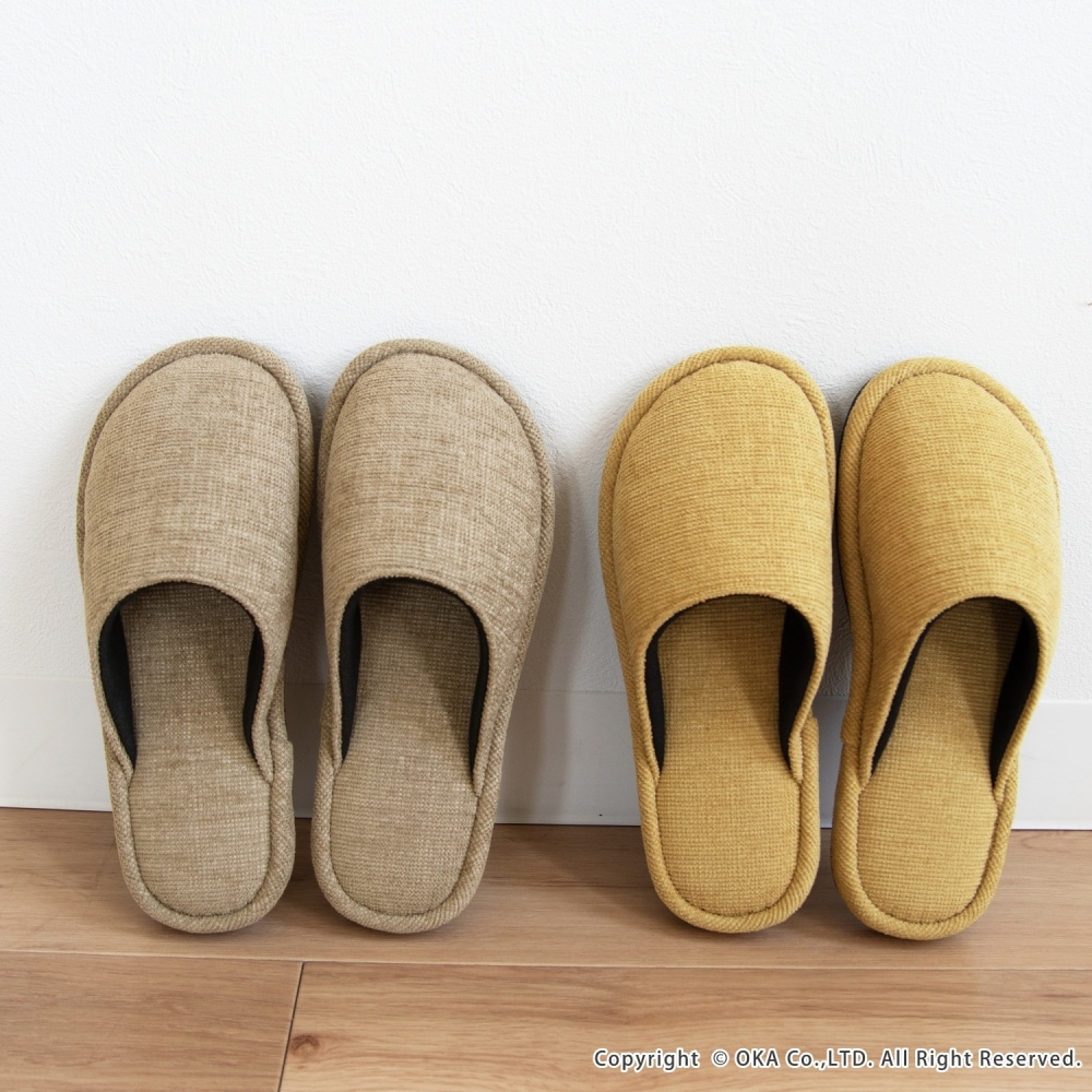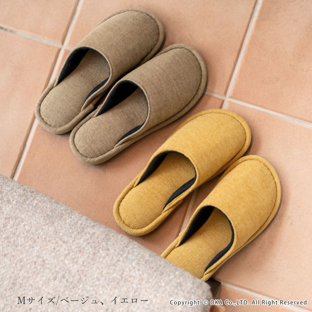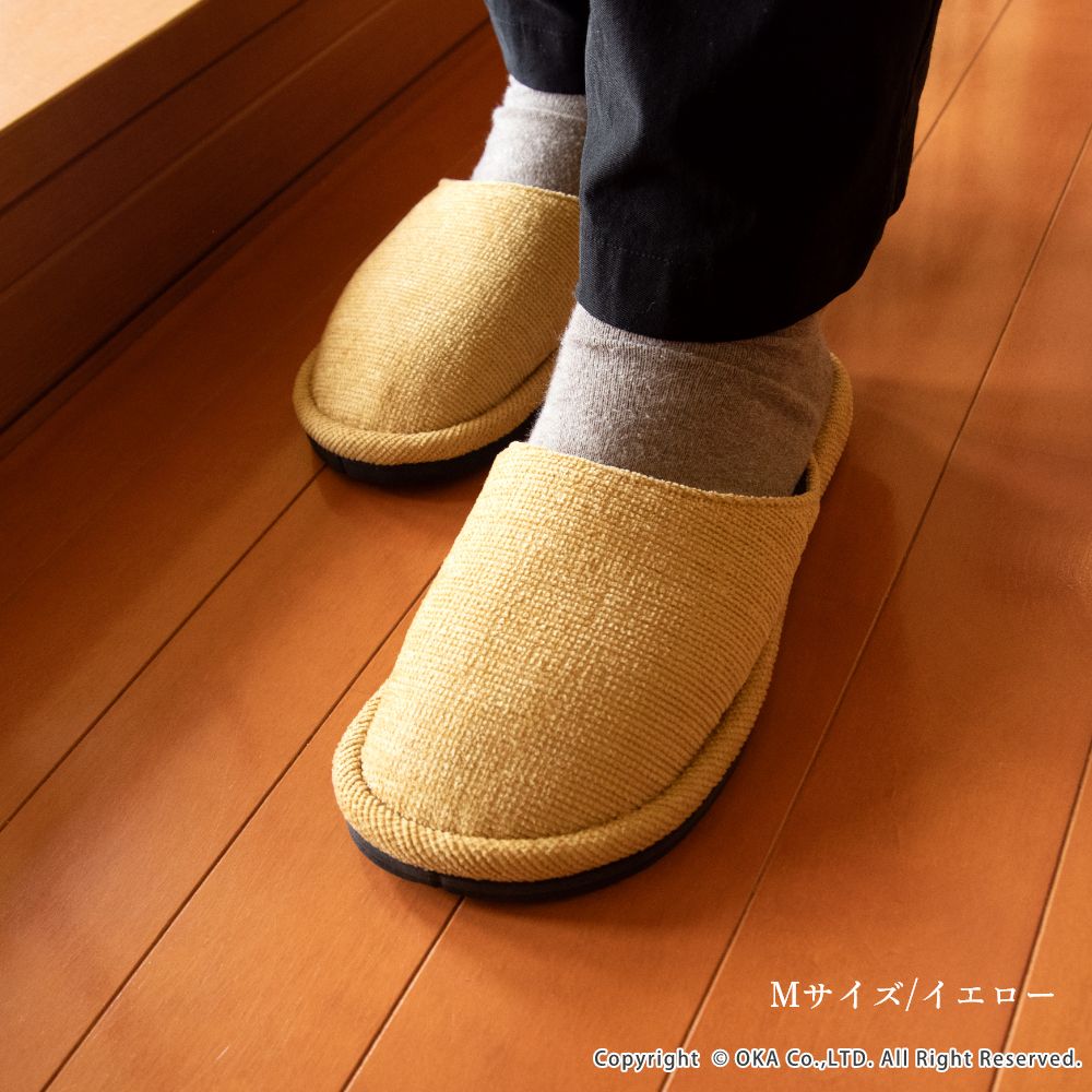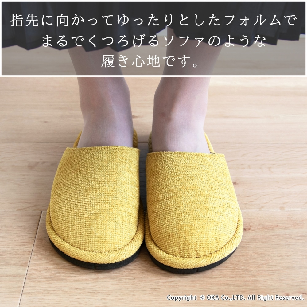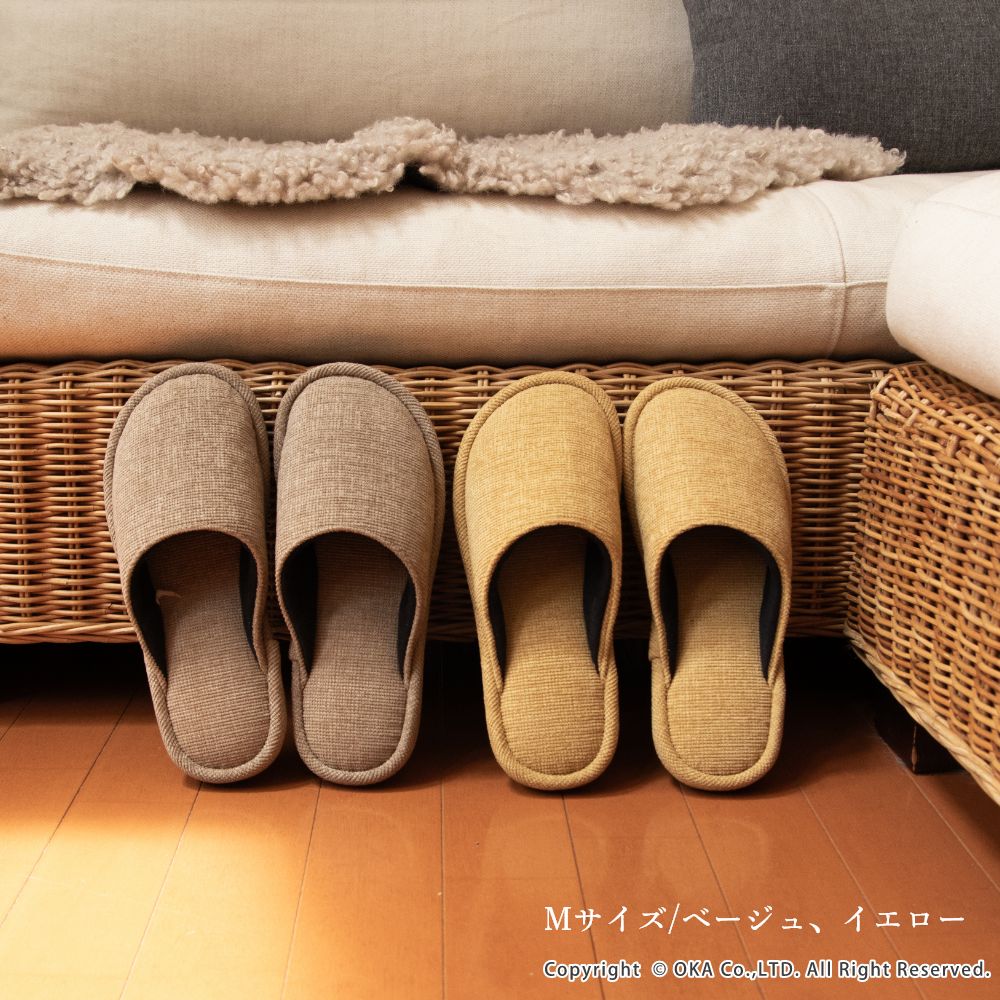 ソファのような生地感がさらりと落ち着く、まるでソファを履いているような感覚で足全体を包み込んでくれるスリッパ。 指先に向かってゆったりとしたフォルムでくつろげる履き心地です。シンプルかつ上品な発色なので、来客用にもお使いいただけます。 程よいクッション性があり、長時間の立ち仕事も足が疲れにくいです。 サイズは、MサイズとLサイズの2サイズ(サイズによってカラーは異なります)をご用意しておりますので、お揃いにお使いいただけます。新築や引っ越しのお祝いギフトにもおすすめです。丸洗い可能(洗濯ネットに入れてお洗濯してください)