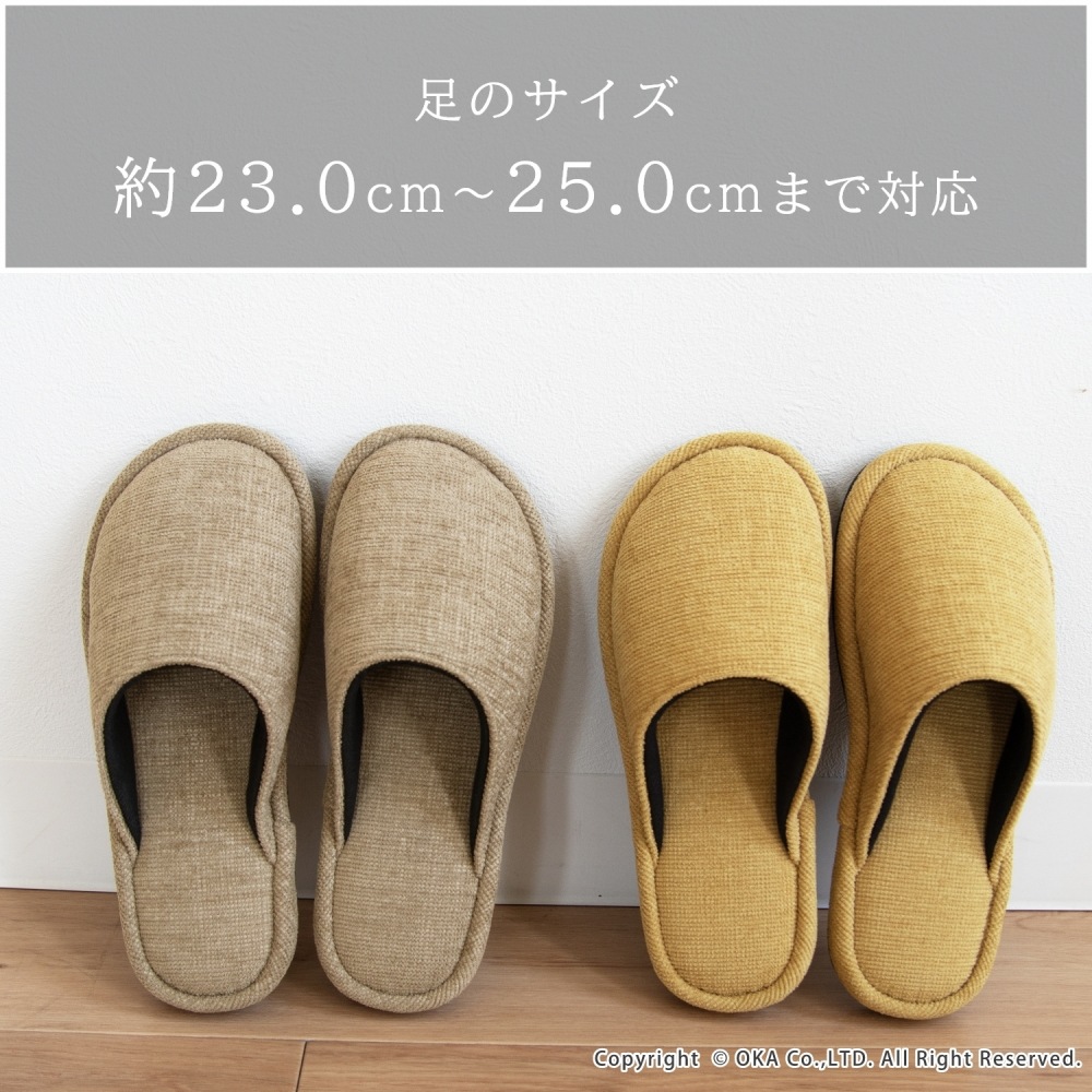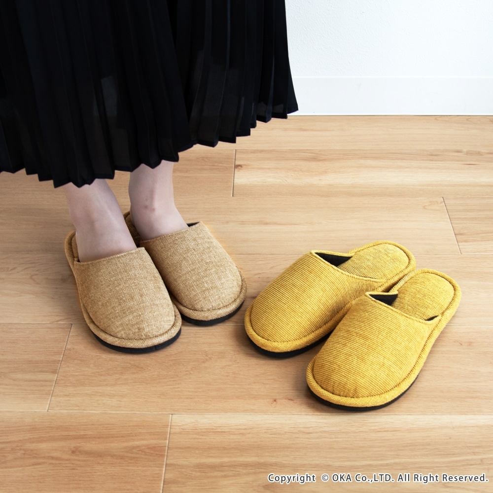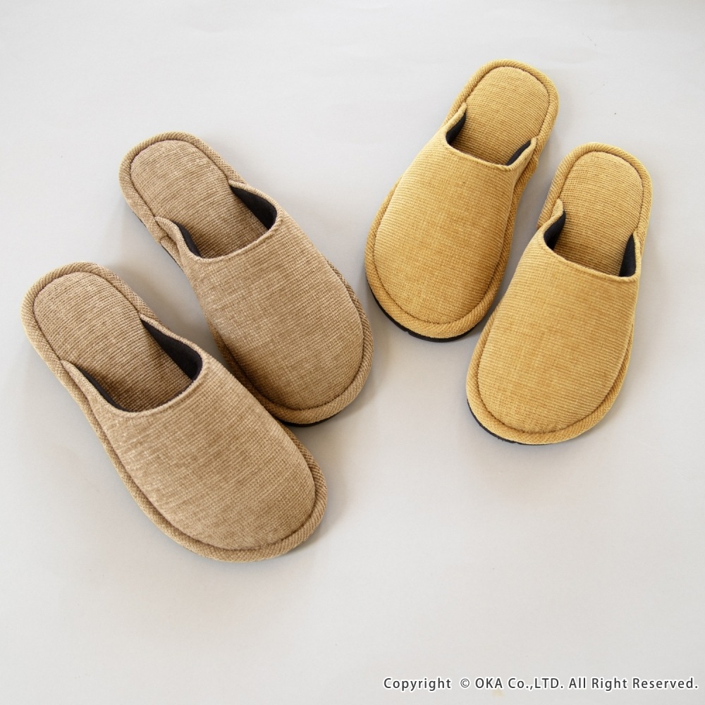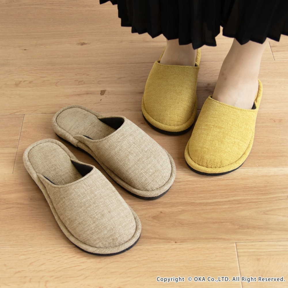 ソファのような生地感がさらりと落ち着く、まるでソファを履いているような感覚で足全体を包み込んでくれるスリッパ。 指先に向かってゆったりとしたフォルムでくつろげる履き心地です。シンプルかつ上品な発色なので、来客用にもお使いいただけます。 程よいクッション性があり、長時間の立ち仕事も足が疲れにくいです。 サイズは、MサイズとLサイズの2サイズ(サイズによってカラーは異なります)をご用意しておりますので、お揃いにお使いいただけます。新築や引っ越しのお祝いギフトにもおすすめです。丸洗い可能(洗濯ネットに入れてお洗濯してください)