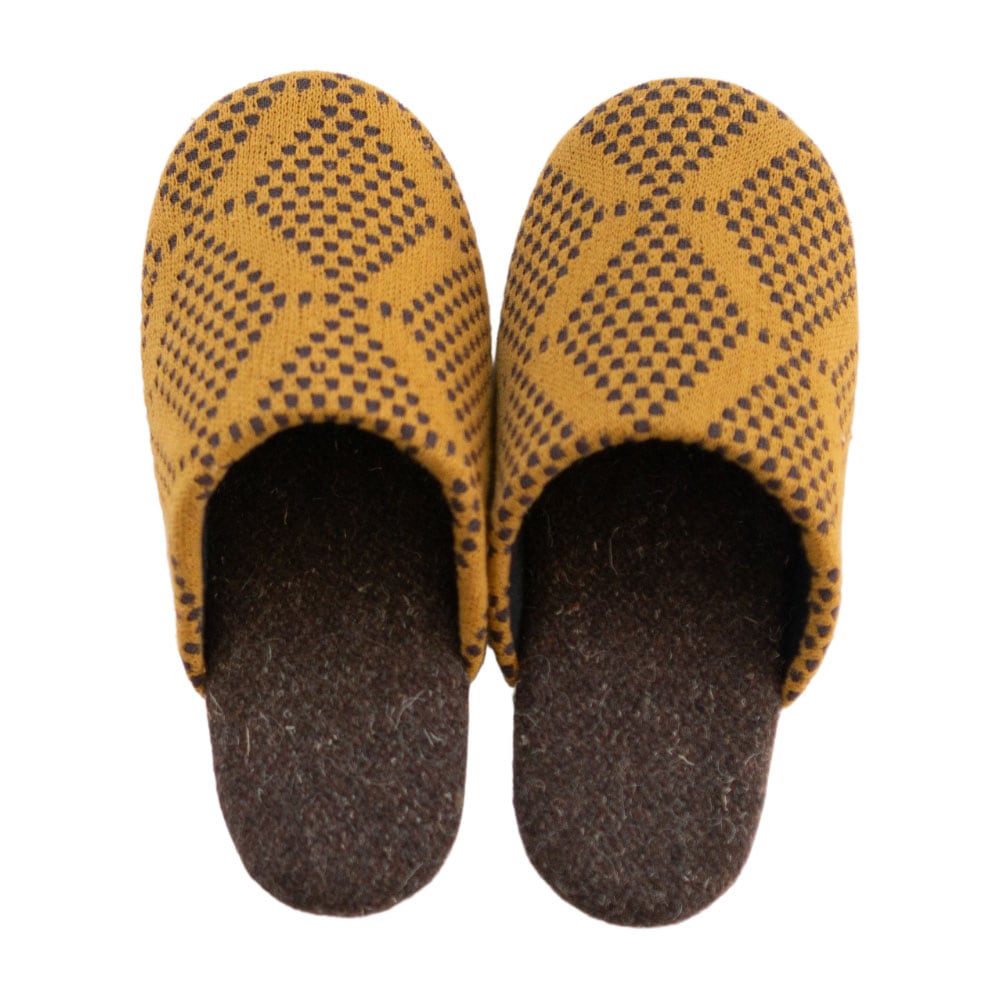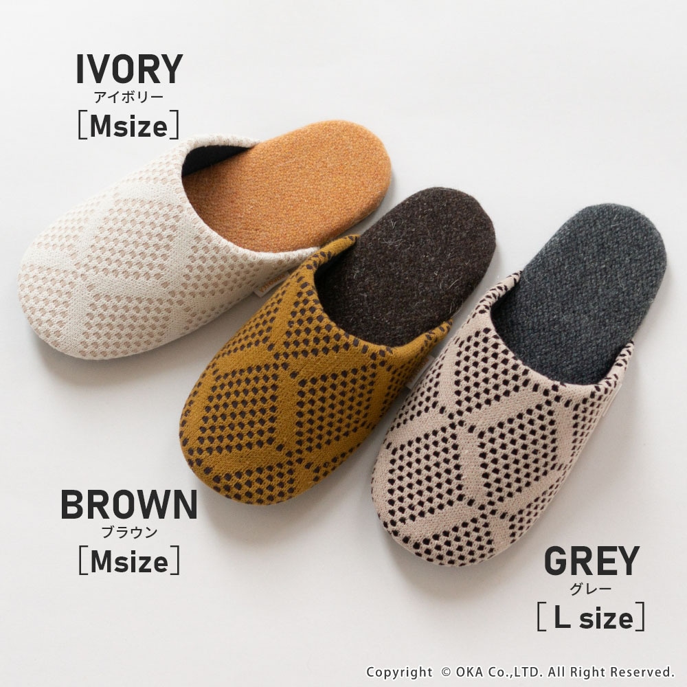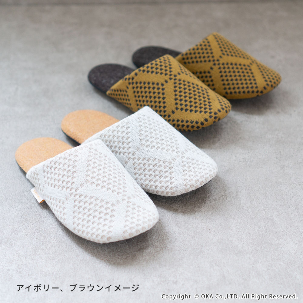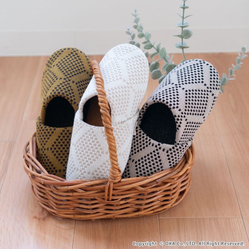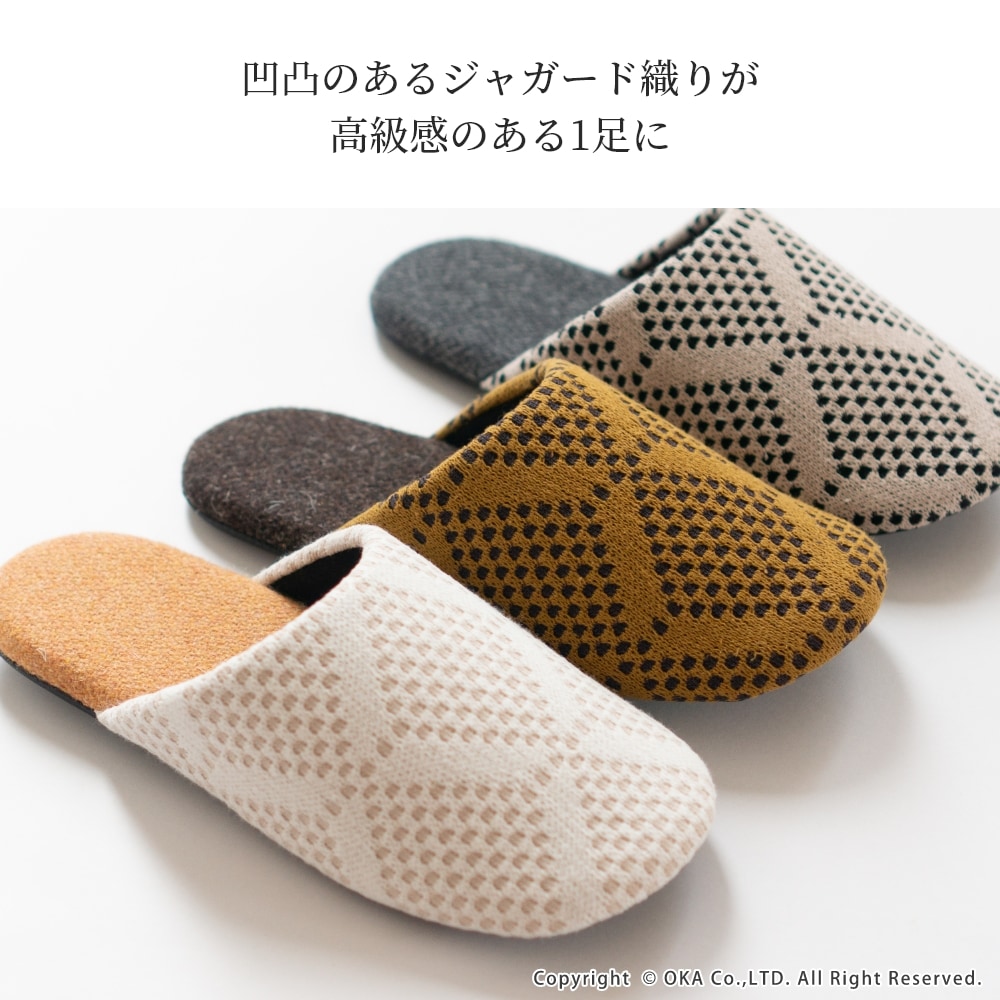 ジャガード織りの生地を使用した高級感が感じられる室内用スリッパ。秋冬におすすめしたいインソールにウールが入ったあたたかなスリッパで、細部まで丁寧な縫製仕上げになっています。履かないときにもおしゃれに見せるツートンカラーデザイン。程よいクッション性のあるかかとで歩きやすく足にフィットして歩きやすくなっています。北欧風な幾何学模様のおしゃれなデザインはギフトにもピッタリ。新築や引っ越しのお祝いギフトにもおすすめです。