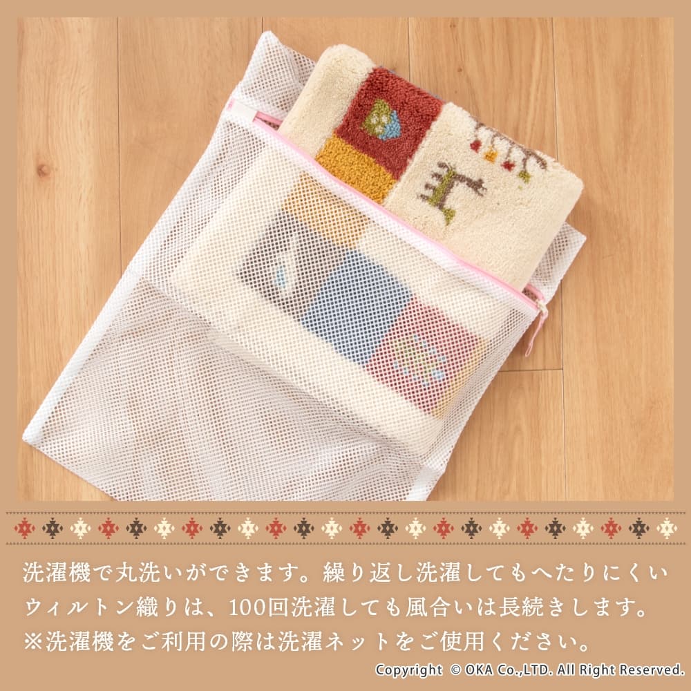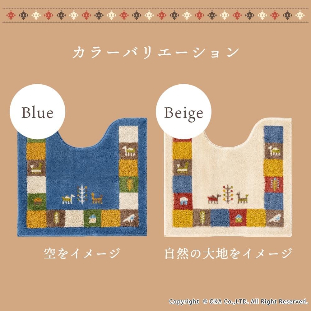 ギャベ柄でおしゃれな「シエラ」シリーズのトイレマット。シエラとは山脈を意味し、山脈周辺でギャベを織る遊牧民からイメージしたデザインです。柄の一部に、収縮糸を使い細部までこだわっています。繊細な柄が表現でき、毛立ちがいい、踏み心地がいい、日本製のウィルトン織りマットです。 洗濯ネットに入れて丸洗い可能で、繰り返しお洗濯しても抗菌防臭の効果は続きます。裏面にはすべり止め付きで、ズレにくくストレスフリー。空をイメージしたブルー、自然の大地をイメージしたベージュで、トイレ空間をエスニックテイストで彩ってくれます。