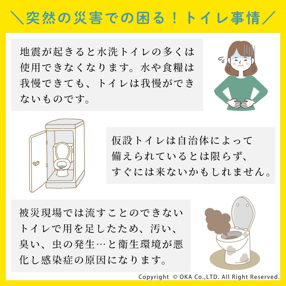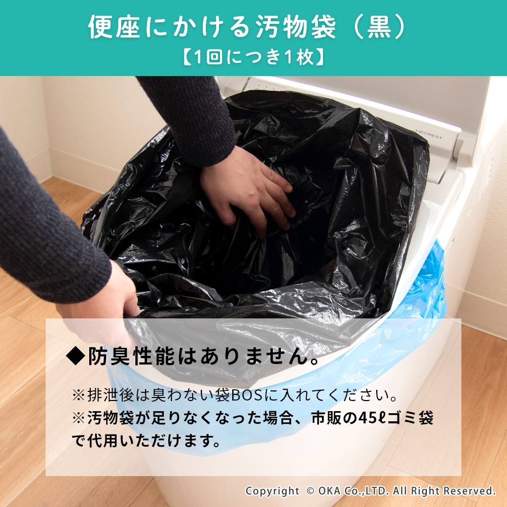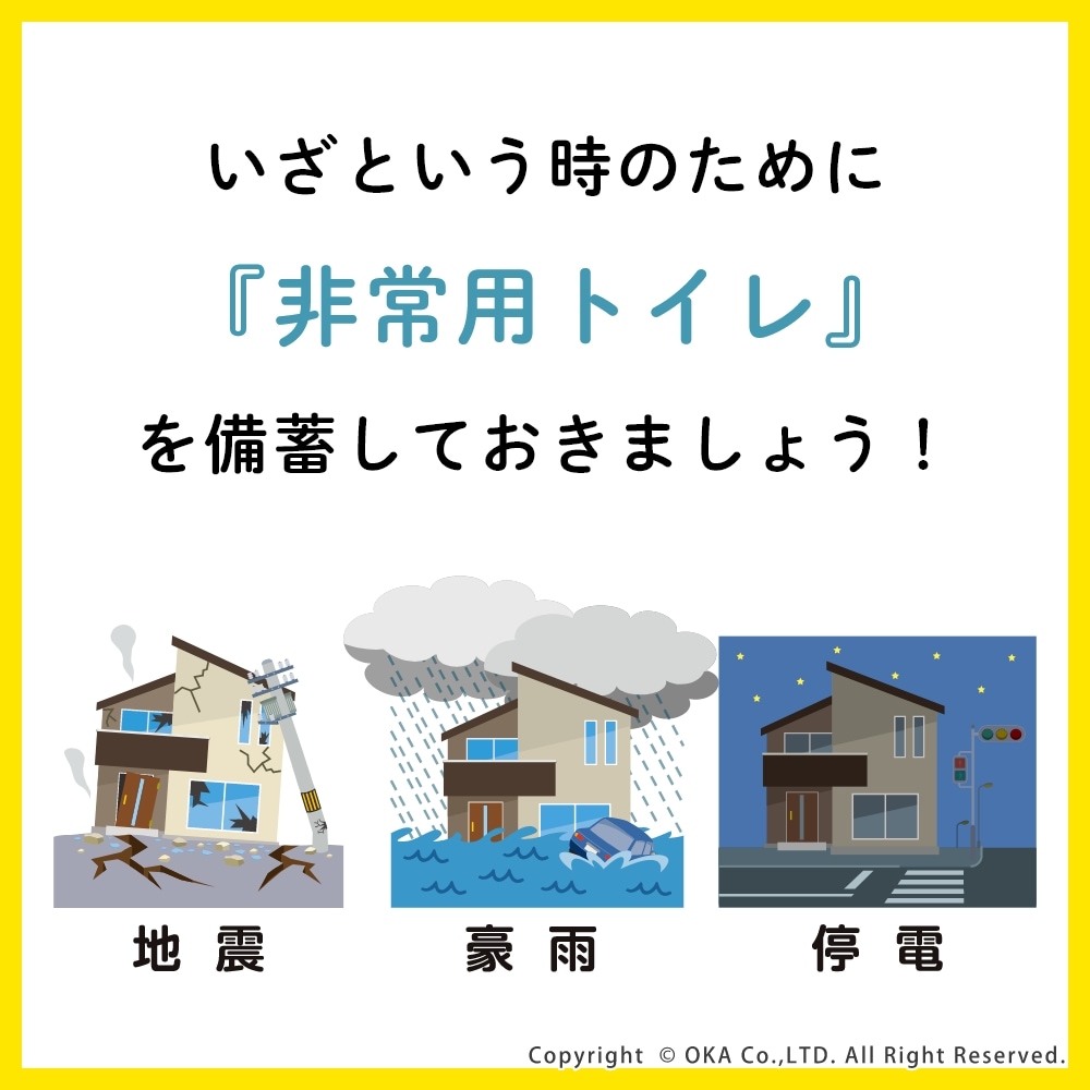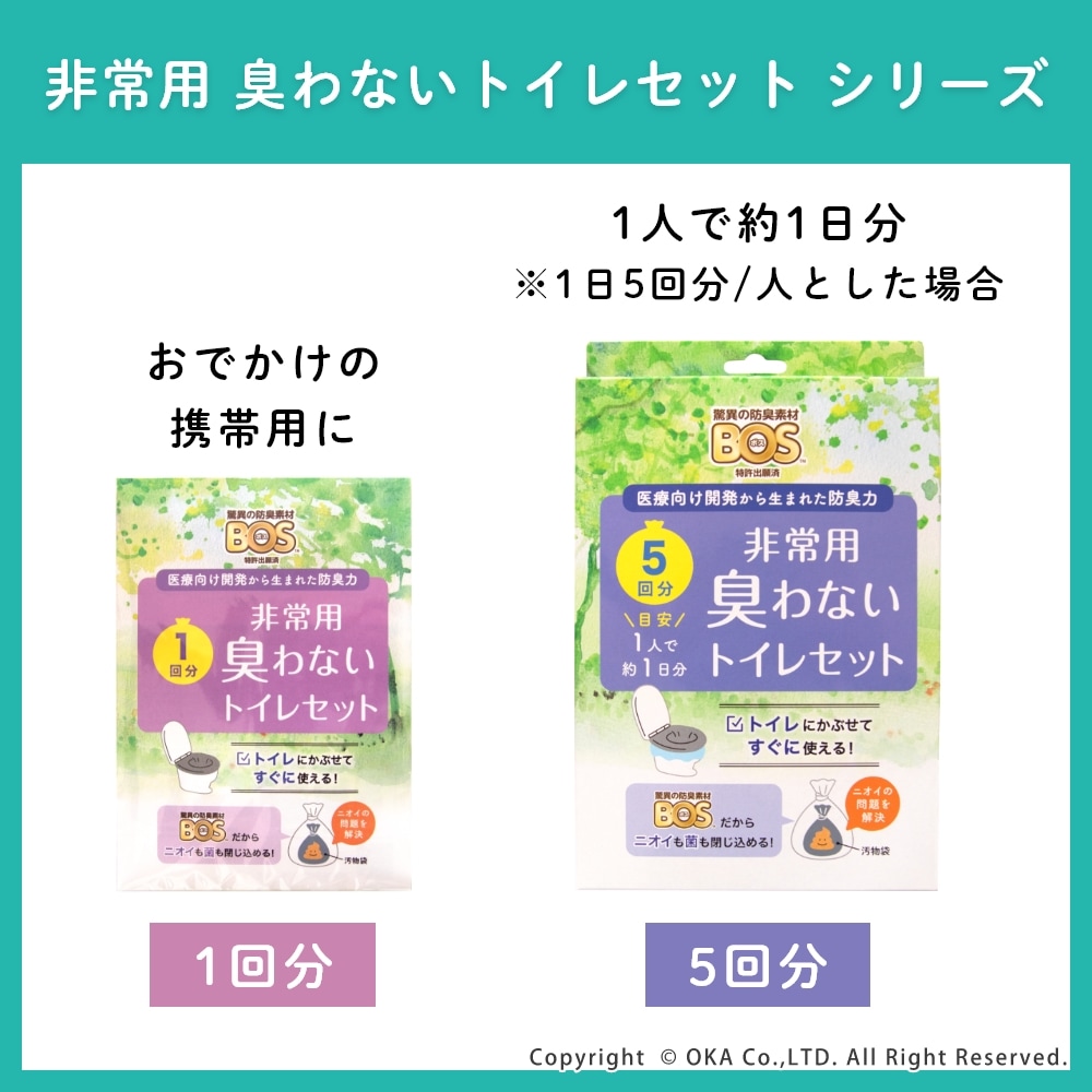 地震や台風などの突然の災害で困るトイレに、「非常用トイレ」を備蓄!非常用臭わないトイレセットは、すぐに使えて臭わない携帯用トイレです。持ち運びしやすく、かばんに入れておいたり車内の備蓄におすすめなコンパクトな5回分。水や電気がなくても今あるトイレにかぶせて使うだけで、設置も簡単です。臭わない袋BOSは驚異の防臭力で臭いをとじこめ、排泄物のニオイや菌を漏らさず衛生的です。また、日本製の凝固剤で1袋あたり約400mlの尿(成人1回の尿量は200~400ml)をしっかり固めてくれます。洋式トイレだけでなく和式トイレにもご使用いただけます。