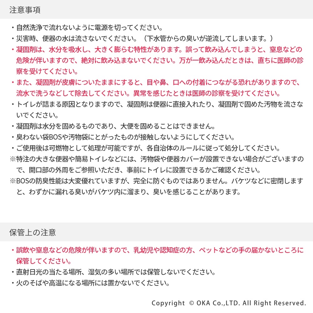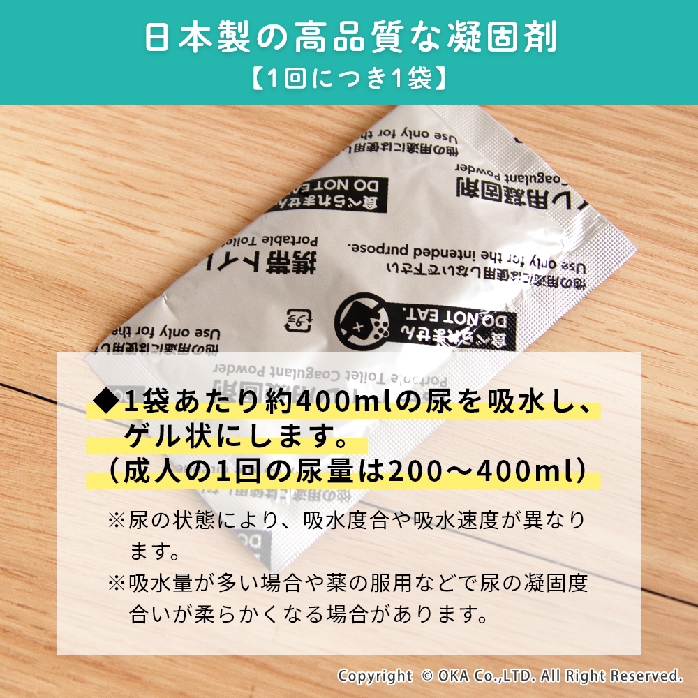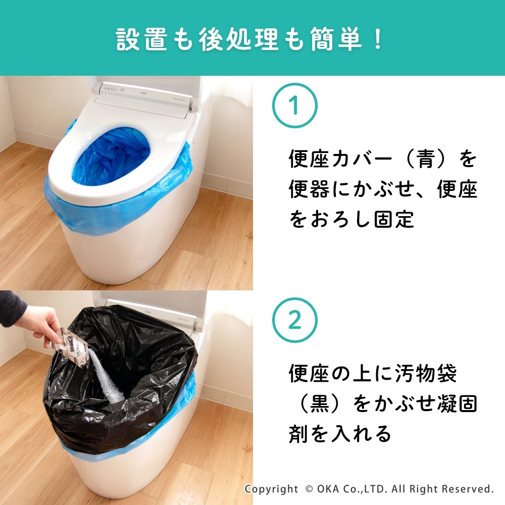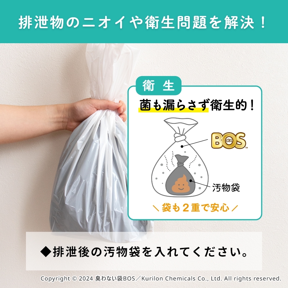 地震や台風などの突然の災害で困るトイレに、「非常用トイレ」を備蓄!非常用臭わないトイレセットは、すぐに使えて臭わない携帯用トイレです。持ち運びしやすく、かばんに入れておいたり車内の備蓄におすすめなコンパクトな5回分。水や電気がなくても今あるトイレにかぶせて使うだけで、設置も簡単です。臭わない袋BOSは驚異の防臭力で臭いをとじこめ、排泄物のニオイや菌を漏らさず衛生的です。また、日本製の凝固剤で1袋あたり約400mlの尿(成人1回の尿量は200~400ml)をしっかり固めてくれます。洋式トイレだけでなく和式トイレにもご使用いただけます。