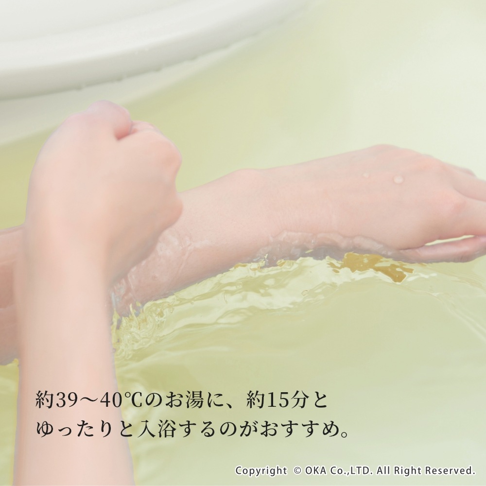 - 浴槽の湯(約200L)に対し、本品1包(50g)を入れて、よくかき混ぜてから入浴してください。 ※約39~40℃のお湯に、約15分とゆったりと入浴するのがおすすめです。
