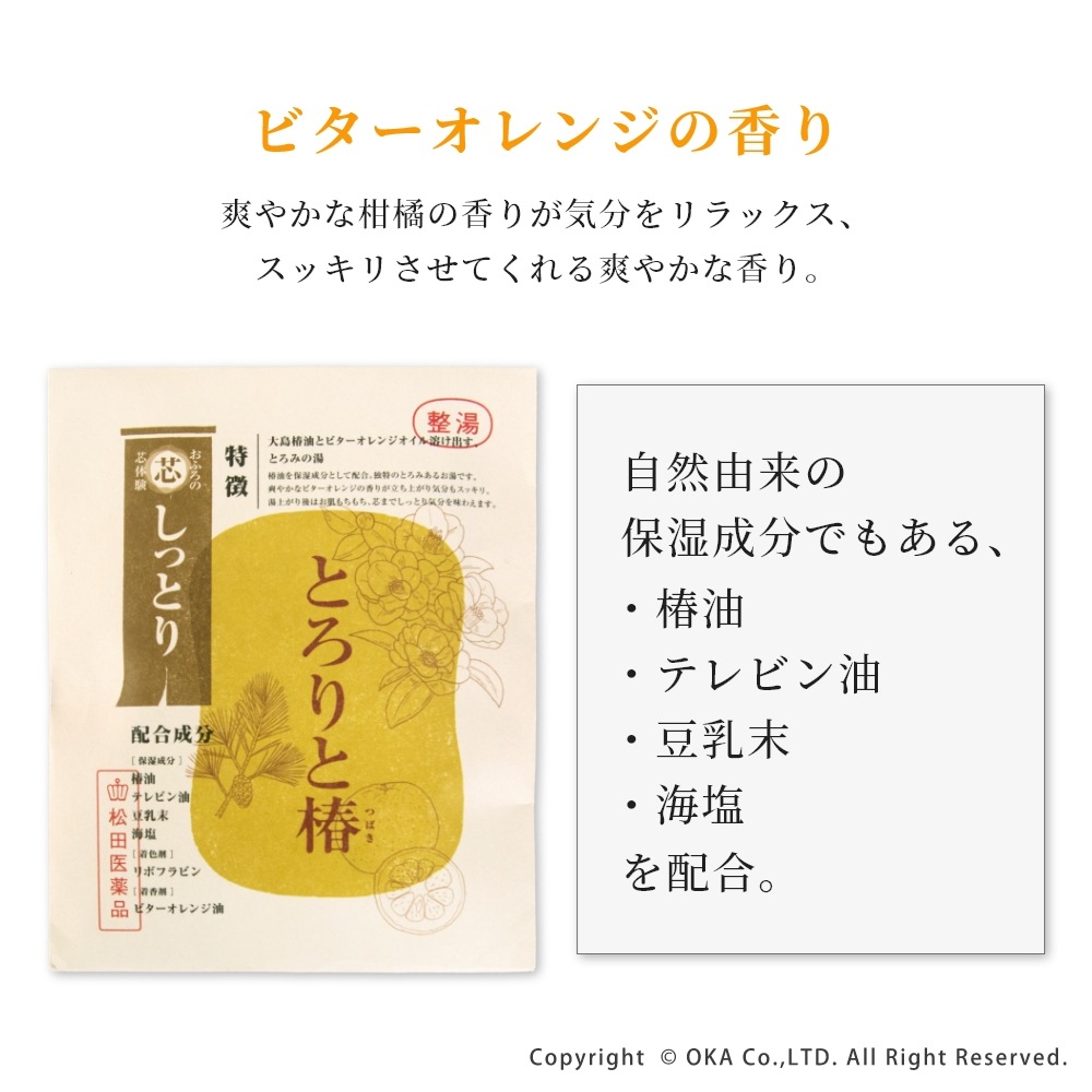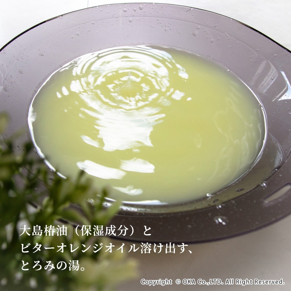 "大島椿油(保湿成分)とビターオレンジオイル溶け出す、とろみの湯"。独特のとろみある湯触りが特徴的な入浴剤です。植物由来の天然オイルとミネラルたっぷりの海塩(保湿成分)で、湯上がり後はお肌もちもち、芯までしっとりとした気分が味わえます。黄色い湯色は、ビタミンB2としても知られるリボフラビンを使用しています。爽やかな柑橘の香りが気分をリラックス、スッキリさせてくれる爽やかなビターオレンジの香りです。バスマットとご一緒にギフトにもおすすめです!