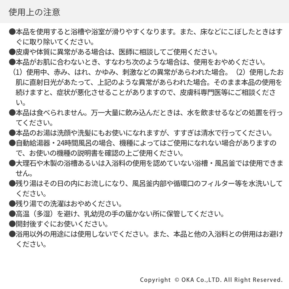 ●本品を使用すると浴槽や浴室が滑りやすくなります。また、床などにこぼしたときはすぐに取り除いてください。 ●皮膚や体質に異常がある場合は、医師に相談してご使用ください。 ●本品がお肌に合わないとき、すなわち次のような場合は、使用をおやめください。 (1)使用中、赤み、はれ、かゆみ、刺激などの異常があらわれた場合。(2)使用したお肌に直射日光があたって、上記のような異常があらわれた場合。そのまま本品の使用を続けますと、症状が悪化させることがありますので、皮膚科専門医等にご相談ください。 ●本品は食べられません。万一大量に飲み込んだときは、水を飲ませるなどの処置を行ってください。 ●本品のお湯は洗顔や洗髪にもお使いになれますが、すすぎは清水で行ってください。 ●自動給湯器・24時間風呂の場合、機種によってはご使用になれない場合がありますので、お使いの機種の説明書を確認の上ご使用ください。 ●大理石や木製の浴槽あるいは入浴料の使用を認めていない浴槽・風呂釜では使用できません。 ●残り湯はその日の内にお流しになり、風呂釜内部や循環口のフィルター等を水洗いしてください。 ●残り湯での洗濯はおやめください。 ●高温(多湿)を避け、乳幼児の手の届かない所に保管してください。 ●開封後すぐにお使いください。 ●浴用以外の用途には使用しないでください。また、本品と他の入浴料との併用はお避けください。 |