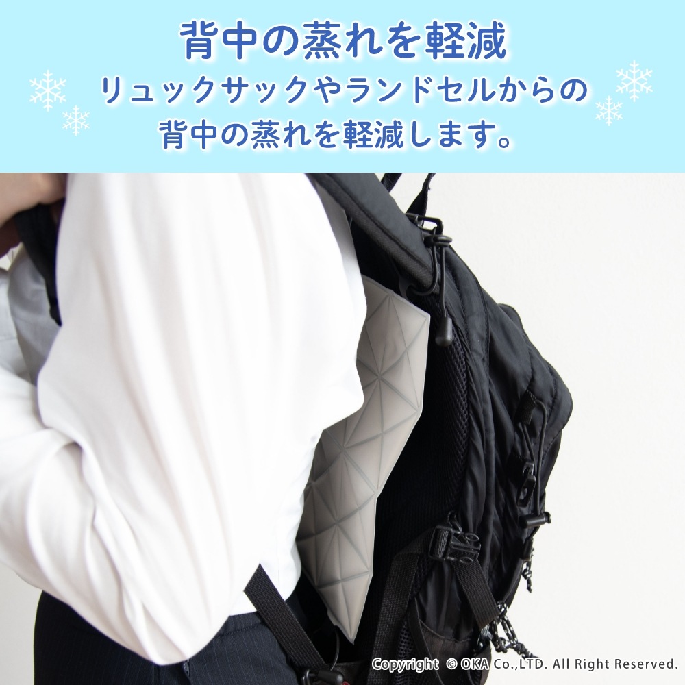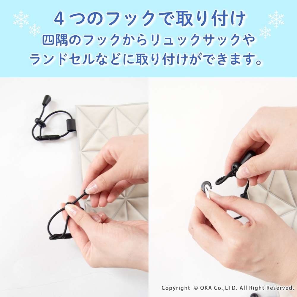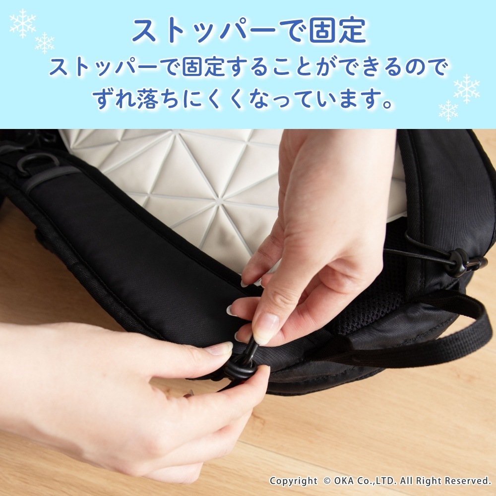 熱中症対策にもおすすめ!体感温度約-8℃、約28℃以下で凍り、繰り返し使えるアイスパッド。暑い季節の通勤通学でのリュック・ランドセルの背中に、ベビーカーや車や椅子のシートにも敷いても蒸れにくく、ひんやり快適に過ごすことができます。4箇所のフックで簡単にリュックに取り付けられて、ストッパーで固定できるのでズレ落ちにくくなっています。リバーシブルでグレーまたはブラックのどちらかにお好みで合わせることができます。28℃以下の環境になると自然に凍結し、軟化してきたら28℃以下の環境に置くことで再度凍結するので冷たさが長持ちしやすいです。冷やし方は冷水や氷水で約20~30分、冷蔵庫で約15~20分、冷房で約20分で冷たくなります。
