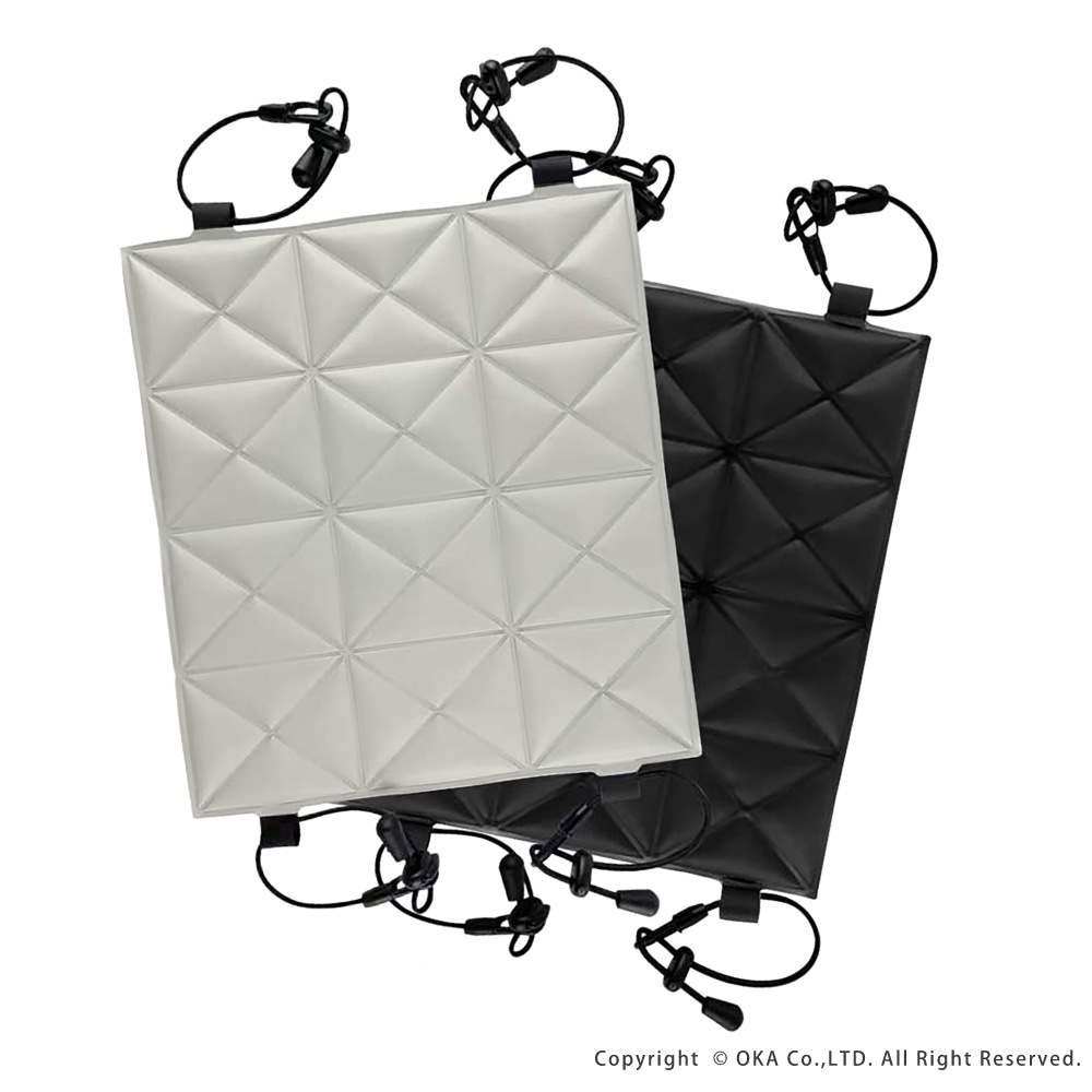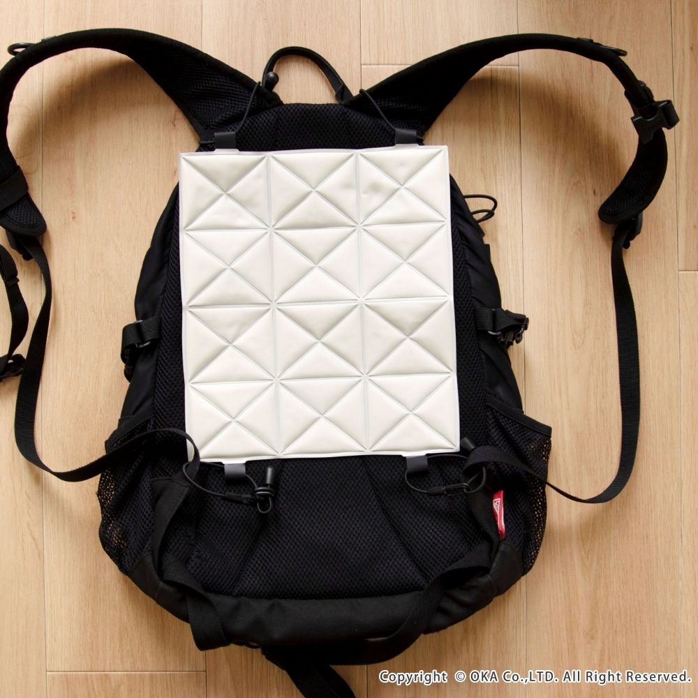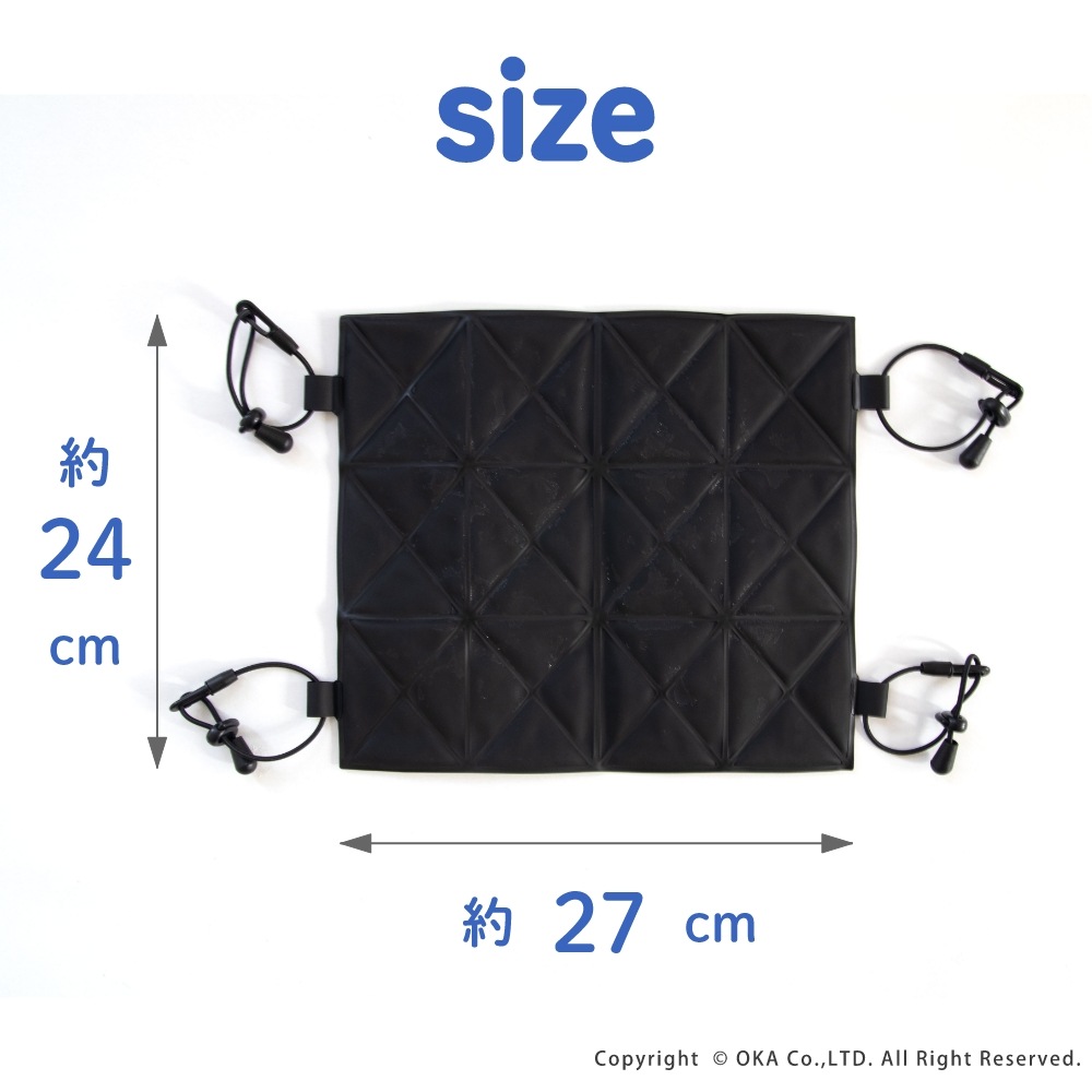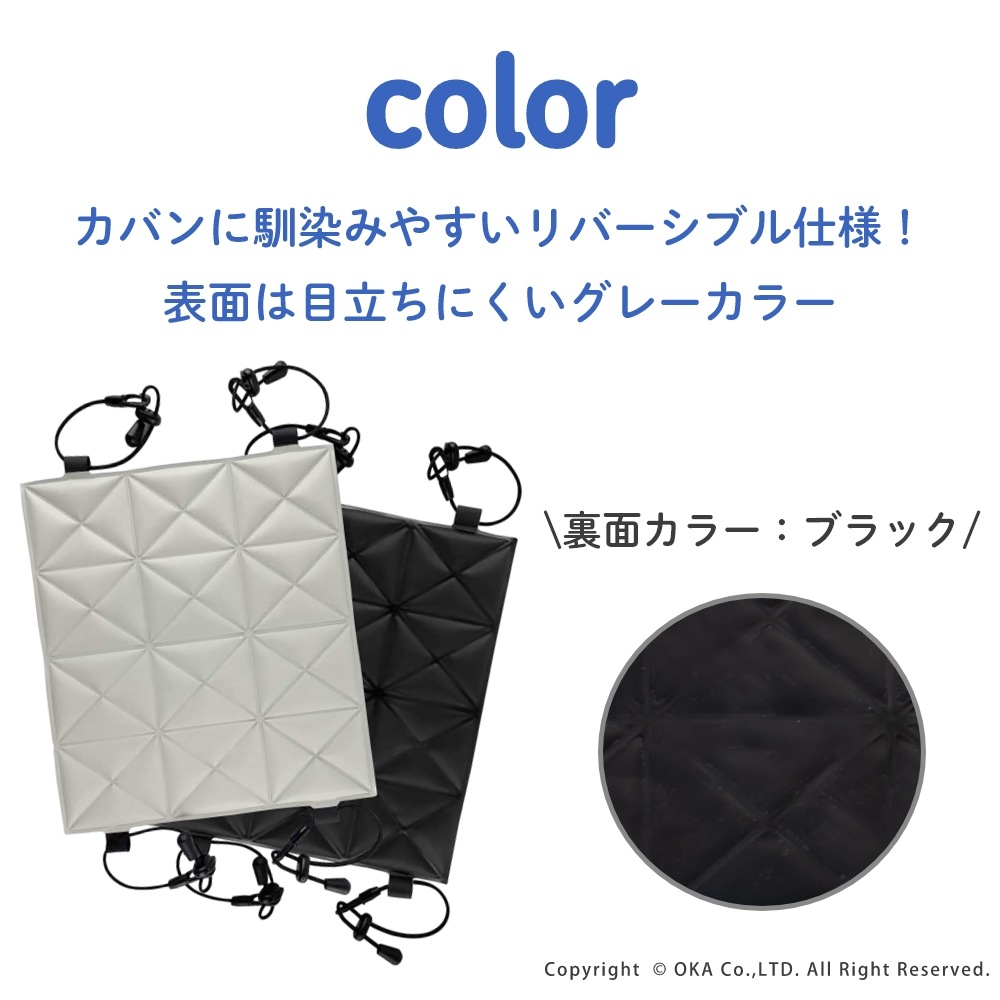 熱中症対策にもおすすめ!体感温度約-8℃、約28℃以下で凍り、繰り返し使えるアイスパッド。暑い季節の通勤通学でのリュック・ランドセルの背中に、ベビーカーや車や椅子のシートにも敷いても蒸れにくく、ひんやり快適に過ごすことができます。4箇所のフックで簡単にリュックに取り付けられて、ストッパーで固定できるのでズレ落ちにくくなっています。リバーシブルでグレーまたはブラックのどちらかにお好みで合わせることができます。28℃以下の環境になると自然に凍結し、軟化してきたら28℃以下の環境に置くことで再度凍結するので冷たさが長持ちしやすいです。冷やし方は冷水や氷水で約20~30分、冷蔵庫で約15~20分、冷房で約20分で冷たくなります。