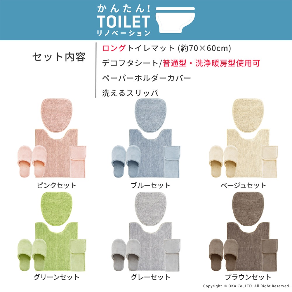 コクーン トイレ4点セット ( ロングトイレマット+トイレデコフタシート+スリッパ+ホルダーカバー )(洗える 裏面すべり止め 無地 シンプル ナチュラル 北欧 風水 レギュラーサイズ )