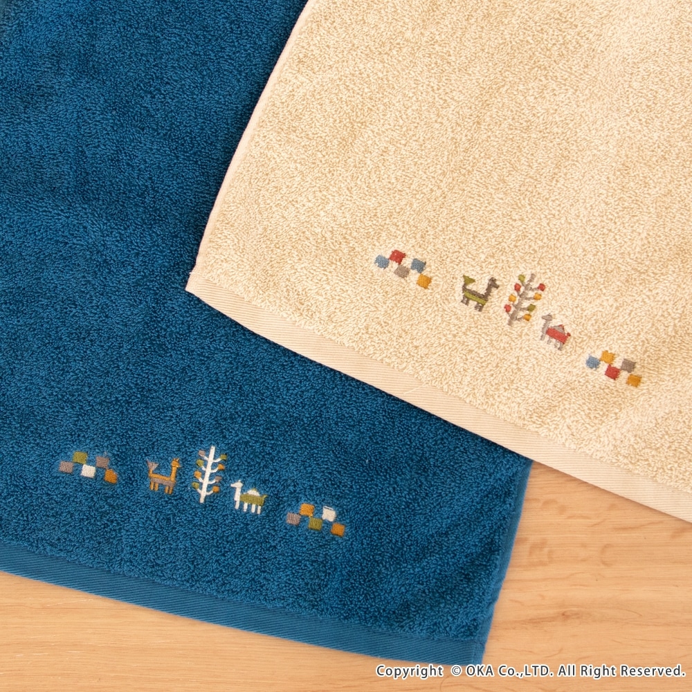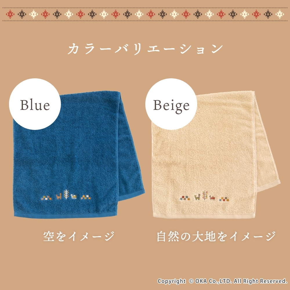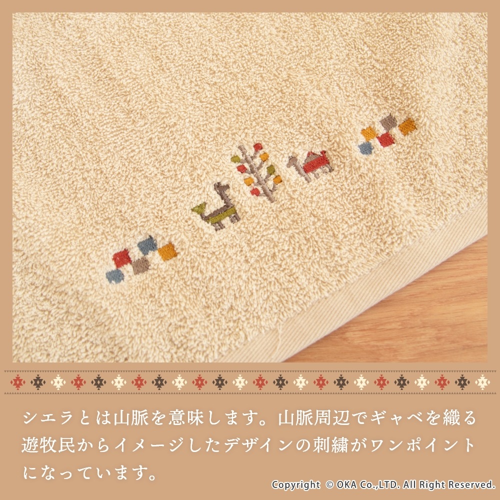 ギャベ柄でおしゃれな「シエラ」シリーズのタオル。シエラとは山脈を意味し、山脈周辺でギャベを織る遊牧民からイメージした可愛いデザインが刺繍で描かれています。ふんわりとしているのは、綿100%で長めのパイルがぎっしりつまっているから。 繰り返しのお洗濯にも耐える丈夫なタオルです。空をイメージしたブルー、自然の大地をイメージしたベージュで、お部屋の空間をエスニックテイストで彩ってくれます。