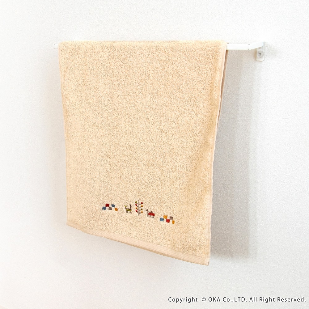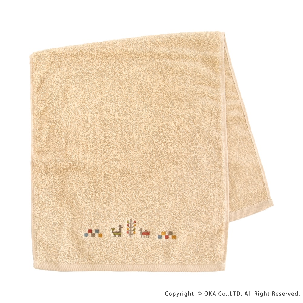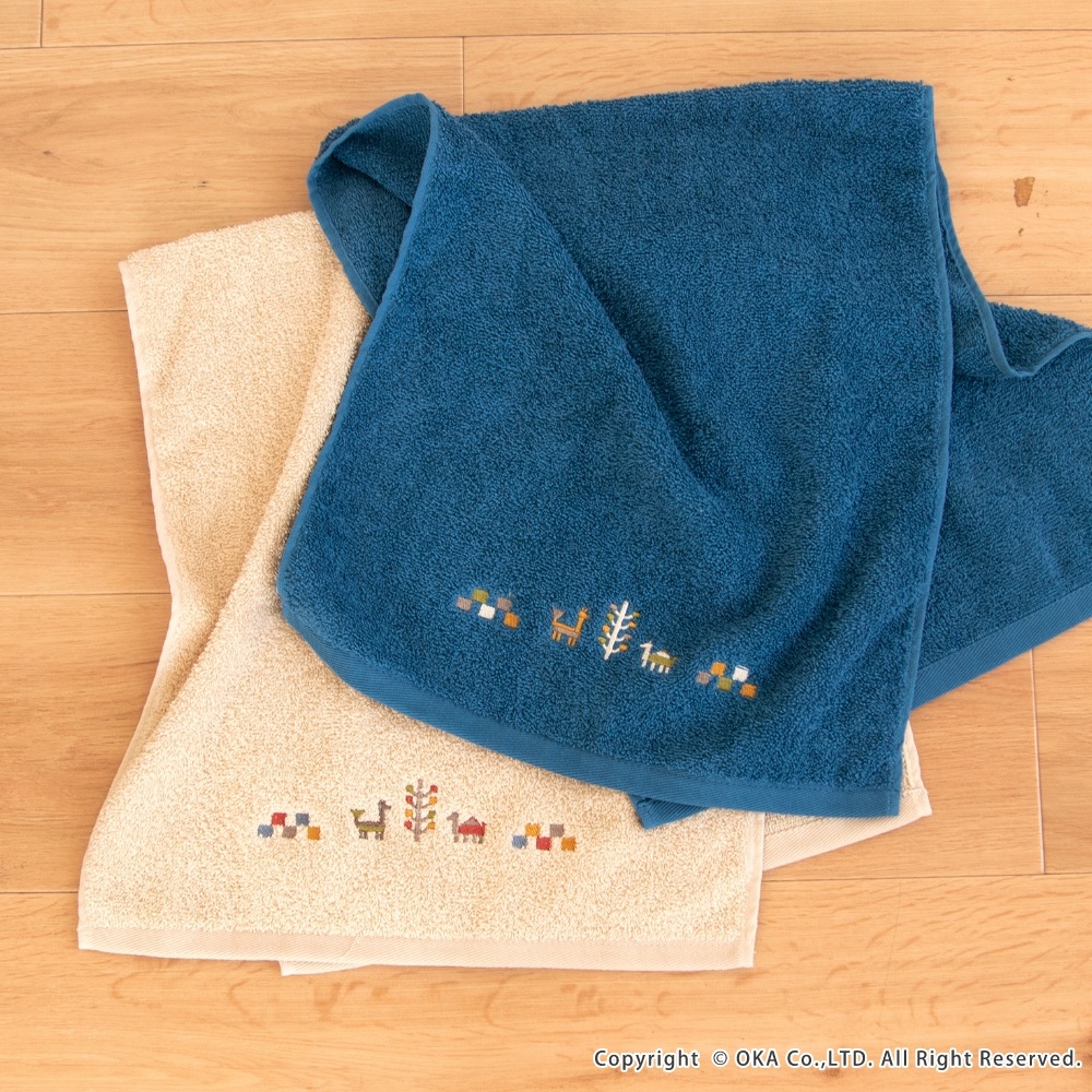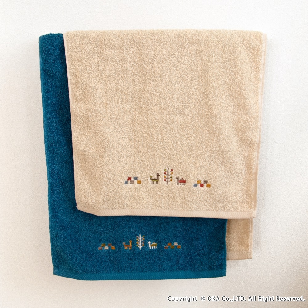 ギャベ柄でおしゃれな「シエラ」シリーズのタオル。シエラとは山脈を意味し、山脈周辺でギャベを織る遊牧民からイメージした可愛いデザインが刺繍で描かれています。ふんわりとしているのは、綿100%で長めのパイルがぎっしりつまっているから。 繰り返しのお洗濯にも耐える丈夫なタオルです。空をイメージしたブルー、自然の大地をイメージしたベージュで、お部屋の空間をエスニックテイストで彩ってくれます。