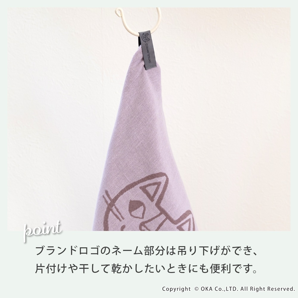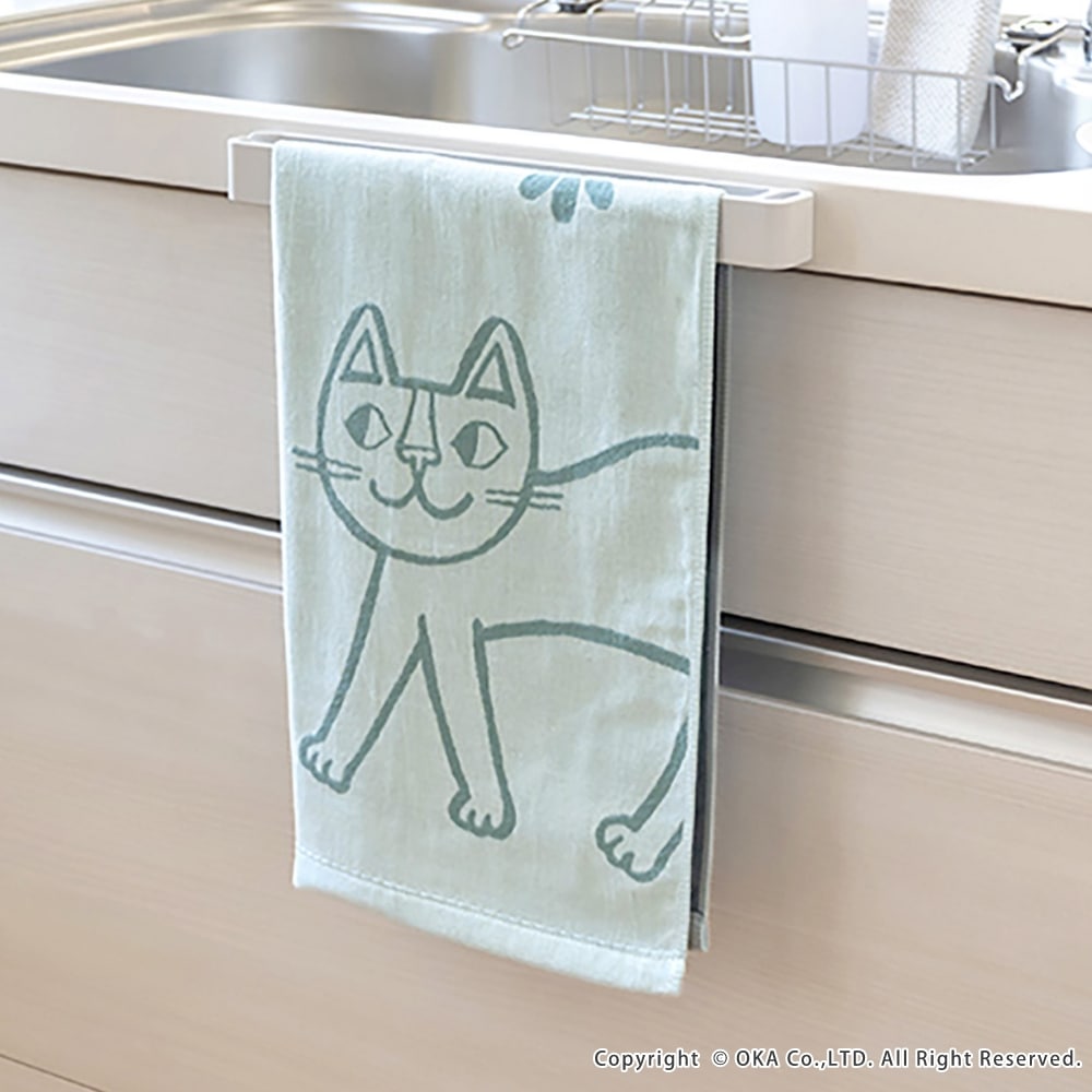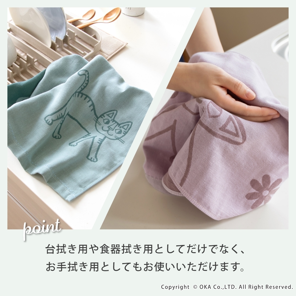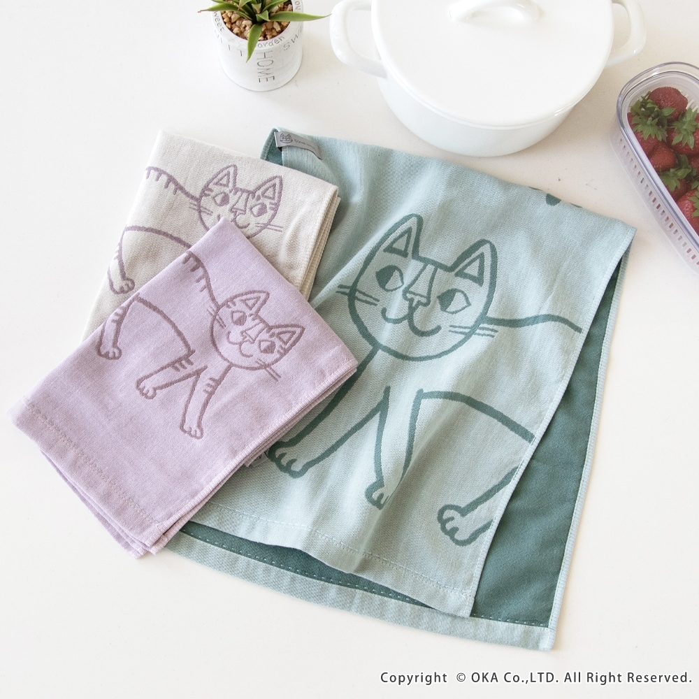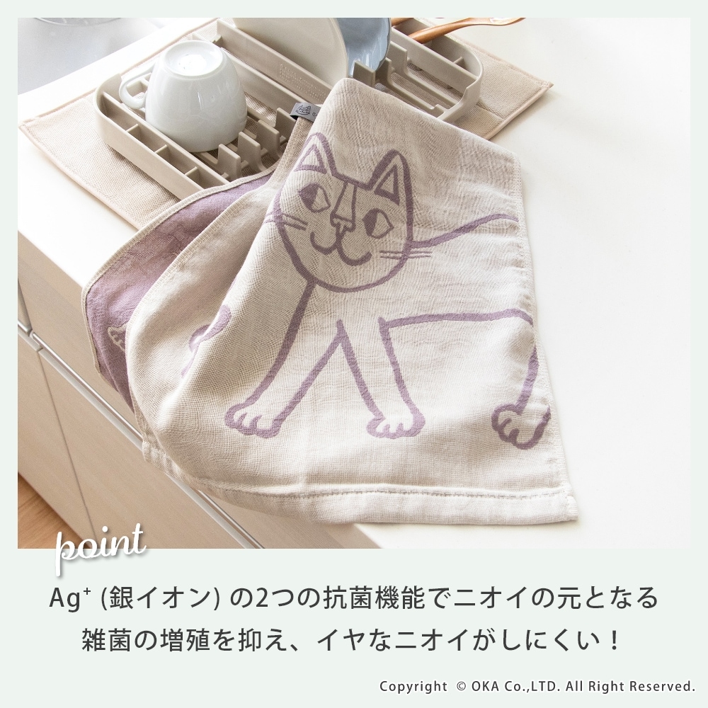 ねこ画家、おかべてつろう先生のねこのイラストを二重ガーゼのジャガード織りで表現したキッチンタオル。Ag+(銀イオン)がふきんについた雑菌を<直接抗菌+光触媒抗菌>のダブル抗菌!Ag+(銀イオン)を繊維自体に練り込んでいるので、100回洗濯した後も抗菌効果は持続します。<直接抗菌>繊維に練り込んだAg+(銀イオン)が付着した雑菌の増殖を抑えます。<光触媒抗菌>Ag+(銀イオン)に太陽や蛍光灯の光が当たると、触媒作用により抗菌機能を発揮します。だからイヤなニオイがしにくく、キッチンでも清潔にお使いいただけます。親子のねこが楽しくお散歩している情景が目に浮かぶデザインになっています。カラーはシックでおしゃれな3色です。キッチンに置いても引き立ち、キッチンワークが楽しくなります。乾きが早く、手になじむやわらかさで、かわいい上に使い心地にも優れています。パッケージにはおかべてつろう先生のイラスト「森のレストラン」を採用し、ギフトにもおすすめです!