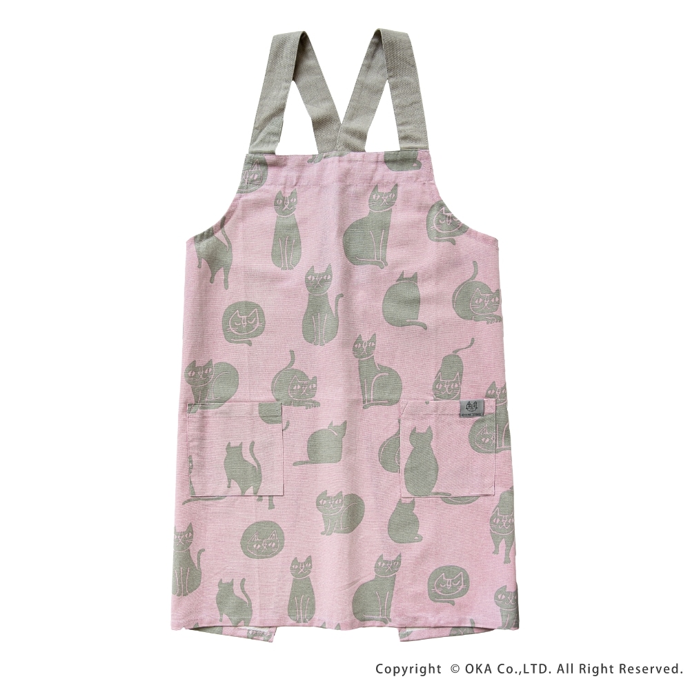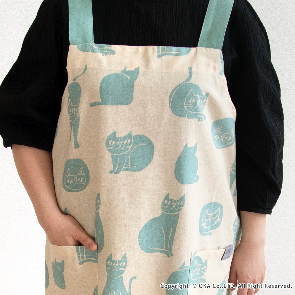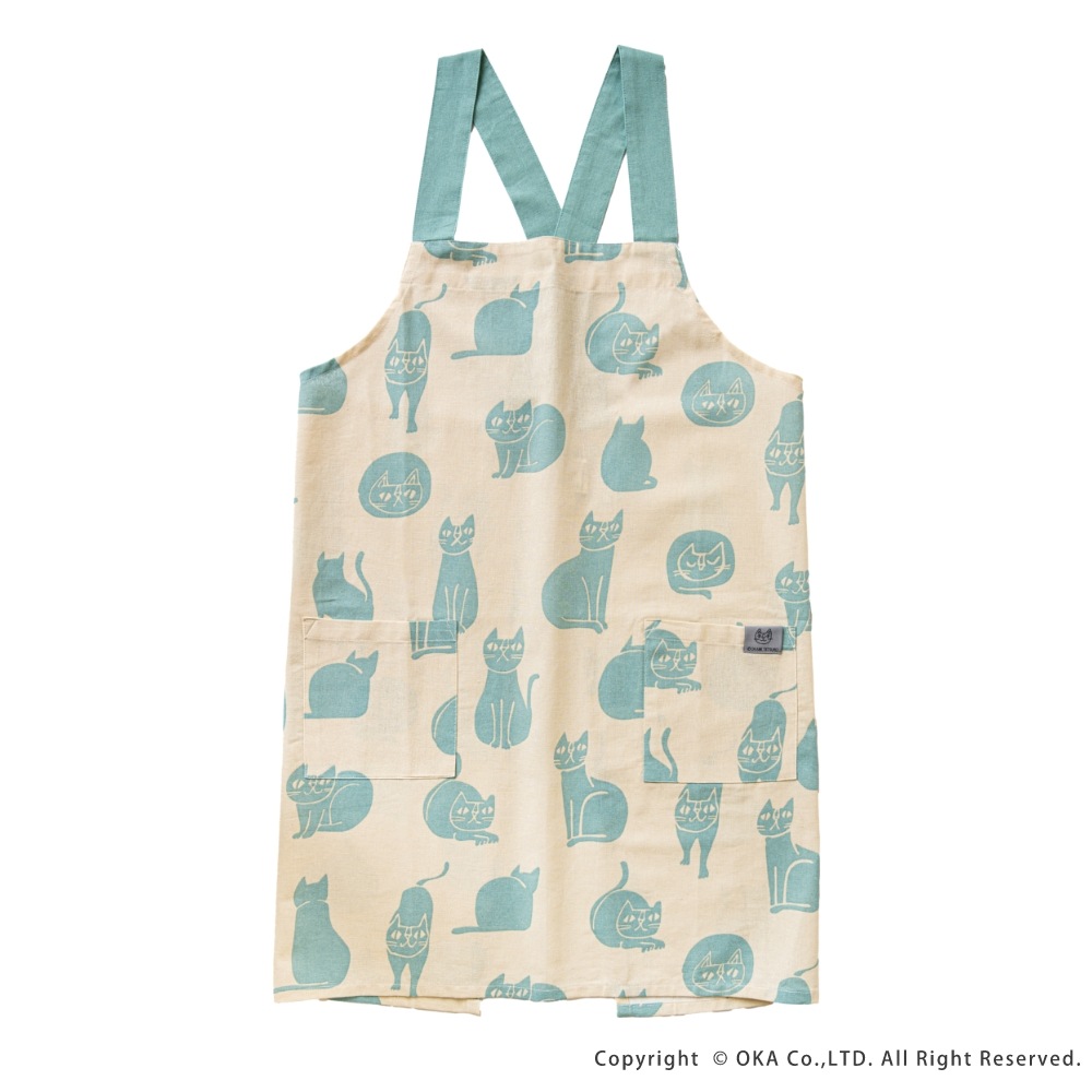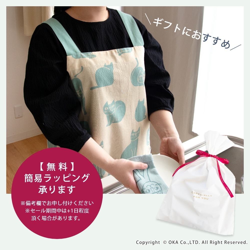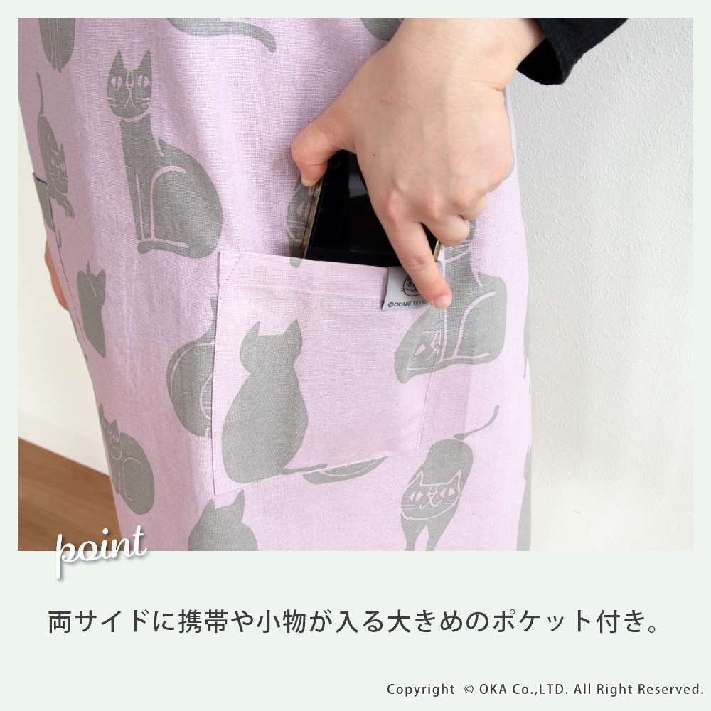 ねこ画家、おかべてつろう先生のねこのイラストが、かわいいエプロンに。着るだけで楽しくなる、ねこのシルエットがいっぱいのデザインです。 紐を結んだりする手間がなく、かぶるだけで簡単に脱着できます。また、コットン100%とさらりとした生地感でナチュラルな手触り、季節を問わず快適な着心地です。エプロンの両サイドにはスマホが入る大きめのポケットがついており、とても便利な仕様になっています。汚れても、洗濯機で手軽に洗うことができます。 ラベルにはおかべてつろう先生のイラスト「森のレストラン」を採用し、ギフトにも可愛くおすすめです!