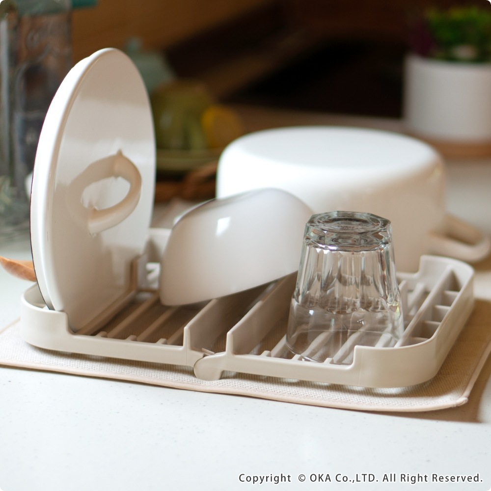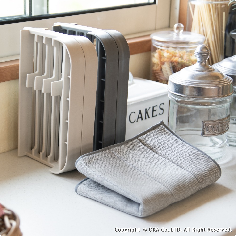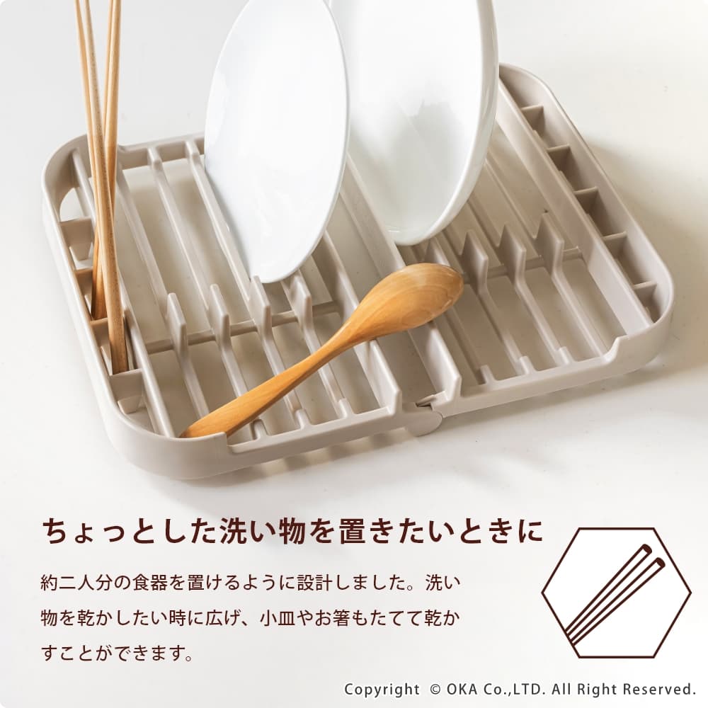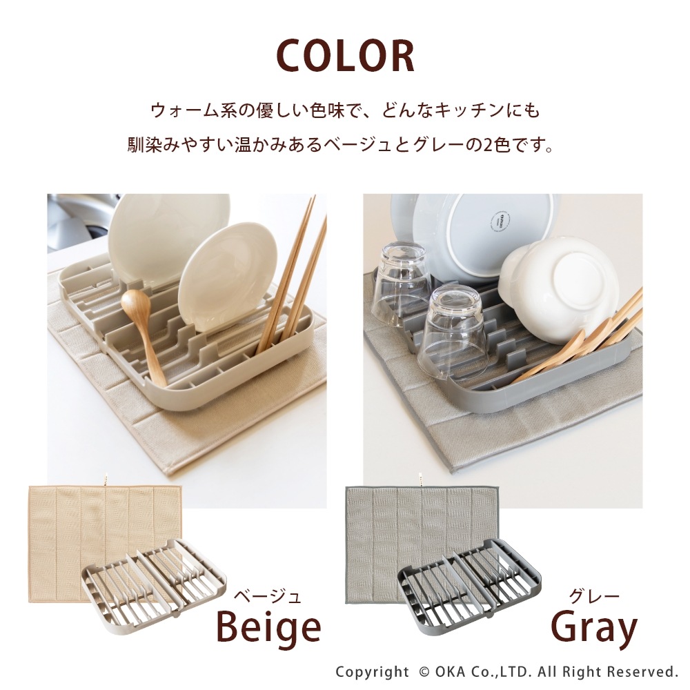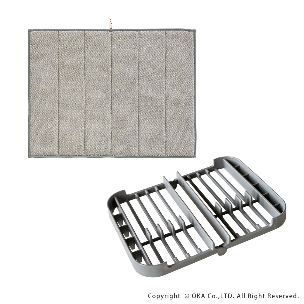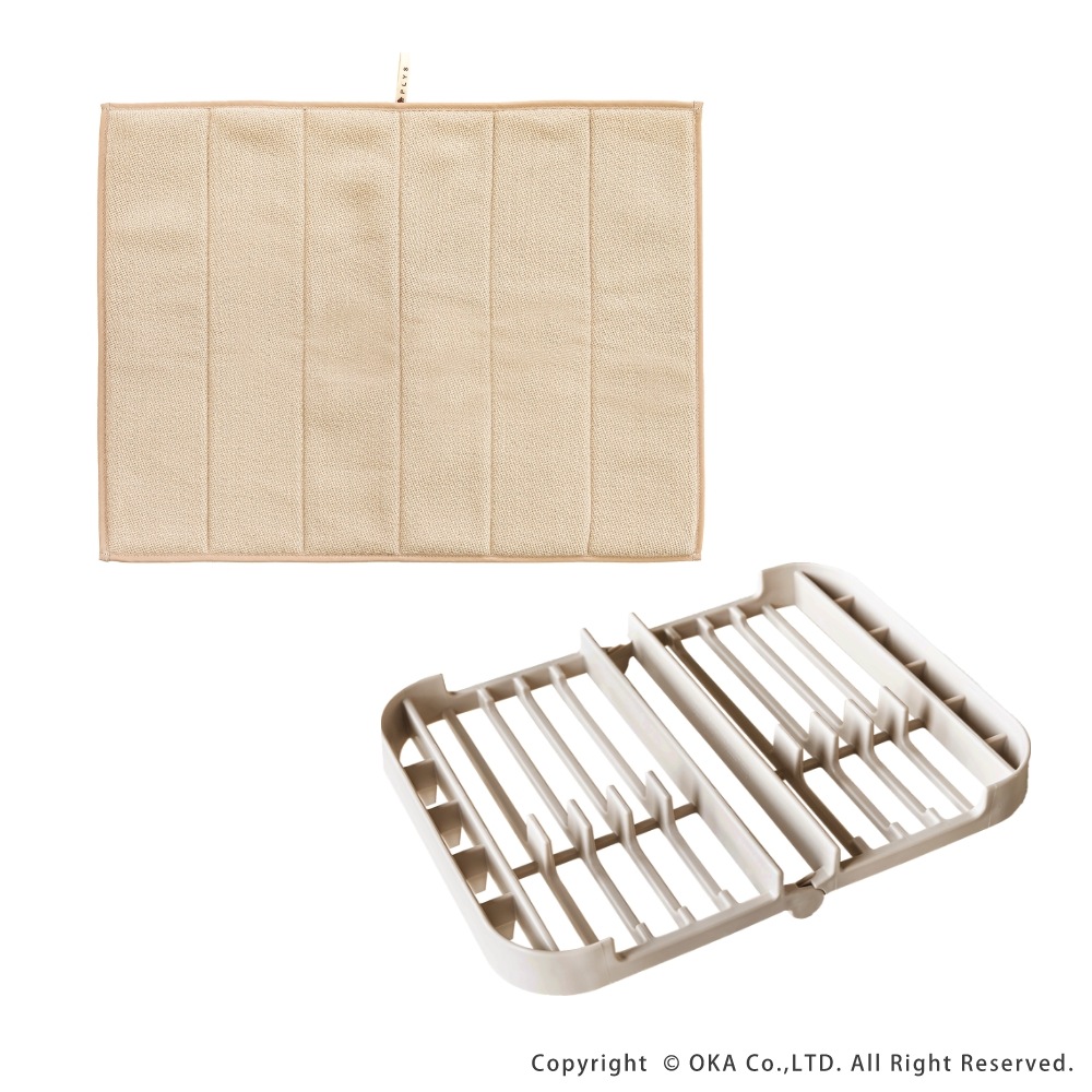 毎日の洗い物をもっと快適に、もっと気持ちよく。ちょっとした洗い物を干したい時に役立つ「プリスベイス 水切りセット」。吸水マットは、表面に「梅炭和紙」を使用した生地を使用し、サラサラでにおわない。梅炭和紙は、優れた消臭効果をもち、気になるニオイも抑え、キッチンを常に清潔に保ちます。 ラックは、お皿やお椀をしっかり立てられる構造で、お箸やスプーンなども立てて乾かすことができます。ラック本体が食洗機で洗えるため、汚れてもお手入れが簡単で衛生的です。2人分の食器をしっかり乾かせるため、一人暮らしや二人暮らしの方はもちろん、3人以上のご家族でも、「食洗機にかけるほどでもない、ちょっとした洗い物をサッと済ませたい」といった食洗機との併用や、「食洗機に入りきらなかった食器を乾燥させたい」といった時にもとても便利です。 カラーはベージュとグレーの2色展開。どちらも、優しく落ち着いた色合いでどんなキッチンにも馴染みやすい、洗練されたデザインに仕上がっています。