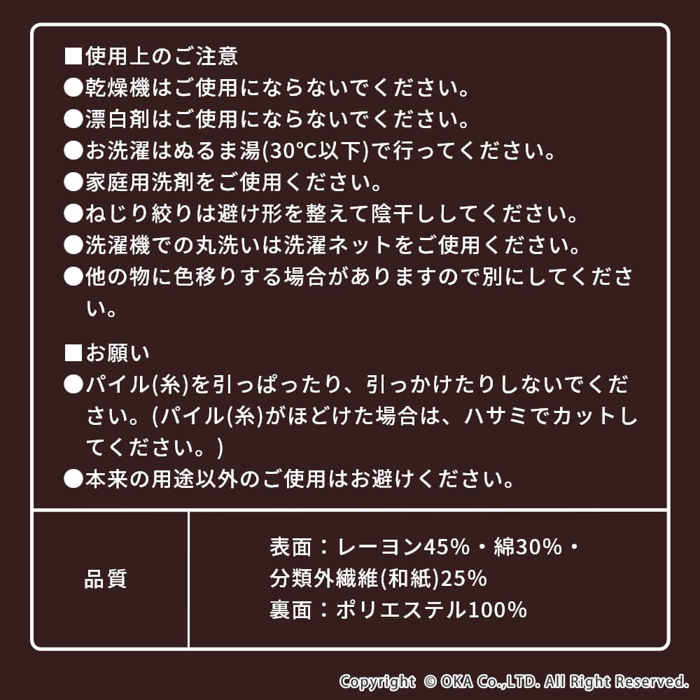 - 表面:レーヨン45%・綿30%・分類外繊維(和紙)25%、裏面:ポリエステル100%