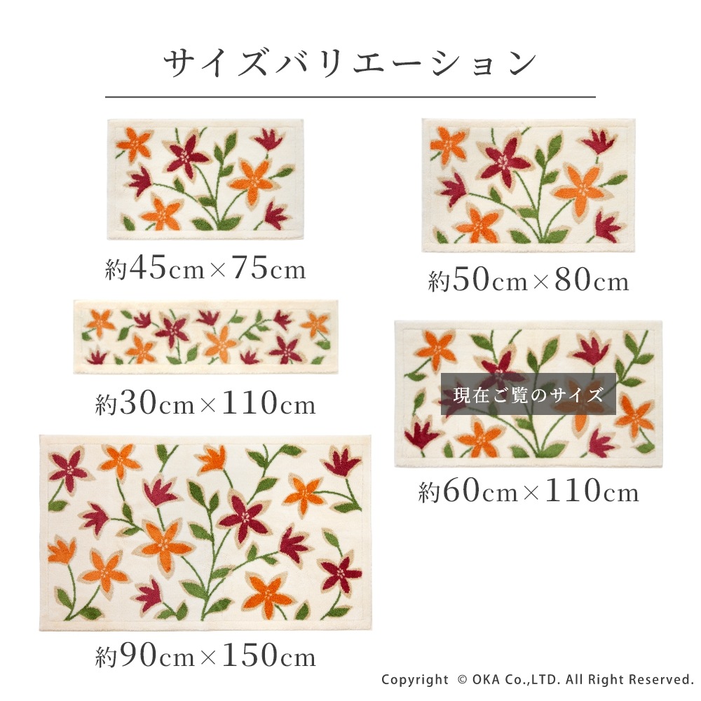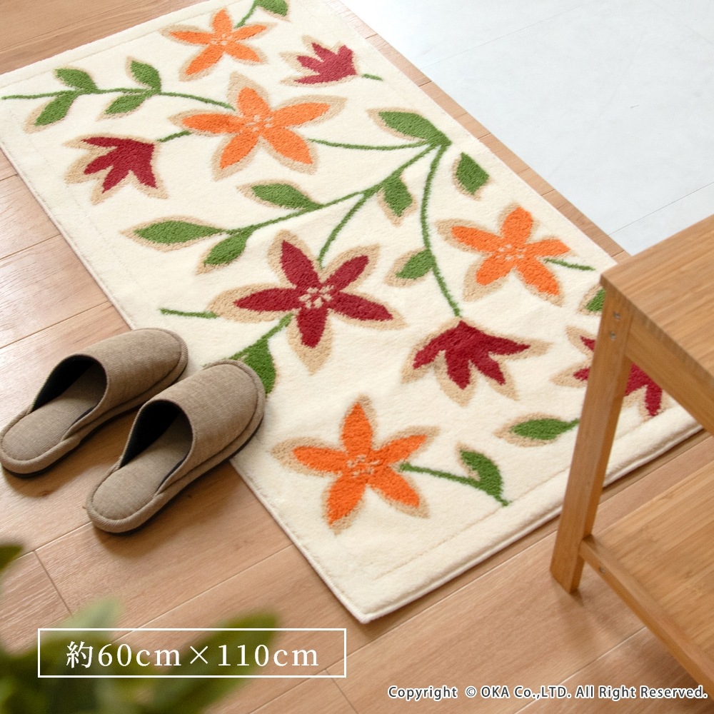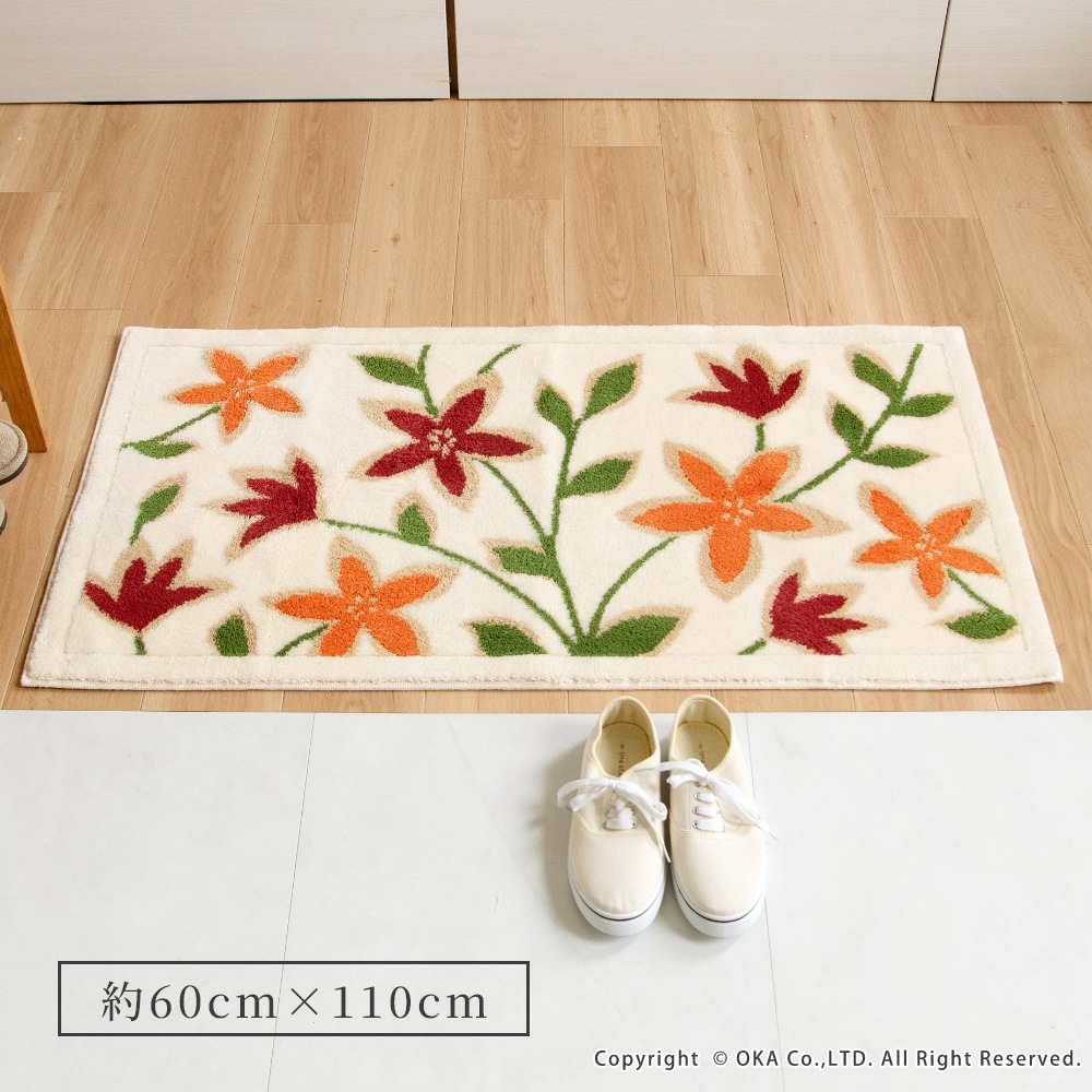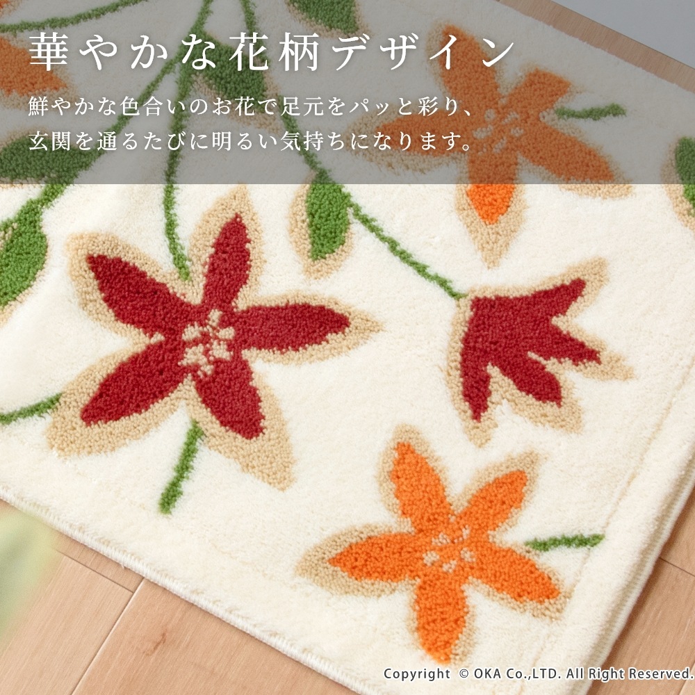 洗えるコーナー吸着玄関マットパシオーネ 約60cm×110cm ( 日本製 洗える 大判 風水 花柄 植物 北欧 オレンジ )