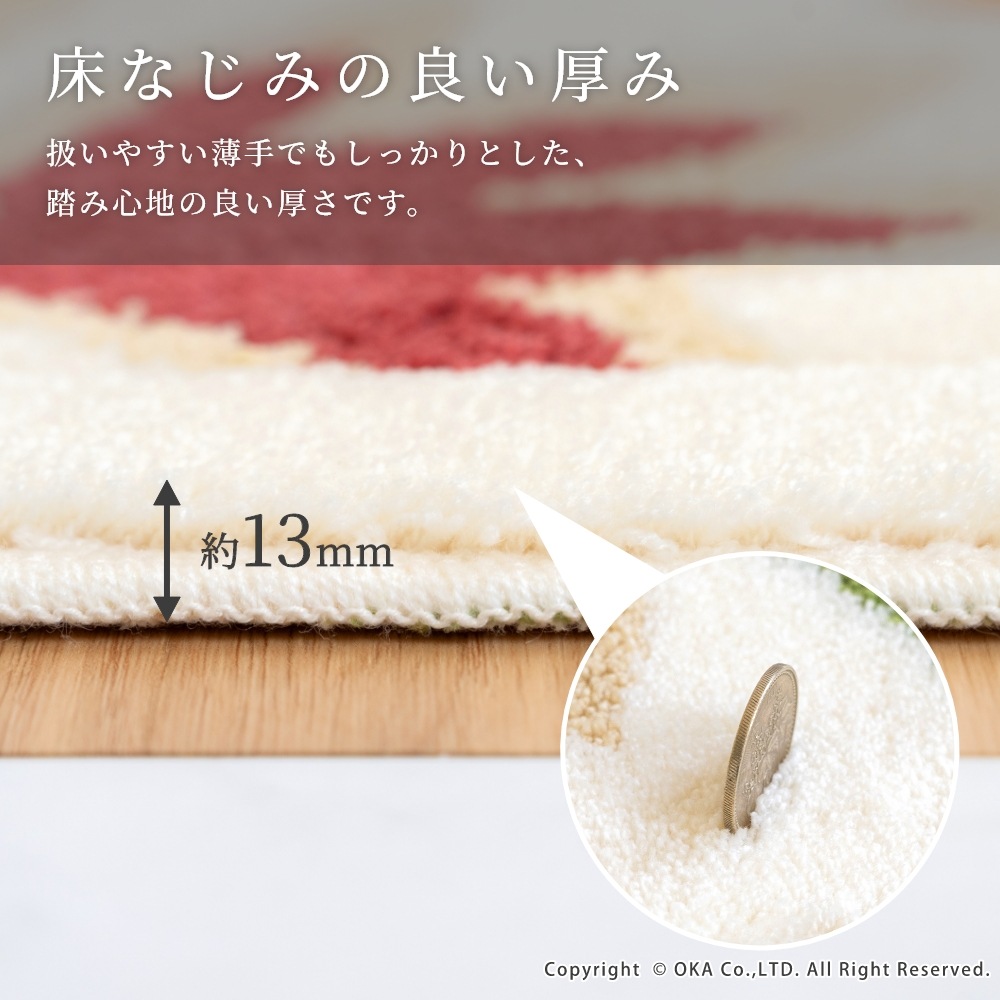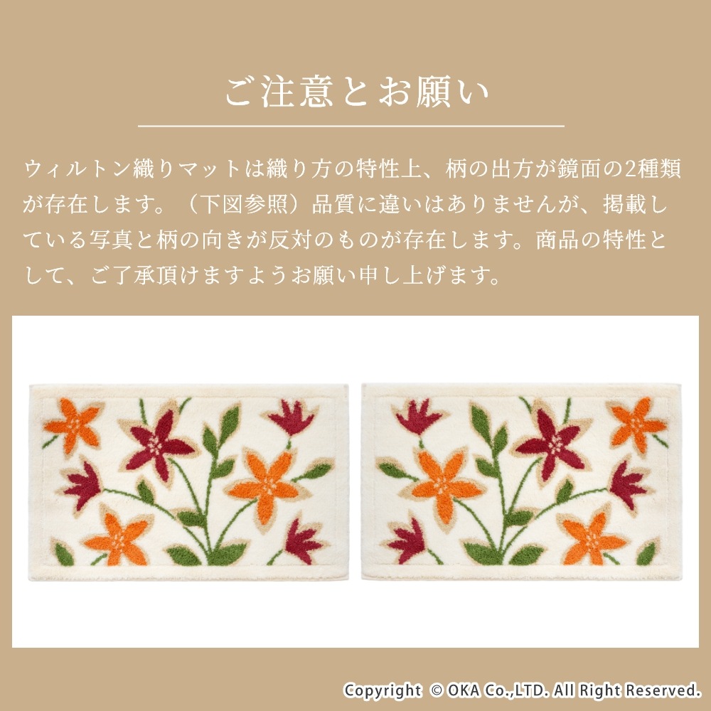 マット一面に鮮やかな色合いの花柄が描かれた玄関マット「パシオーネ」。華やかな花柄デザインで足元をパッと彩り、玄関を通るたびに明るい気持ちになります。一目ひとめ、しっかり丁寧に織り込まれた上質な日本製ウィルトン織りマットです。ウィルトン織りは耐久性に優れ、復元力にも優れているので、洗濯を繰り返してもへたれにくくなっています。マットの細部の縫製までこだわり、毛羽立ちが少ないのが特徴です。扱いやすく薄手でしっかりしたマットですので、玄関だけでなく、ベットサイドやソファ前などのインテリアとしてもお使いいただけます。 裏面の四隅には吸着シートがついているので、人がよく行き来する玄関に敷いてもズレにくく、掃除機をかけてもめくり上がりにくいのが嬉しいポイントです。