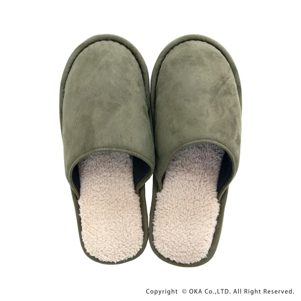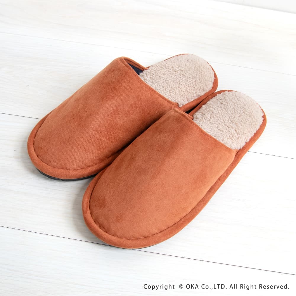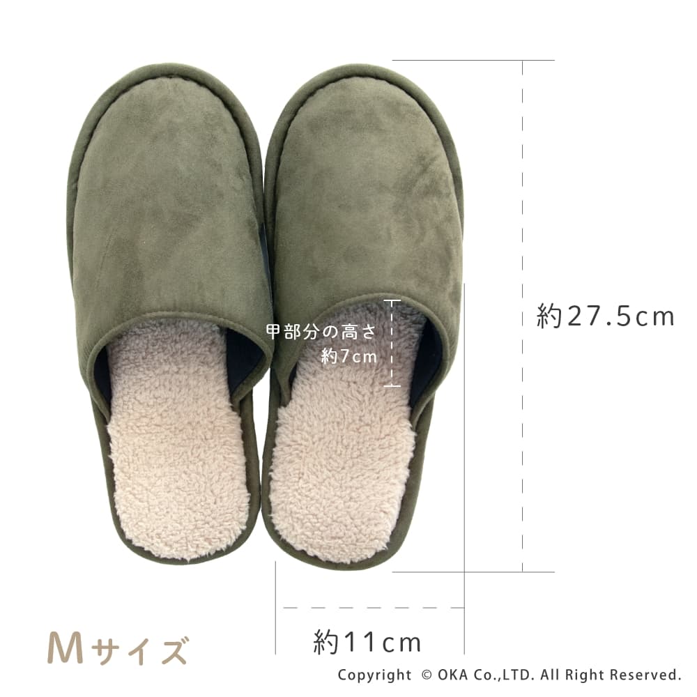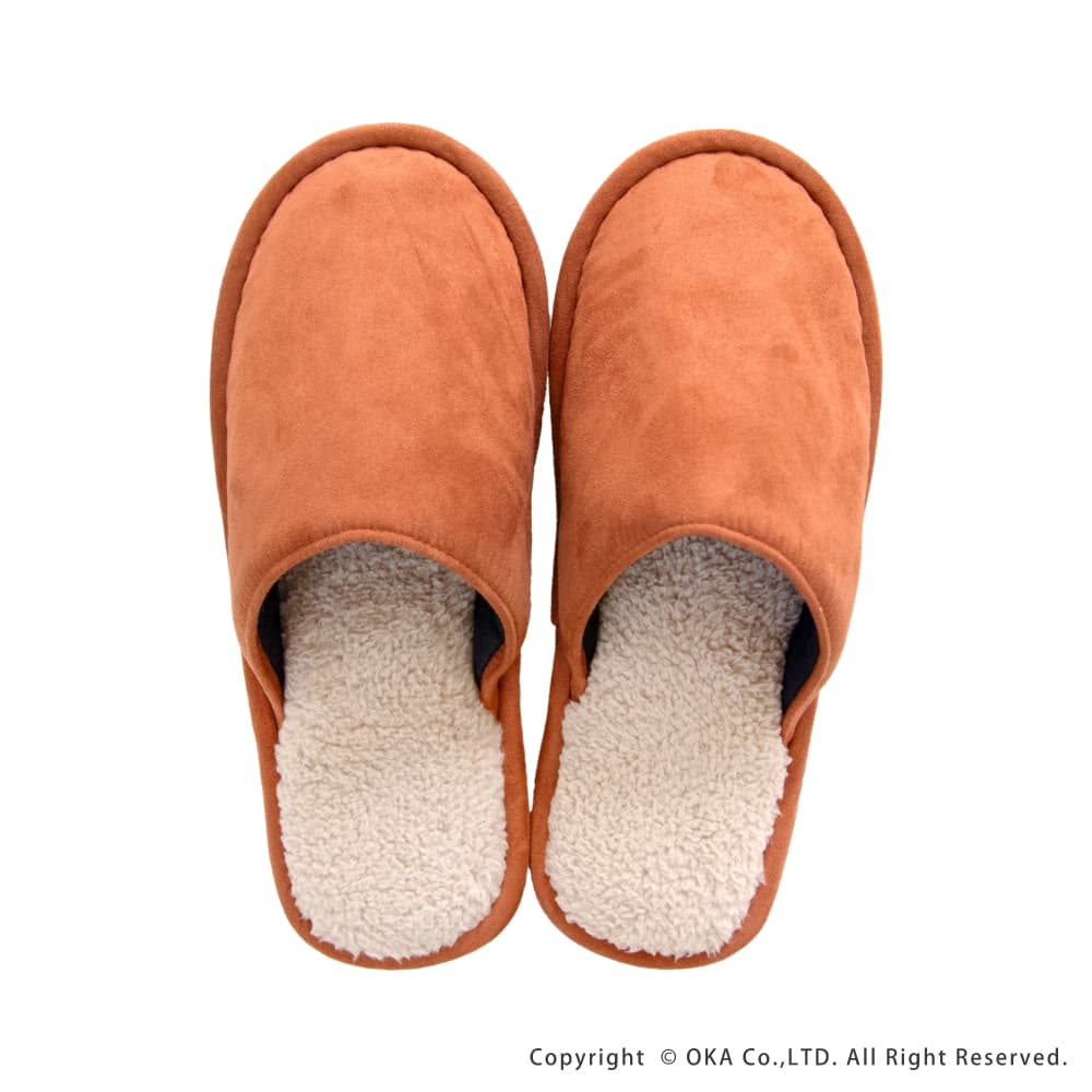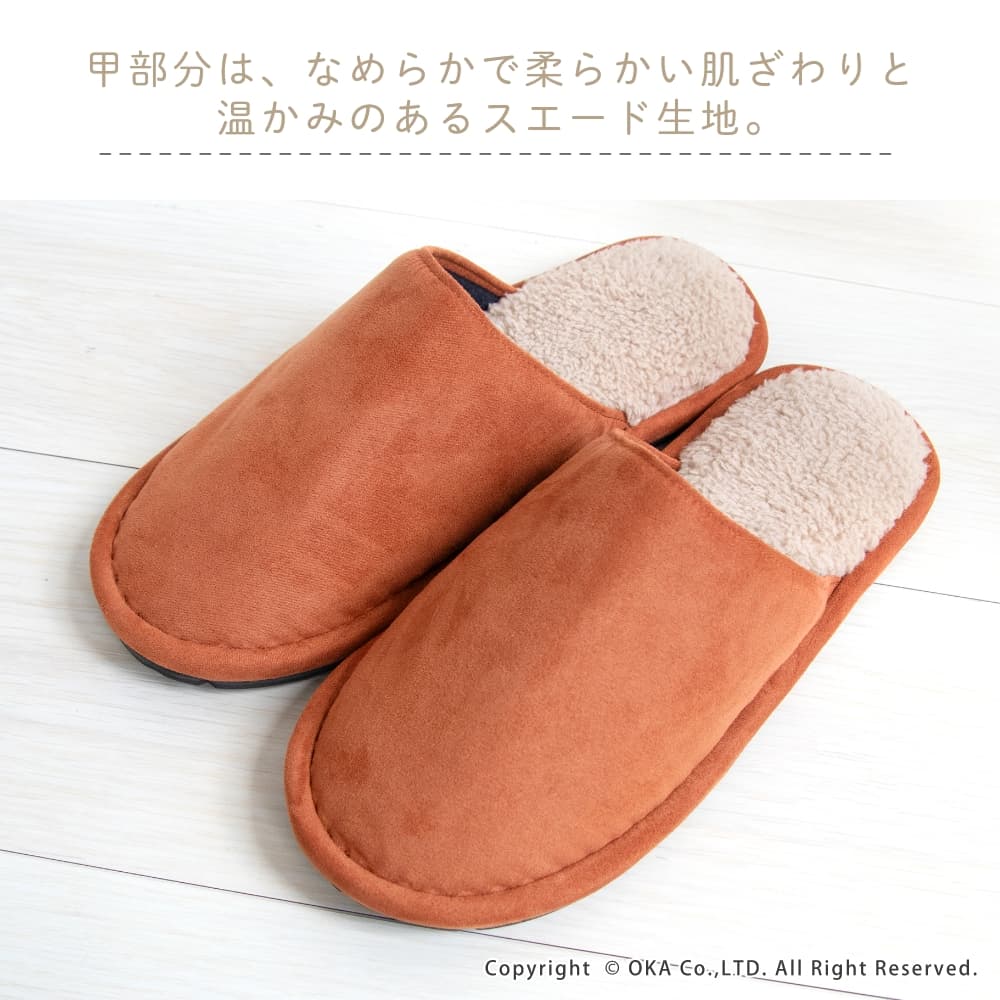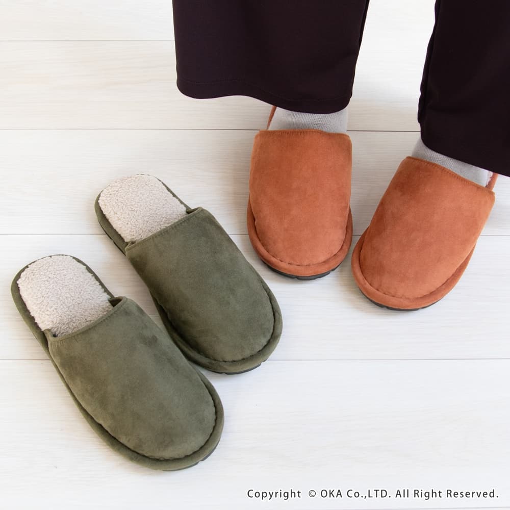 なめらかスエード&ふかふかボアの洗える室内用スリッパ。 中敷き部分は、ボアのふかふかでクッション性のある履き心地で足元をあったかく、冷えが気になる冬の季節にぴったりです。 甲部分は、なめらかで柔らかい肌ざわりと温かみのあるスエード生地で高級感も感じられるデザインです。 細部まで丁寧な縫製仕上げの日本製、洗濯ネットに入れて、洗濯機で丸洗いもできます。 ほっこり落ち着きあるオレンジとグリーンのカラーリングになっています。 サイズは、Mサイズの他にLサイズ(ブラウンカラー)もご用意しておりますので、お揃いにお使いいただけます。 シンプルでおしゃれなデザインはギフトにもピッタリ。新築や引っ越しのお祝いギフトにもおすすめです。