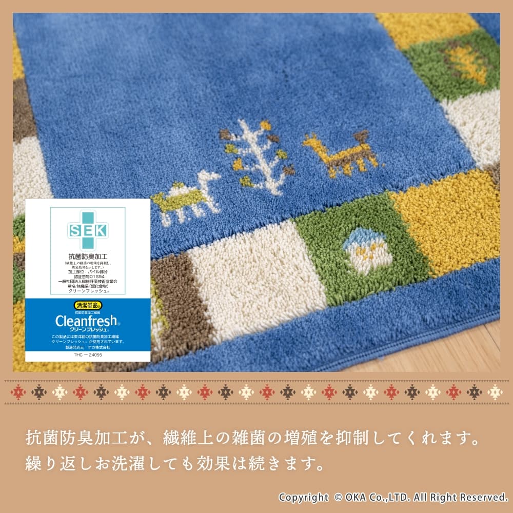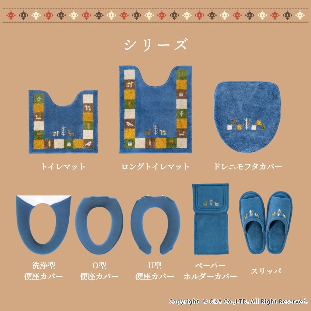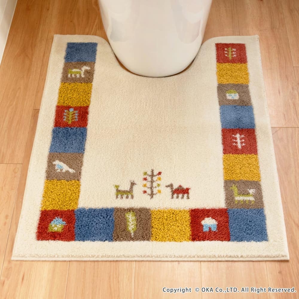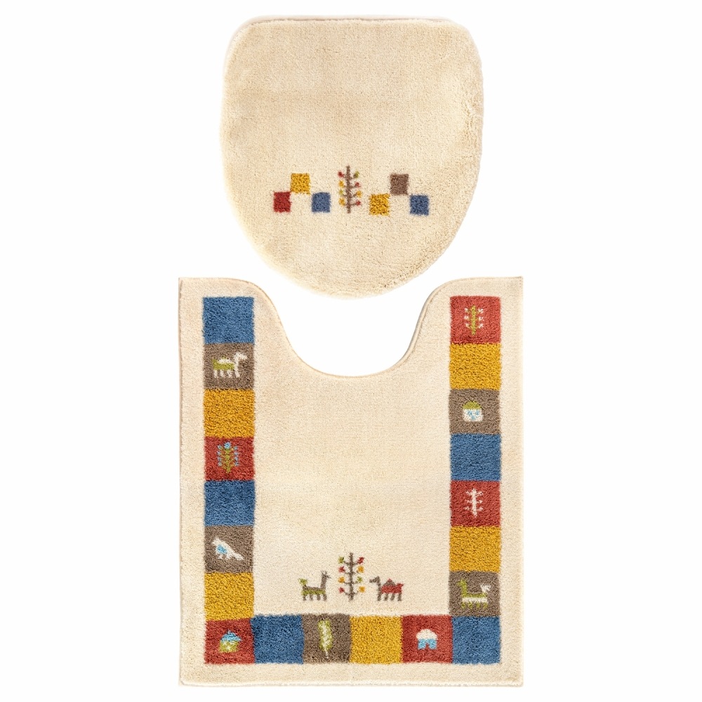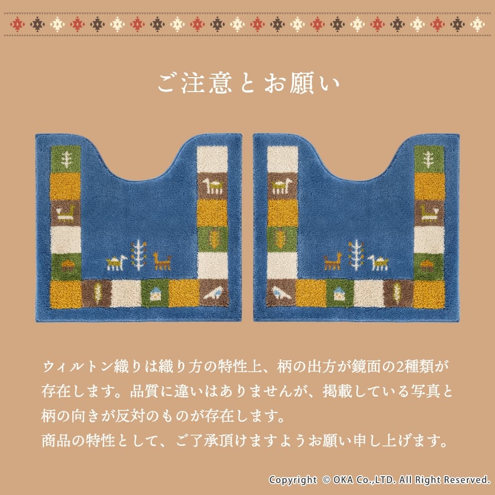 繊細な柄が表現でき、毛立ちがいい、日本製のウィルトン織りでできています。洗濯ネットに入れて丸洗いできるので、お手入れが簡単です。空をイメージしたブルー、自然の大地をイメージしたベージュで、トイレ空間をエスニックテイストで彩ってくれます。