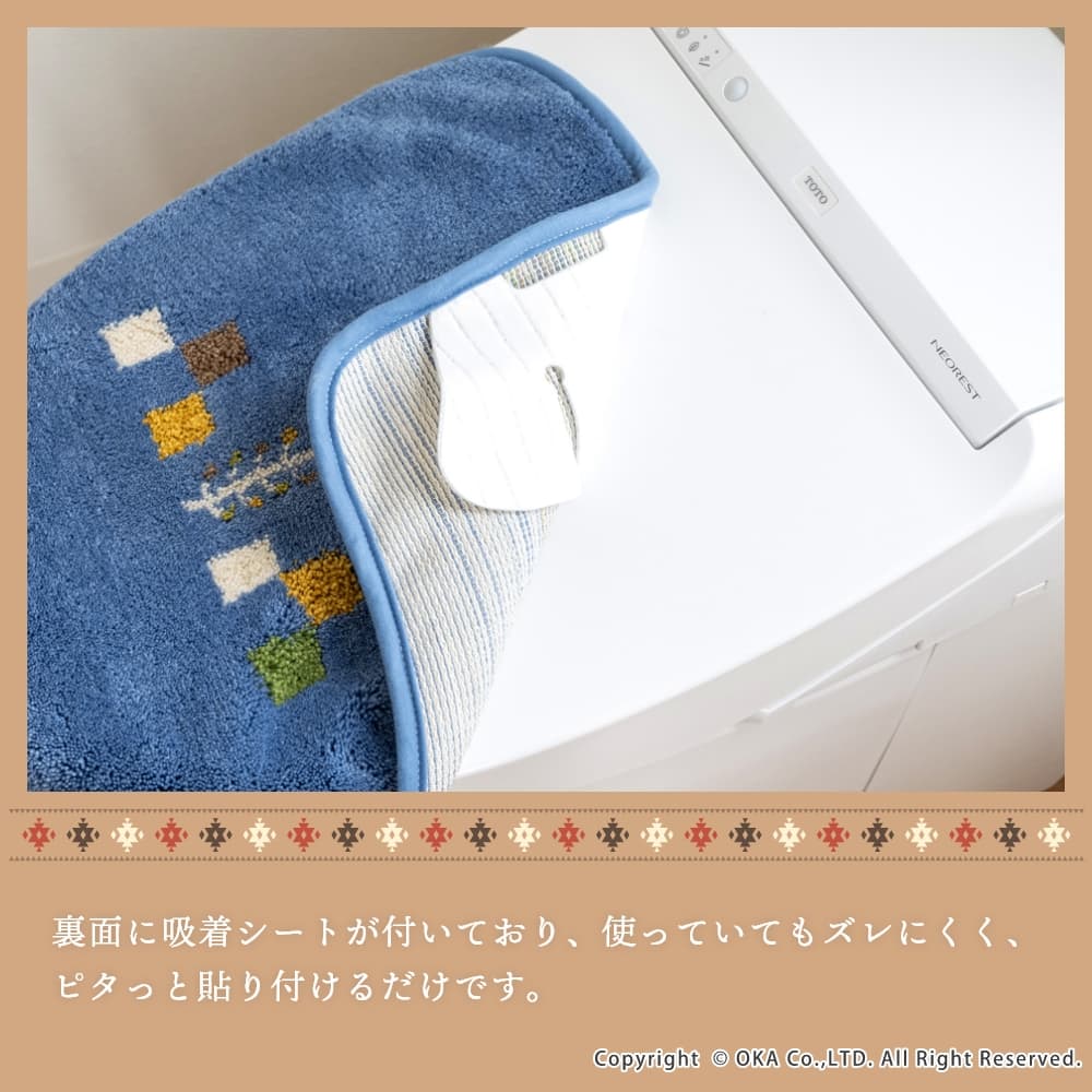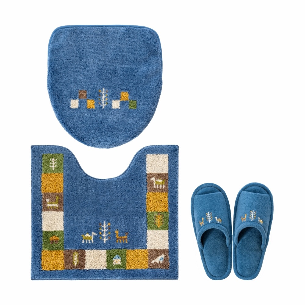 トイレマットとフタカバーは、繊細な柄が表現でき、毛立ちがいい、日本製のウィルトン織りでできています。どのアイテムも洗濯ネットに入れて丸洗いできるので、お手入れが簡単です。空をイメージしたブルー、自然の大地をイメージしたベージュで、トイレ空間をエスニックテイストで彩ってくれます。